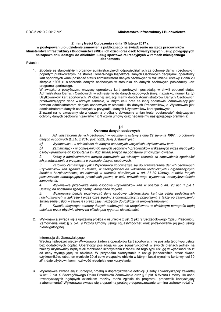 BDG.5.2510.2.2017.MK Ministerstwo Infrastruktury i Budownictwa Zmiany treści Ogłoszenia z dnia 15 lutego 2017 r. w postępowaniu o udzielenie zamówienia publicznego na świadczenie na rzecz pracowników Ministerstwa Infrastruktury i Budownictwa (MIB), ich dzieci oraz osób towarzyszących usług polegających na zapewnieniu dostępu do obiektów i usług sportowo-rekreacyjnych w ramach miesięcznego abonamentu Pytania : 1. Zgodnie ze stanowiskiem organów administracyjnych odpowiedzialnych za ochronę danych osobowych popartym publikowanymi na stronie Generalnego Inspektora Danych Osobowych decyzjami, operatorzy kart sportowych winni posiadać status administratora danych osobowych w rozumieniu ustawy z dnia 29 sierpnia 1997 r. o ochronie danych osobowych w stosunku do danych osobowych posiadaczy kart programu sportowego. W związku z powyższym, wszyscy operatorzy kart sportowych posiadają, w chwili obecnej status Administratora Danych Osobowych w odniesieniu do danych osobowych (imię, nazwisko, numer karty) Użytkowników kart sportowych. W obecnej sytuacji mamy dwóch Administratorów Danych Osobowych przetwarzających dane w różnym zakresie, w innym celu oraz na innej podstawie. Zamawiający jest bowiem administratorem danych osobowych w stosunku do danych Pracowników, a Wykonawca jest administratorem danych osobowych w przypadku danych Użytkowników kart sportowych. Z uwagi na to zwracamy się z uprzejmą prośbą o dokonanie zmian treści postanowień dotyczących ochrony danych osobowych zawartych § 9 wzoru umowy oraz nadanie mu następującego brzmienia: §9 Ochrona danych osobowych 1. Administratorem danych osobowych w rozumieniu ustawy z dnia 29 sierpnia 1997 r. o ochronie danych osobowych (Dz.U. z 2016 poz. 922), dalej „Ustawa" jest: a) Wykonawca - w odniesieniu do danych osobowych wszystkich użytkowników kart; b) Zamawiający - w odniesieniu do danych osobowych pracowników wskazanych przez niego jako osoby uprawnione do korzystania z usług świadczonych na podstawie umowy/zamówienia. 2. Każdy z administratorów danych odpowiada we własnym zakresie za zapewnienie zgodności ich przetwarzania z przepisami o ochronie danych osobowych. 3. Zarówno Zamawiający jak i Wykonawca zobowiązują się do przetwarzania danych osobowych użytkowników kart zgodnie z Ustawą, w szczególności do wdrożenia technicznych i organizacyjnych środków bezpieczeństwa, co najmniej w zakresie określonym w art. 36-39 Ustawy, a także innych powszechnie obowiązujących przepisach prawa, w celu prawidłowego wykonania umowy/przedmiotu zamówienia. 4. Wykonawca przetwarza dane osobowe użytkowników kart w oparciu o art. 23 ust. 1 pkt 1 Ustawy, na podstawie zgody osoby, której dane dotyczą. 5. Wykonawca będzie przetwarzać dane osobowe użytkowników kart dla celów podatkowych i rachunkowych w zakresie i przez czas zgodny z obowiązującymi przepisami, a także po zakończeniu świadczenia usług w zakresie i przez czas niezbędny do rozliczenia umowy/zamówieni. 6. Kwestie dotyczące ochrony danych osobowych nie uregulowane w niniejszym paragrafie będą ustalane przez obydwie strony na piśmie pod rygorem nieważności. 2. Wykonawca zwraca się z uprzejmą prośbą o usunięcie z ust. 2 pkt. 9 Szczegółowego Opisu Przedmiotu Zamówienia oraz § 2 pkt. 9 Wzoru Umowy usługi squash/ricochet oraz potraktowanie jej jako usługi nieobligatoryjnej. Informacja dla Zamawiającego: Według najlepszej wiedzy Wykonawcy żaden z operatorów kart sportowych nie posiada tego typu usługi bez dodatkowych dopłat. Operatorzy posiadają usługę squash/ricochet w swoich ofertach jednak na zmiany użytkownicy będą mieli możliwość skorzystania z rabatu na tego typu usługę w wysokości 15 zł od ceny występującej w obiekcie. W przypadku skorzystania z usługi jednocześnie przez dwóch użytkowników, rabat ten wyniesie 30 zł co w przypadku obiektu w którym koszt wynajmu kortu wynosi 30 zł/h, daje użytkownikom możliwość nieodpłatnego korzystania. 3. Wykonawca zwraca się z uprzejmą prośbą o doprecyzowanie definicji „Osoby Towarzyszącej" zawartej w ust. 2 pkt. 9 Szczegółowego Opisu Przedmiotu Zamówienia oraz § 2 pkt. 5 Wzoru Umowy. Ile osób towarzyszących będących członkiem rodziny może zgłosić do programu pracownik korzystający z abonamentu? Wykonawca zwraca się z uprzejmą prośbą o doprecyzowanie terminu „członek rodziny" występującej w wyżej wymienionej definicji. Informacja dla Zamawiającego: Zgodnie ze praktyką rynkową stosowaną przez operatorów kart sportowych w Polsce, każdy pracownik korzystający z abonamentu ma możliwość zgłoszenia jednej osoby towarzyszącej (bez względu na to czy dana osoba jest członkiem rodziny czy też nim nie jest) oraz wszystkich dzieci (własnych lub przysposobionych) pozostających na utrzymaniu Pracownika, które nie ukończyły 15 roku życia. W związku z pytaniem nr 1 Wykonawcy, Zamawiający dokonał następujących zmian: Zamawiający zmienia treść § 9 wzoru Umowy, (stanowiącego Załącznik nr 2 do OGŁOSZENIA O ZAMÓWIENIU). przed zmianą: § 9 Ochrona Danych Osobowych 1. Zamawiający udostępnia Wykonawcy, w rozumieniu ustawy z dnia 29 sierpnia 1997 r. o ochronie danych osobowych (Dz. U. z 2016 r. poz. 922), dane osobowe Użytkowników w zakresie i celu związanym z realizacją Umowy. 2. Dane osobowe mogą być przetwarzane wyłącznie w celu wykonywania zawartej pomiędzy stronami Umowy oraz w zakresie niezbędnym do wykonania przez Wykonawcę obowiązków wynikających z tej Umowy. Przetwarzanie danych osobowych jest nieodpłatne. 3. Wykonawca oświadcza, że znane mu są przepisy prawa regulującego przetwarzanie danych osobowych zawarte w ustawie o ochronie danych osobowych i wynikających z niej aktów wykonawczych oraz zobowiązuje się do ich przestrzegania. 4. Wykonawca zobowiązuje się do przetwarzania danych osobowych z zachowaniem szczególnej staranności w celu ochrony interes