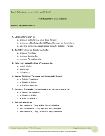 Egzamin dla kandydatów na przewodników górskich klasa III Beskidy Zachodnie część zachodnia przykład — część pisemna (wersja D) 1. „Brama Morawska” to: a. przełom rzeki Morawy przez Białe Karpaty, b. przełęcz, oddzielająca Beskid Śląsko–Morawski od Jaworników, c. szerokie obniżenie, rozdzielające łańcuchy Sudetów i Karpat. 2. Beskid Żywiecki od Gorców oddziela: a. przełęcz Przysłop, b. przełęcz Sieniawska, c. przełęcz Pieniążkowicka. 3. Najwyższy szczyt Beskidu Wyspowego to: a. Luboń Wielki, b. Mogielica, c. Lubogoszcz. 4. Łysina, Ponikiew, Targanice to miejscowości leżące: a. w Paśmie Pewelskim, b. w Beskidzie Małym, c. w Pogórzu Wielickim. 5. Jarmuta, Durbaszka, Szafranówka to szczyty wznoszące się: a. w Górach Kaczawskich, b. w Beskidzie Niskim, c. w Małych Pieninach. 6. Tatry dzielą się na: a. Tatry Wysokie, Tatry Niskie, Tatry Zachodnie, b. Tatry Zachodnie, Tatry Wysokie, Tatry Bielskie, c. Tatry Wysokie, Tatry Zachodnie, Tatry Orawskie. Oddział Międzyuczelniany PTTK w Warszawie http://szkolenia.om.pttk.pl Opracowano na podstawie materiałów udostępnionych przez urzędy wojewódzkie 1 przykład Egzamin dla kandydatów na przewodników górskich klasa III — Beskidy Zachodnie część zachodnia 7. Rzeka Skawa bierze początek: a. w Paśmie Podhalańskim, b. w Paśmie Jałowieckim, c. w Gorcach. 8. Pasmo Żurawnicy i Gołuszkowej Góry rozciąga się między: a. Makowem Podhalańskim a Zembrzycami, b. Pewlą Wielką a Stryszawą, c. Krzeszowem a Suchą Beskidzką. 9. Najwyższą dostępną komunikacyjnie przełęczą spośród niżej wymienionych jest: a. przełęcz Glinne, b. przełęcz Salmopolska, c. przełęcz Kocierska. 10. Dział wodny między zlewiskami Soły i Skawy przebiega przez: a. przełęcz Klekociny, Jałowiec, Cichą, Wytrzyszczon, b. Lasek, Czerniawę Suchą, Lachów Groń, Wytrzyszczon, c. przełęcz Klekociny, Jałowiec, przełęcz Opaczne, Solniska. 11. Droga wiodąca przez przełęcz Glinne łączy Żywiecczyznę: a. z Kisucami, b. z Orawą, c. z Podhalem. 12. Przełęcz Tylicka rozdziela: a. Beskid Sądecki i Pieniny, b. Pasma Radziejowej i Jaworzyny Krynickiej, c. Beskid Sądecki i Beskid Niski. 13. Babiogórski Park Narodowy został utworzony w roku: a. 1923, b. 1938, c. 1954. 14. Dział wodny między zlewiskami Bałtyku i Morza Czarnego przebiega przez przełęcze: a. Krowiarki (Lipnicką), Zubrzycką, Sieniawską, b. Zubrzycką, Bory (Spytkowicką), Sieniawską, c. Krowiarki (Lipnicką), Zubrzycką, Bory (Spytkowicką). 2 http://szkolenia.om.pttk.pl Oddział Międzyuczelniany PTTK w Warszawie Opracowano na podstawie materiałów udostępnionych przez urzędy wojewódzkie Egzamin dla kandydatów na przewodników górskich klasa III — Beskidy Zachodnie część zachodnia przykład 15. Żabnica, Juszczynka i Leśna to dopływy: a. Soły, b. Skawy, c. Raby. 16. Endemity Babiej Góry to: a. róża alpejska, b. kuklik górski i sasanka alpejska, c. okrzyn jeleni i rogownica alpejska. 17. Aleksander Janowski to postać związana z: a. Polskim Towarzystwem Tatrzańskim, b. Polskim Towarzystwem Turystyczno–Krajoznawczym, c. Polskim Towarzystwem Krajoznawczym. 18. Za początek zorganizowanego przewodnictwa górskiego w Polsce uznawany jest rok: a. 1875, b. 1901, c. 1873. 19. Inicjatorem wyznakowania Głównego Szlaku Beskidzkiego był: a. Hugon Zapałowicz, b. Mieczysław Orłowicz, c. Kazimierz Sosnowski. 20. Polskie Towarzystwo Tatrzańskie powstało w roku: a. 1883, b. 1873, c. 1920. 21. Autorem dzieła „Dziejopis Żywiecki” jest: a. Krzysztof Komorowski, b. Andrzej Komoniecki, c. Jan Wielopolski. 22. Jan Sztwiertnia, Stanisław Hadyna, Wojciech Kilar to: a. kompozytorzy uwzględniający w swoich utworach elementy muzyki ludowej Karpat, b. poeci, tworzący w latach międzywojennych grupę „Czartak”, c. malarze, skupieni w Ustroniu w grupie „Brzimy”. Oddział Międzyuczelniany PTTK w Warszawie http://szkolenia.om.pttk.pl.pl Opracowano na podstawie materiałów udostępnionych przez urzędy wojewódzkie 3 przykład Egzamin dla kandydatów na przewodników górskich klasa III — Beskidy Zachodnie część zachodnia 23. Wawrzyniec Szkolnik to: a. autor przewodnika po Ziemi Żywieckiej, b. pierwszy oficjalny przewodnik po Babiej Górze, c. gospodarz schroniska na Markowych Szczawinach. 24. Baków, Gachowizna, Wajdów Groń to szczyty w: a. Pogórzu Cieszyńskim, b. Paśmie Pawelskim, c. Beskidzie Niskim. 25. Charakterystycznymi cechami klimatu górskiego są: a. wiatry wiejące wzdłuż dolin, duże nasłonecznienie, znaczne opady śniegu, b. bardzo częste gwałtowne zmiany pogody, duża suma opadów w miesiącach letnich, silne wiatry, duże różnice temperatur między dniem a nocą, c. stabilna pogoda, dłuższe noce, wiatry z kierunków południowych. 26. Unieruchomienie złamanej kończyny polega na: a. unieruchomieniu stawu bliższego w stosunku do miejsca złamania, b. unieruchomieniu 2 sąsiednich stawów w obrębie złamania, c. unieruchomieniu większego stawu w obrębie złamania. 27. „Stara Chałupa” — filia muzeum w Żywcu z ekspozycją przedstawiającą kulturę materialną wsi żywieckiej znajduje się: a. w Ujściach, b. w Milówce, c. w Gilowicach. 28. Zabytkowy dwór sołtysów orawskich Moniaków znajduje się: a. w Orawce, b. w Podwilku, c. w Zubrzycy Górnej. 29. Osadnictwo wołoskie pojawiło się na obszarze Beskidów Zachodnich w wieku: a. XIII, b. XV i XVI, c. XVII. 30. Okres szczytowego rozwoju renesansu w sztuce przypada w Polsce na: a. wiek XV, b. wiek XVI, c. drugą połowę XVII wieku. 4 http://szkolenia.om.pttk.pl Oddział Międzyuczelniany PTTK w Warszawie Opracowano na podstawie materiałów udostępnionych przez urzędy wojewódzkie