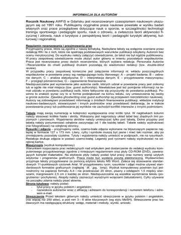 INFORMACJA DLA AUTORÓW Rocznik Naukowy AWFiS w Gdańsku jest recenzowanym czasopismem naukowym ukazującym się od 1991 roku. Publikujemy oryginalne prace naukowe powstałe w wyniku badań własnych oraz prace przeglądowe dotyczące nauk o sporcie, w szczególności technologii treningu sportowego i pedagogiki sportu, nauk o zdrowiu, a zwłaszcza teorii aktywności fizycznej i zdrowia, nauk o turystyce z perspektywą teorii i pedagogiki turystyki aktywnej, kulturowej i regionalnej. Regulamin recenzowania i przyjmowania prac Przyjmujemy prace, które są zgodne z naszą tematyką. Nadsyłane teksty są wstępnie oceniane przez redakcję RN i te z nich, które nie spełniają podstawowych warunków publikacji odsyłamy Autorom bez oceny merytorycznej. Do wydruku należy załączyć oświadczenie, że tekst nie był nigdzie publikowany. W pracy zespołowej oświadczenie może złożyć autor główny w imieniu pozostałych współautorów. Praca jest recenzowana przez dwóch recenzentów, których wybiera redakcja. Personalia Autorów i Recenzentów do chwili publikacji drukiem pozostają do wiadomości redakcji (tzw. double-blind review). W przypadku pracy zespołowej konieczne jest załączenie informacji nt. wkładu poszczególnych współautorów w powstanie pracy wg następującego kodu literowego: A – projekt badania; B – zebranie danych; C – analiza statystyczna; D – interpretacja danych; E – przygotowanie maszynopisu; F – przegląd piśmiennictwa; G – zapewnienie finansowania. Niedopuszczalne jest wymienianie jako autorów osób, których udział w powstanie pracy jest znikomy lub w ogóle nie miał miejsca (tzw. guest authorship). Niewłaściwe jest też pomijanie informacji na temat udziału w powstaniu publikacji osób, które faktycznie się przyczyniły do powstania publikacji. Powinno to znaleźć wyraz czy to w formie podziękowań na końcu tekstu, czy umieszczenia tej osoby w gronie autorów. Zjawiska ghostwriting oraz guest authorship są przejawem nierzetelności naukowej. Autorzy są zobowiązani przedstawić informację o źródłach finansowania publikacji, wkładzie instytucji naukowo-badawczych, stowarzyszeń i innych podmiotów oraz przedstawić deklarację, że w trakcie powstawania pracy lub publikowania jej wyników nie zachodził konflikt interesów z innymi podmiotami. Tabele mają swoją numerację w kolejności występowania oraz krótki tytuł. W nagłówkach kolumn należy stosować krótkie hasła i skróty. Wskazany jest najprostszy układ tabel bez zbędnych linii poziomych i pionowych. Wyjaśnienia skrótów należy umieszczać tylko pod tabelą. Dolne przypisy pod tabelą należy ponumerować odrębnie zaczynając od 1 dla każdej tabeli. Tabele należy wydrukować (nie fotografować) na odrębnej stronicy. Rysunki i zdjęcia – przyjmujemy ostre, czarno-białe zdjęcia wykonane na błyszczącym papierze najlepiej w formacie 127 x 173 mm. Litery, cyfry i symbole muszą być jasne i mieć taki rozmiar, aby po zmniejszeniu pozostały czytelne. Tytuły i wyjaśnienia należy umieścić w podpisach, nie na rysunkach. Redakcja drukuje zdjęcia w postaci czarno-białej. Legendy pod rycinami należy wydrukować na odrębnej kartce. Maszynopis (wydruk komputerowy) Warunkiem rozpoczęcia prac redakcyjnych nad artykułem jest dostarczenie do redakcji wydruku komputerowego przygotowanego zgodnie z niniejszym regulaminem oraz płyty CD-ROM (DVD), zawierających komplet materiałów. Na etykiecie płyty należy podać tytuł pracy oraz numery wersji użytych edytorów i programów graficznych. Praca może być wysłana pocztą elektroniczną. Wydawnictwo przyjmuje teksty przygotowane za pomocą edytora tekstu MS Word. Zaleca się stosowanie standardowych 11-punktowych czcionek Arial. W przygotowaniu rycin, rysunków i zdjęć można używać standardowych formatów graficznych (najlepiej ‘.tif, ‘.jpg, ‘.bmp). Wydruk komputerowy powinien być jednostronny na papierze formatu A-4 i nie przekraczać 20 stron, pisany z odstępem 1,5 między wierszami, marginesami 2,5 cm z każdej ze stron. Niedopuszczalne są wszelkie wyróżnienia tekstu (pogrubienia i pochylenia). Akapity należy zaznaczyć wyraźnymi wcięciami (tabulatorem). Cyfry używane na początku zdania należy pisać słownie. Strona tytułowa: należy podać: - tytuł pracy w języku polskim i angielskim; - nazwisko/a autora/ów wraz z afiliacją i adresem do korespondencji i numerem telefonu i adresem e-mail. Streszczenie Przed tekstem głównym należy umieścić streszczenie w języku polskim i angielskim, (nie więcej niż 250 słów), a pod nim 3 – 6 słów kluczowych (wg stylu MeSH). Streszczenie prac badawczych ma następującą strukturę: wstęp, materiał i metody, wyniki, wnioski. Układ tekstu Tekst należy podzielić na podane niżej działy. Wprowadzenie (wstęp) obejmuje naukowe uzasadnienie tematu, wyjaśnienie celu badań i głównej tezy badawczej. Materiał i metody: podać materiał badawczy, czas i metody prowadzenia badań oraz wykorzystane narzędzia badawcze i aparaturę. Metodę zastosowaną pierwszy raz należy opisać precyzyjnie, zaś sposób wykonywania pomiarów przedstawić tak, aby inne osoby mogły je powtórzyć. Autorzy powinni uzasadnić stosowanie nowych, nieznanych metod i ocenić je. Należy opisać szczegółowo zastosowane metody statystyczne, aby można było stwierdzić, czy są one poprawne. Wyniki powinny się wiązać z danymi zamieszczonymi w tabelach i na rycinach. Liczbę tabel i rysunków należy ograniczyć do niezbędnych, zaś dane w nich zawarte nie powinny być ponownie omawiane w tekście. Dyskusja wyników: powinna dotyczyć tylko nowych i/lub ważnych aspektów bez powtarzania w szczegółach informacji przedstawionych wcześniej we Wprowadzeniu lub Wynikach. Dyskusja powinna koncentrować się na implikacjach teoretycznych i/lub praktycznych wyników, w tym propozycjach dalszych badań. W Dyskusji należy porównać wyniki p