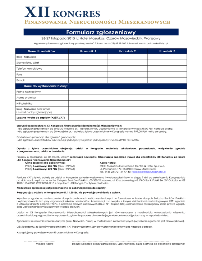 Formularz zgłoszeniowy 26-27 listopada 2015 r.; Hotel Mazurkas, Ożarów Mazowiecki k. Warszawy Wypełniony formularz zgłoszeniowy prosimy przesłać faksem na nr (22) 48 68 100 lub email: [email protected] Dane Uczestników: Uczestnik 1 Uczestnik 2 Uczestnik 3 Imię i Nazwisko Stanowisko, dział Telefon kontaktowy Faks E-mail Dane do wystawienia faktury: Pełna nazwa firmy Adres płatnika NIP płatnika Imię i Nazwisko oraz nr tel. i e-mail osoby zgłaszającej Łączna kwota do zapłaty (+23%VAT) Warunki uczestnictwa w XII Kongresie Finansowania Nieruchomości Mieszkaniowych: - dla zgłoszeń przesłanych do dnia 30 września br.- opłata z tytułu uczestnictwa w Kongresie wynosi 649,00 PLN netto za osobę, - dla zgłoszeń przesłanych po 30 września br. - opłata z tytułu uczestnictwa w Kongresie wynosi 999,00 PLN netto za osobę. Dodatkowo promocja dla zgłoszeń grupowych: - dla zgłoszeń 4 uczestników lub więcej z jednej instytucji koszt jednej osoby wynosi 649,00 PLN netto. Opłata z tytułu uczestnictwa obejmuje: z programem oraz, udział w bankiecie. udział w Kongresie, materiały szkoleniowe, poczęstunek, wyżywienie zgodnie Prosimy o zgłaszanie się do hotelu celem rezerwacji noclegów. Obowiązują specjalne stawki dla uczestników XII Kongresu na hasło „XII Kongres Finansowania Nieruchomości”: Cena za pokój dla gości wynosi: Adres Hotelu: Pokój 1-osobowy: 235 PLN (plus +8%VAT) MCC Mazurkas Conference Centre & Hotel Sp. z o.o. Pokój 2-osobowy: 270 PLN (plus +8%VAT) ul. Poznańska 177, 05-850 Ożarów Mazowiecki tel.: (+48 22) 721 47 47-49; [email protected] Faktura VAT z tytułu opłaty za udział w Kongresie zostanie wystawiona i wysłana płatnikowi w ciągu 7 dni po zakończeniu Kongresu lub po dokonaniu wpłaty na konto: Związek Banków Polskich, 00-380 Warszawa, ul. Kruczkowskiego 8, PKO Bank Polski SA. XV Oddział nr 02 1020 1156 0000 7202 0008 6215 z dopiskiem „XII Kongres” w tytule płatności. Nadesłanie zgłoszenia jest jednoznaczne ze zobowiązaniem do zapłaty. Rezygnacja z udziału w Kongresie po 01.11.2015r. nie powoduje zwolnienia z opłaty. Wyrażamy zgodę na umieszczenie danych osobowych osób wymienionych w formularzu w bazie danych Związku Banków Polskich i wykorzystywanie ich przy organizacji szkoleń, seminariów, konferencji i w związku z innymi działaniami marketingowymi ZBP, zgodnie z ustawą z dnia 29 sierpnia 1997 r. o ochronie danych osobowych (Dz.U. Nr 133 poz. 883).Jednocześnie zastrzegamy sobie prawo wglądu oraz uaktualniania umieszczonych w bazie danych. Udział w XII Kongresie Finansowania Nieruchomości Mieszkaniowych jest równoznaczny z możliwością wykorzystania wizerunku uczestnika biorącego udział w wydarzeniu, głównie poprzez utrwalenie jego wizerunku na zdjęciach czy w reportażu video. Zgadzamy się na umieszczenie danych (Imię, Nazwisko, Firma) w materiałach konferencyjnych (wyrażenie zgody nie jest obowiązkowe). Oświadczamy, że jesteśmy podatnikami VAT i upoważniamy ZBP do wystawienia faktury bez naszego podpisu. Akceptujemy powyższe warunki uczestnictwa w Kongresie. ……………………………… miejsce i data …………………………………………………………………………………………………… podpis i pieczęć osoby zgłaszającej, upoważnionej przez płatnika do dokonania zgłoszenia
