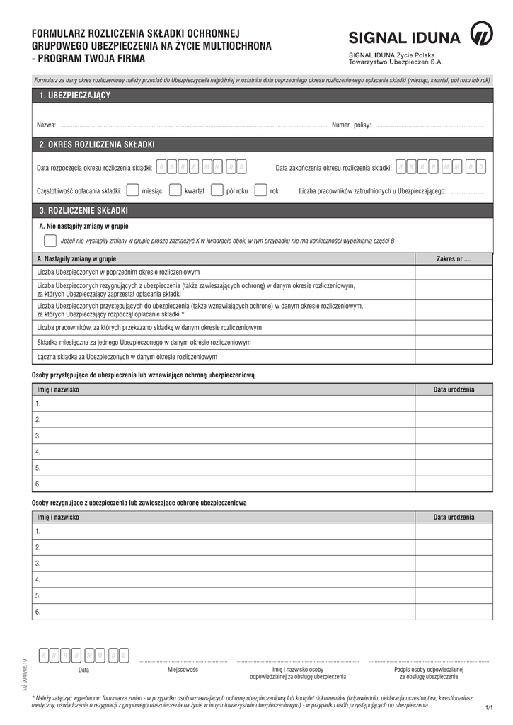 FORMULARZ ROZLICZENIA SKŁADKI OCHRONNEJ GRUPOWEGO UBEZPIECZENIA NA ŻYCIE MULTIOCHRONA - PROGRAM TWOJA FIRMA Formularz za dany okres rozliczeniowy należy przesłać do Ubezpieczyciela najpóźniej w ostatnim dniu poprzedniego okresu rozliczeniowego opłacania składki (miesiąc, kwartał, pół roku lub rok) 1. UBEZPIECZAJĄCY Nazwa: ........................................................................................................................................................... Numer polisy: ................................................................ 2. OKRES ROZLICZENIA SKŁADKI Data rozpoczęcia okresu rozliczenia składki: Częstotliwość opłacania składki: R R miesiąc R R M M kwartał D D R R Data zakończenia okresu rozliczenia składki: pół roku rok R R M M D D Liczba pracowników zatrudnionych u Ubezpieczającego: .................... 3. ROZLICZENIE SKŁADKI A. Nie nastąpiły zmiany w grupie Jeżeli nie wystąpiły zmiany w grupie proszę zaznaczyć X w kwadracie obok, w tym przypadku nie ma konieczności wypełniania części B A. Nastąpiły zmiany w grupie Zakres nr .... Liczba Ubezpieczonych w poprzednim okresie rozliczeniowym Liczba Ubezpieczonych rezygnujących z ubezpieczenia (także zawieszających ochronę) w danym okresie rozliczeniowym, za których Ubezpieczający zaprzestał opłacania składki Liczba Ubezpieczonych przystępujących do ubezpieczenia (także wznawiających ochronę) w danym okresie rozliczeniowym, za których Ubezpieczający rozpoczął opłacanie składki * Liczba pracowników, za których przekazano składkę w danym okresie rozliczeniowym Składka miesięczna za jednego Ubezpieczonego w danym okresie rozliczeniowym Łączna składka za Ubezpieczonych w danym okresie rozliczeniowym Osoby przystępujące do ubezpieczenia lub wznawiające ochronę ubezpieczeniową Imię i nazwisko Data urodzenia 1. 2. 3. 4. 5. 6. Osoby rezygnujące z ubezpieczenia lub zawieszające ochronę ubezpieczeniową Imię i nazwisko Data urodzenia 1. 2. 3. 4. 5. SIŻ 0041/02.10 6. R R R R M M Data D D ........................................................... ................................................................................. ................................................................................ Miejscowość Imię i nazwisko osoby odpowiedzialnej za obsługę ubezpieczenia Podpis osoby odpowiedzialnej za obsługę ubezpieczenia * Należy załączyć wypełnione: formularze zmian - w przypadku osób wznawiajacych ochronę ubezpieczeniową lub komplet dokumentów (odpowiednio: deklaracja uczestnictwa, kwestionariusz medyczny, oświadczenie o rezygnacji z grupowego ubezpieczenia na życie w innym towarzystwie ubezpieczeniowym) - w przypadku osób przystępujących do ubezpieczenia. 1/1