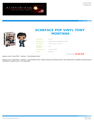 Aliens Group ul. Lipowa 17C Inowrocław SCARFACE POP VINYL TONY MONTANA Producent: Funko Dostępność: Zamówienie przedpremierowe Wysokość: 3.6 cala (ok. 9,14 cm) Kategoria wiekowa: 16+ Dostępny od*: sierpień 2016 Status: Wkrótce Cena brutto: 62,00 PLN Figurka z serii "Funko POP! - Scarface - Tony Montana Vinyl" Figurka z serii "Funko POP! - Scarface - Tony Montana Vinyl" Idealna pozycja dla kolekcjonerów. Jest dostarczana w pudełku prezentacyjnym z okienkiem. Figurka ma ok. 9 cm wysokości http://www.aliensgroup.pl generator: aptusshop