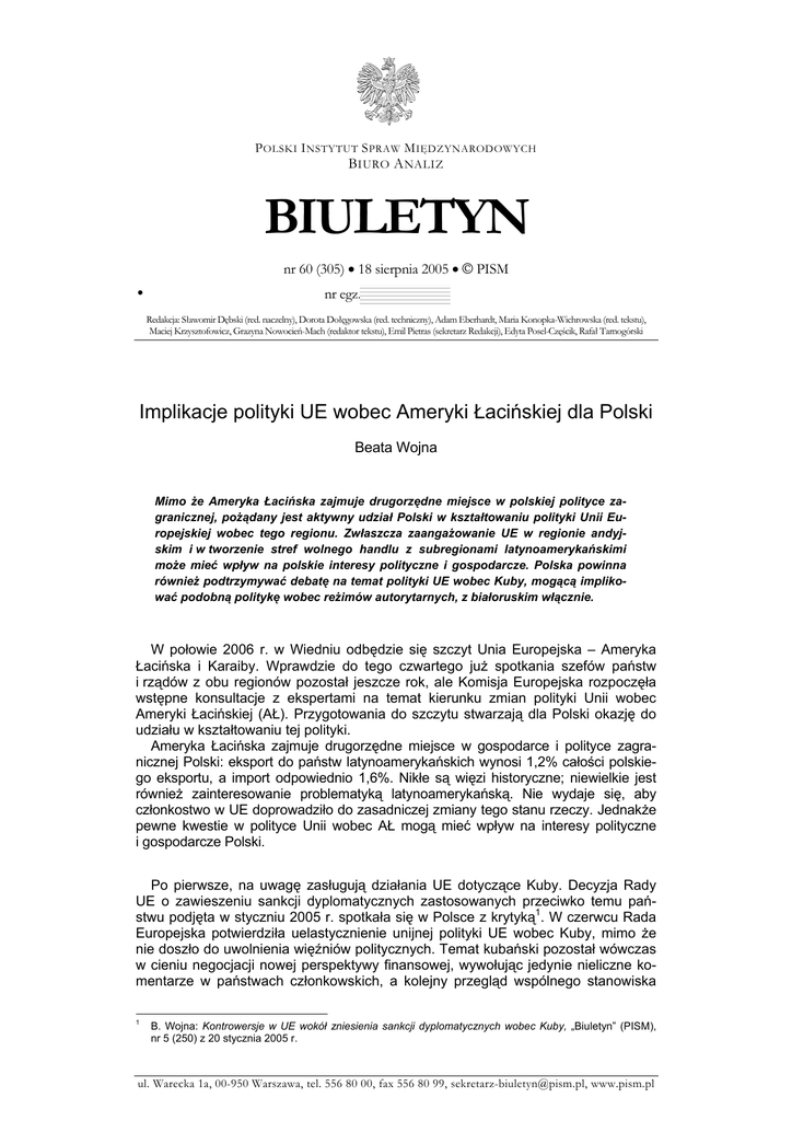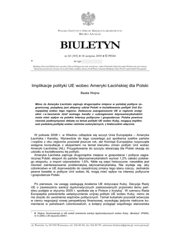 P OLSKI I NSTYTUT S PRAW M IĘDZYNARODOWYCH B IURO A NALIZ BIULETYN nr 60 (305) • 18 sierpnia 2005 • © PISM • nr egz.• Redakcja: Sławomir Dębski (red. naczelny), Dorota Dołęgowska (red. techniczny), Adam Eberhardt, Maria Konopka-Wichrowska (red. tekstu), Maciej Krzysztofowicz, Grazyna Nowocień-Mach (redaktor tekstu), Emil Pietras (sekretarz Redakcji), Edyta Posel-Częścik, Rafał Tarnogórski Implikacje polityki UE wobec Ameryki Łacińskiej dla Polski Beata Wojna Mimo że Ameryka Łacińska zajmuje drugorzędne miejsce w polskiej polityce zagranicznej, pożądany jest aktywny udział Polski w kształtowaniu polityki Unii Europejskiej wobec tego regionu. Zwłaszcza zaangażowanie UE w regionie andyjskim i w tworzenie stref wolnego handlu z subregionami latynoamerykańskimi może mieć wpływ na polskie interesy polityczne i gospodarcze. Polska powinna również podtrzymywać debatę na temat polityki UE wobec Kuby, mogącą implikować podobną politykę wobec reżimów autorytarnych, z białoruskim włącznie. W połowie 2006 r. w Wiedniu odbędzie się szczyt Unia Europejska – Ameryka Łacińska i Karaiby. Wprawdzie do tego czwartego już spotkania szefów państw i rządów z obu regionów pozostał jeszcze rok, ale Komisja Europejska rozpoczęła wstępne konsultacje z ekspertami na temat kierunku zmian polityki Unii wobec Ameryki Łacińskiej (AŁ). Przygotowania do szczytu stwarzają dla Polski okazję do udziału w kształtowaniu tej polityki. Ameryka Łacińska zajmuje drugorzędne miejsce w gospodarce i polityce zagranicznej Polski: eksport do państw latynoamerykańskich wynosi 1,2% całości polskiego eksportu, a import odpowiednio 1,6%. Nikłe są więzi historyczne; niewielkie jest również zainteresowanie problematyką latynoamerykańską. Nie wydaje się, aby członkostwo w UE doprowadziło do zasadniczej zmiany tego stanu rzeczy. Jednakże pewne kwestie w polityce Unii wobec AŁ mogą mieć wpływ na interesy polityczne i gospodarcze Polski. Po pierwsze, na uwagę zasługują działania UE dotyczące Kuby. Decyzja Rady UE o zawieszeniu sankcji dyplomatycznych zastosowanych przeciwko temu państwu podjęta w styczniu 2005 r. spotkała się w Polsce z krytyką1. W czerwcu Rada Europejska potwierdziła uelastycznienie unijnej polityki UE wobec Kuby, mimo że nie doszło do uwolnienia więźniów politycznych. Temat kubański pozostał wówczas w cieniu negocjacji nowej perspektywy finansowej, wywołując jedynie nieliczne komentarze w państwach członkowskich, a kolejny przegląd wspólnego stanowiska 1 B. Wojna: Kontrowersje w UE wokół zniesienia sankcji dyplomatycznych wobec Kuby, „Biuletyn” (PISM), nr 5 (250) z 20 stycznia 2005 r. ul. Warecka 1a, 00-950 Warszawa, tel. 556 80 00, fax 556 80 99, [email protected], www.pism.pl 1510 POLSKI INSTYTUT SPRAW MIĘDZYNARODOWYCH planowany jest dopiero na czerwiec 2006 r. Ponieważ Unia nie wypracowała do tej pory spójnej polityki wobec reżimów autorytarnych, przygotowania do szczytu UE– AŁ mogą stać się okazją do zainicjowania przez Polskę debaty na temat stosunku do państw, w których są naruszane zasady demokratyczne i łamane prawa człowieka, m.in. Kuby i Białorusi. Aktywny udział w kształtowaniu wspólnej polityki wobec Kuby mógłby przyczynić się do realizacji celów polskiej polityki zagranicznej w odniesieniu do najbliższego sąsiedztwa, zwłaszcza że w interesie Polski leży, aby UE wykazywała większe zainteresowanie sytuacją na Białorusi. W debatę na temat polityki wobec państw autorytarnych włączą się zapewne Czechy i Holandia, które już wcześniej oponowały przeciwko zawieszeniu sankcji dyplomatycznych wobec Kuby. Po drugie, dialog polityczny UE z Ameryką Łacińską, a zwłaszcza z państwami regionu andyjskiego, może mieć wpływ na stosunki transatlantyckie. Stany Zjednoczone od dawna prowadzą aktywną politykę w regionie andyjskim. Jej celem jest m.in. zagwarantowanie regularnych dostaw ropy naftowej z Wenezueli, Kolumbii i Ekwadoru. Dążąc do wyeliminowania grup partyzanckich i międzynarodowych karteli narkotykowych, USA udzielają Kolumbii pomocy finansowej na szkolenie wojska i policji oraz na zakup broni. Od 2000 r. starają się również doprowadzić do międzynarodowej izolacji populistycznego i antyamerykańskiego prezydenta Wenezueli Hugo Chaveza. UE unikała angażowania się w odległe sprawy andyjskie, tym bardziej że poprzedni premier Hiszpanii José M. Aznar popierał latynoamerykańską politykę USA. Inaczej obecny premier José L. Zapatero, który utrzymuje dobre stosunki m.in. z H. Chavezem i próbuje odgrywać rolę pośrednika w sporach między państwami regionu. W czasie rozmów J.L. Zapatero z prezydentem Kolumbii Alvaro Uribe w marcu br. pojawił się temat ewentualnego udziału UE w rozwiązaniu trwającego od lat konfliktu wewnętrznego w tym państwie. Zainteresowanie, jakie Hiszpania wykazuje regionem andyjskim, może przełożyć się na próby włączenia do unijnych programów także problemu kolumbijskiego. Nawet jeśli Hiszpanii nie uda się uzyskać w tej sprawie poparcia pozostałych państw członkowskich, jest bardzo prawdopodobne, że tematyka andyjska pojawi się w stosunkach polsko-amerykańskich, ponieważ Polska jako członek UE może wpływać na kształt jej polityki wobec AŁ. W ostatnich latach Unia krytycznie odnosiła się do propozycji rozwiązania konfliktu w Kolumbii wysuwanych przez kolumbijski rząd i wspieranych przez USA. Nie poparła rozpoczętego w 2001 r. i nadal realizowanego amerykańsko-kolumbijskiego planu stabilizacji Kolumbii (tzw. Plan Colombia). Parlament Europejski argumentował wówczas, że plan ten prowadzi do militaryzacji regionu, a nie do rzeczywistego zakończenia konfliktu. Po trzecie, współpracy politycznej między UE i Ameryką Łacińską towarzyszą działania, które już doprowadziły bądź doprowadzą w ciągu najbliższych lat do utworzenia stref wolnego handlu. W l
