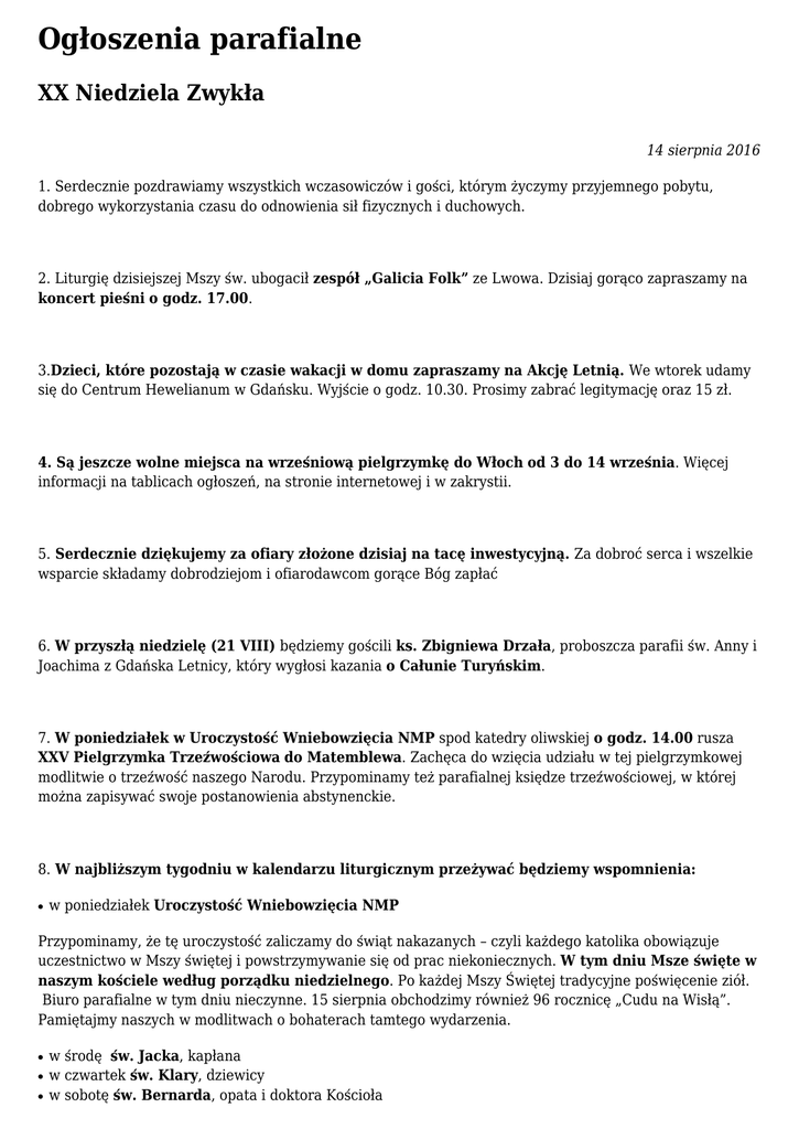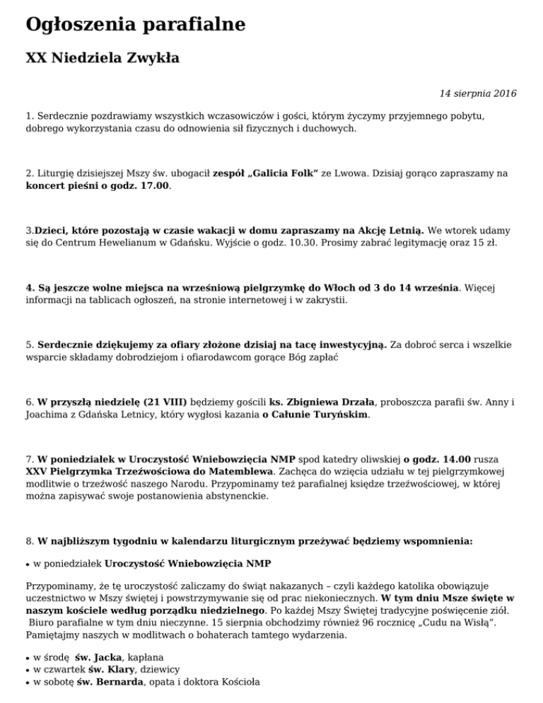 Ogłoszenia parafialne XX Niedziela Zwykła 14 sierpnia 2016 1. Serdecznie pozdrawiamy wszystkich wczasowiczów i gości, którym życzymy przyjemnego pobytu, dobrego wykorzystania czasu do odnowienia sił fizycznych i duchowych. 2. Liturgię dzisiejszej Mszy św. ubogacił zespół „Galicia Folk” ze Lwowa. Dzisiaj gorąco zapraszamy na koncert pieśni o godz. 17.00. 3.Dzieci, które pozostają w czasie wakacji w domu zapraszamy na Akcję Letnią. We wtorek udamy się do Centrum Hewelianum w Gdańsku. Wyjście o godz. 10.30. Prosimy zabrać legitymację oraz 15 zł. 4. Są jeszcze wolne miejsca na wrześniową pielgrzymkę do Włoch od 3 do 14 września. Więcej informacji na tablicach ogłoszeń, na stronie internetowej i w zakrystii. 5. Serdecznie dziękujemy za ofiary złożone dzisiaj na tacę inwestycyjną. Za dobroć serca i wszelkie wsparcie składamy dobrodziejom i ofiarodawcom gorące Bóg zapłać 6. W przyszłą niedzielę (21 VIII) będziemy gościli ks. Zbigniewa Drzała, proboszcza parafii św. Anny i Joachima z Gdańska Letnicy, który wygłosi kazania o Całunie Turyńskim. 7. W poniedziałek w Uroczystość Wniebowzięcia NMP spod katedry oliwskiej o godz. 14.00 rusza XXV Pielgrzymka Trzeźwościowa do Matemblewa. Zachęca do wzięcia udziału w tej pielgrzymkowej modlitwie o trzeźwość naszego Narodu. Przypominamy też parafialnej księdze trzeźwościowej, w której można zapisywać swoje postanowienia abstynenckie. 8. W najbliższym tygodniu w kalendarzu liturgicznym przeżywać będziemy wspomnienia: ● w poniedziałek Uroczystość Wniebowzięcia NMP Przypominamy, że tę uroczystość zaliczamy do świąt nakazanych – czyli każdego katolika obowiązuje uczestnictwo w Mszy świętej i powstrzymywanie się od prac niekoniecznych. W tym dniu Msze święte w naszym kościele według porządku niedzielnego. Po każdej Mszy Świętej tradycyjne poświęcenie ziół. Biuro parafialne w tym dniu nieczynne. 15 sierpnia obchodzimy również 96 rocznicę „Cudu na Wisłą”. Pamiętajmy naszych w modlitwach o bohaterach tamtego wydarzenia. ● ● ● w środę św. Jacka, kapłana w czwartek św. Klary, dziewicy w sobotę św. Bernarda, opata i doktora Kościoła 9. Po Mszy świętej do nabycia jest prasa katolicka: Gość Niedzielny oraz Niedziela 10. Naszych drogich zmarłych, Ks. Jerzego, budowniczych i dobrodziejów naszego kościoła oraz zmarłych z naszych rodzin, a także śp. Stanisława Staszkiewicza, którego pożegnaliśmy w minionym tygodniu polećmy teraz Bożemu miłosierdziu: wieczny odpoczynek racz im dać Panie.