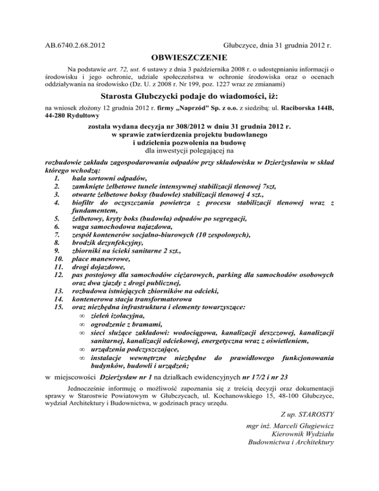 AB.6740.2.68.2012 Głubczyce, dnia 31 grudnia 2012 r. OBWIESZCZENIE Na podstawie art. 72, ust. 6 ustawy z dnia 3 października 2008 r. o udostępnianiu informacji o środowisku i jego ochronie, udziale społeczeństwa w ochronie środowiska oraz o ocenach oddziaływania na środowisko (Dz. U. z 2008 r. Nr 199, poz. 1227 wraz ze zmianami) Starosta Głubczycki podaje do wiadomości, iŜ: na wniosek złoŜony 12 grudnia 2012 r. firmy „Naprzód” Sp. z o.o. z siedzibą: ul. Raciborska 144B, 44-280 Rydułtowy została wydana decyzja nr 308/2012 w dniu 31 grudnia 2012 r. w sprawie zatwierdzenia projektu budowlanego i udzielenia pozwolenia na budowę dla inwestycji polegającej na rozbudowie zakładu zagospodarowania odpadów przy składowisku w DzierŜysławiu w skład którego wchodzą: 1. hala sortowni odpadów, 2. zamknięte Ŝelbetowe tunele intensywnej stabilizacji tlenowej 7szt, 3. otwarte Ŝelbetowe boksy (budowle) stabilizacji tlenowej 4 szt., 4. biofiltr do oczyszczania powietrza z procesu stabilizacji tlenowej wraz z fundamentem, Ŝelbetowy, kryty boks (budowla) odpadów po segregacji, 5. 6. waga samochodowa najazdowa, 7. zespół kontenerów socjalno-biurowych (10 zespolonych), 8. brodzik dezynfekcyjny, 9. zbiorniki na ścieki sanitarne 2 szt., 10. place manewrowe, 11. drogi dojazdowe, 12. pas postojowy dla samochodów cięŜarowych, parking dla samochodów osobowych oraz dwa zjazdy z drogi publicznej, 13. rozbudowa istniejących zbiorników na odcieki, 14. kontenerowa stacja transformatorowa 15. oraz niezbędna infrastruktura i elementy towarzyszące: • zieleń izolacyjna, • ogrodzenie z bramami, • sieci słuŜące zakładowi: wodociągowa, kanalizacji deszczowej, kanalizacji sanitarnej, kanalizacji odciekowej, energetyczna wraz z oświetleniem, • urządzenia podczyszczające, • instalacje wewnętrzne niezbędne do prawidłowego funkcjonowania budynków, budowli i urządzeń; w miejscowości DzierŜysław nr 1 na działkach ewidencyjnych nr 17/2 i nr 23 Jednocześnie informuję o moŜliwość zapoznania się z treścią decyzji oraz dokumentacji sprawy w Starostwie Powiatowym w Głubczycach, ul. Kochanowskiego 15, 48-100 Głubczyce, wydział Architektury i Budownictwa, w godzinach pracy urzędu. Z up. STAROSTY mgr inŜ. Marceli Gługiewicz Kierownik Wydziału Budownictwa i Architektury