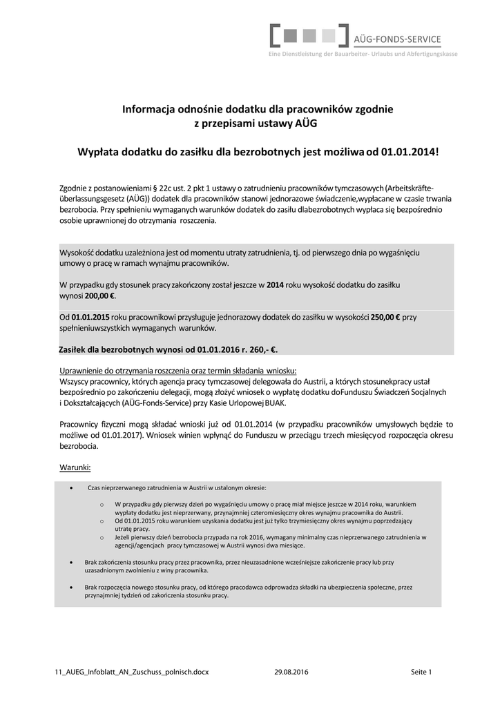 Eine Dienstleistung der Bauarbeiter- Urlaubs und Abfertigungskasse Informacja odnośnie dodatku dla pracowników zgodnie z przepisami ustawy AÜG Wypłata dodatku do zasiłku dla bezrobotnych jest możliwa od 01.01.2014! Zgodnie z postanowieniami § 22c ust. 2 pkt 1 ustawy o zatrudnieniu pracowników tymczasowych (Arbeitskräfteüberlassungsgesetz (AÜG)) dodatek dla pracowników stanowi jednorazowe świadczenie,wypłacane w czasie trwania bezrobocia. Przy spełnieniu wymaganych warunków dodatek do zasiłu dlabezrobotnych wypłaca się bezpośrednio osobie uprawnionej do otrzymania roszczenia. Wysokość dodatku uzależniona jest od momentu utraty zatrudnienia, tj. od pierwszego dnia po wygaśnięciu umowy o pracę w ramach wynajmu pracowników. W przypadku gdy stosunek pracy zakończony został jeszcze w 2014 roku wysokość dodatku do zasiłku wynosi 200,00 €. Od 01.01.2015 roku pracownikowi przysługuje jednorazowy dodatek do zasiłku w wysokości 250,00 € przy spełnieniuwszystkich wymaganych warunków. Zasiłek dla bezrobotnych wynosi od 01.01.2016 r. 260,- €. Uprawnienie do otrzymania roszczenia oraz termin składania wniosku: Wszyscy pracownicy, których agencja pracy tymczasowej delegowała do Austrii, a których stosunekpracy ustał bezpośrednio po zakończeniu delegacji, mogą złożyć wniosek o wypłatę dodatku doFunduszu Świadczeń Socjalnych i Dokształcających (AÜG-Fonds-Service) przy Kasie Urlopowej BUAK. Pracownicy fizyczni mogą składać wnioski już od 01.01.2014 (w przypadku pracowników umysłowych będzie to możliwe od 01.01.2017). Wniosek winien wpłynąć do Funduszu w przeciągu trzech miesięcy od rozpoczęcia okresu bezrobocia. Warunki: • Czas nieprzerwanego zatrudnienia w Austrii w ustalonym okresie: o o o W przypadku gdy pierwszy dzień po wygaśnięciu umowy o pracę miał miejsce jeszcze w 2014 roku, warunkiem wypłaty dodatku jest nieprzerwany, przynajmniej czteromiesięczny okres wynajmu pracownika do Austrii. Od 01.01.2015 roku warunkiem uzyskania dodatku jest już tylko trzymiesięczny okres wynajmu poprzedzający utratę pracy. Jeżeli pierwszy dzień bezrobocia przypada na rok 2016, wymagany minimalny czas nieprzerwanego zatrudnienia w agencji/agencjach pracy tymczasowej w Austrii wynosi dwa miesiące. • Brak zakończenia stosunku pracy przez pracownika, przez nieuzasadnione wcześniejsze zakończenie pracy lub przy uzasadnionym zwolnieniu z winy pracownika. • Brak rozpoczęcia nowego stosunku pracy, od którego pracodawca odprowadza składki na ubezpieczenia społeczne, przez przynajmniej tydzień od zakończenia stosunku pracy. 11_AUEG_Infoblatt_AN_Zuschuss_polnisch.docx 29.08.2016 Seite 1 Eine Dienstleistung der Bauarbeiter- Urlaubs und Abfertigungskasse Złożenie wniosku: Osoba uprawniona do otrzymania roszczenia składa wniosek do Funduszu AÜG przy BUAK. Należyrozróżnić dwa rodzaje formularza: formularz „AN-Zuschuss AÜG Österreich” jest właściwy dla pracowników ubezpieczonych w Austrii formularz „AN-Zuschuss AÜG Entsendung” jest właściwy dla pracowników, którzy delegowani zostali do pracy na terenie Austrii przez agencję pracy tymczasowej z siedzibą poza granicami Austrii, i w związku z czym podlegają ubezpieczeniu w innym kraju W przypadku gdy, na czas delegacji do Austrii składa się wiele stosunków pracy względem różnychpracodawców, należy podać je na załączniku do wniosku o nazwie „Beiblatt AN-Zuschuss AÜG Weitere Überlassungen“. Formularze są przygotowane do pobrania na naszej stronie internetowej www.buak-auegfonds.at. Wymagane dokumenty: Kopia ważnego dowodu tożsamości (np. paszportu lub dowodu osobistego) Potwierdzenie zakończenia ostatniego/ich stosunku/ów pracy względem agencji pracy tymczasowej z siedzibą poza granicami Austrii z podaniem powodu rozwiązania stosunku pracy Urzędowe potwierdzenie zgłoszenia bezrobocia, w przypadku gdy, zgłoszenie ma miejsce poza granicami Austrii Wymagane dokumenty są również podane na wniosku i należy je do niego dołączyć. Dalsze informacje W ramach broszury informacyjnej „AÜG Folder Fonds AN Zuschuss“ BUAK udostępnia informajcedotyczące Funduszu w różnych językach. Proszę pamiętać, że wniosek winnien składać pracownik.Dalsze informacje uzyskają Państwo na stronie internetowej www.buak-auegfonds.at lub pod podanymi powyżej danymi kontaktowymi. 11_AUEG_Infoblatt_AN_Zuschuss_polnisch.docx 29.08.2016 Seite 2