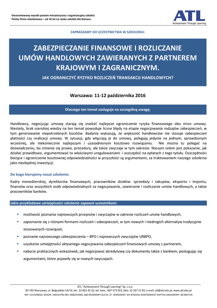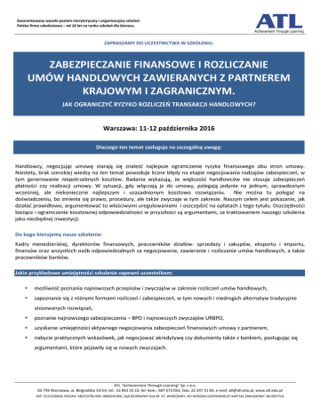 Gwarantowany wysoki poziom merytoryczny i organizacyjny szkoleń. Polska firma szkoleniowa – od 16 lat na rynku szkoleń dla biznesu. ZAPRASZAMY DO UCZESTNICTWA W SZKOLENIU: ZABEZPIECZANIE FINANSOWE I ROZLICZANIE UMÓW HANDLOWYCH ZAWIERANYCH Z PARTNEREM KRAJOWYM I ZAGRANICZNYM. JAK OGRANICZYĆ RYZYKO ROZLICZEŃ TRANSAKCJI HANDLOWYCH? Warszawa: 11-12 października 2016 Dlaczego ten temat zasługuje na szczególną uwagę: Handlowcy, negocjując umowę starają się znaleźć najlepsze ograniczenie ryzyka finansowego obu stron umowy. Niestety, brak szerokiej wiedzy na ten temat powoduje liczne błędy na etapie negocjowania rodzajów zabezpieczeń, w tym generowanie niepotrzebnych kosztów. Badania wykazują, że większość handlowców nie stosuje zabezpieczeń płatności czy realizacji umowy. W sytuacji, gdy włączają je do umowy, polegają jedynie na jednym, sprawdzonym wcześniej, ale niekoniecznie najlepszym i uzasadnionym kosztowo rozwiązaniu. Nie można tu polegać na doświadczeniu, bo zmienia się prawo, procedury, ale także zwyczaje w tym zakresie. Naszym celem jest pokazanie, jak działać prawidłowo, argumentować to właściwymi uregulowaniami i oszczędzić na opłatach z tego tytułu. Oszczędności bieżące i ograniczenie kosztownej odpowiedzialności w przyszłości są argumentami, za traktowaniem naszego szkolenia jako niezbędnej inwestycji. Do kogo kierujemy nasze szkolenie: Kadry menedżerskiej, dyrektorów finansowych, pracowników działów: sprzedaży i zakupów, eksportu i importu, finansów oraz wszystkich osób odpowiedzialnych za negocjowanie, zawieranie i rozliczanie umów handlowych, a także pracowników banków. Jakie przykładowe umiejętności szkolenie zapewni uczestnikom: możliwość poznania najnowszych przepisów i zwyczajów w zakresie rozliczeń umów handlowych, zapoznanie się z różnymi formami rozliczeń i zabezpieczeń, w tym nowych i niedrogich alternatyw tradycyjnie stosowanych rozwiązań, poznanie najnowszego zabezpieczenia – BPO i najnowszych zwyczajów URBPO, uzyskanie umiejętności aktywnego negocjowania zabezpieczeń finansowych umowy z partnerem, nabycie praktycznych wskazówek, jak negocjować akredytywę czy dokumenty także z bankiem, posługując się argumentami, które pojawiły się w nowych zwyczajach. ATL “Achievement Through Learning” Sp. z o.o. 02-793 Warszawa, ul. Belgradzka 14/14; tel.: 22 853 35 23, tel. kom.: 607 573 053, faks: 22 247 21 83, e-mail: [email protected], www.atl.edu.pl NIP: 5213358018, REGON: 140233796 KRS: 0000241906, SĄD REJONOWY DLA M. ST. WARSZAWY, XIII WYDZIAŁ GOSPODARCZY KAPITAŁ ZAKŁADOWY: 80.000 PLN Gwarantowany wysoki poziom merytoryczny i organizacyjny szkoleń. Polska firma szkoleniowa – od 16 lat na rynku szkoleń dla biznesu. PROGRAM SZKOLENIA: 1. PRAWNO-ZWYCZAJOWE UWARUNKOWANIA ROZLICZEŃ TRANSAKCJI. Aktualne uregulowania prawne w zakresie zabezpieczeń finansowych umów. Nowelizacja Ustawy o terminach zapłaty w transakcjach handlowych i jej wpływ na odroczoną płatność. Metody ograniczania ryzyka odsetek ustawowych w kredycie kupieckim. Zmiany w zakresie zabezpieczeń w umowach o roboty budowlane. Ocena ryzyka związanego z finansowymi aspektami umowy. Zakres zabezpieczeń finansowych w umowie - zabezpieczenia płatności, zwrotu zaliczki, prawidłowego wykonania umowy. Finansowe zabezpieczenia wykonania zobowiązań reklamacyjnych, w tym z tytułu gwarancji jakości. Zabezpieczenia finansowe a scenariusze realizacji umowy. 2. ZABEZPIECZENIA FINANSOWE TRANSAKCJI KRAJOWYCH. Weryfikacja standingu finansowego i solidności kupieckiej kontrahenta. Interpretacja indeksów zdolności płatniczej. Nowe możliwości zabezpieczania odroczonej płatności (kredytu kupieckiego). Gwarancje bankowe i ich alternatywy. Problem bezwarunkowości i płatności na pierwsze żądanie beneficjenta gwarancji. Poręczenie, kredyt dyskontowy. Wykorzystanie weksli w zabezpieczeniach płatności oraz pułapki związane z wekslami. Awale. Zabezpieczanie płatności na bazie art. 777 kpc. jako alternatywa dla weksla. Porównanie warunków faktoringu i ubezpieczenia kredytu kupieckiego. Zmiany w Ustawie o zastawie rejestrowym i rejestrze zastawów. Niezbędne uzgodnienia przy blokadzie rachunku i przewłaszczeniu na zabezpieczenie. Wykorzystanie form rozliczeń w późniejszym dochodzeniu roszczeń i windykacji. 3. ZABEZPIECZENIA FINANSOWE TRANSAKCJI ZAGRANICZNYCH (POZA D/C). Analiza korzystności sposobów rozliczeń i zabezpieczeń transakcji zagranicznych z punktu widzenia importera i eksportera. Inkaso dokumentowe (D/A, D/P, spedytorskie i bezpośrednie) i posługiwanie się nim wg. zwyczajów URC 522. Gwarancje bankowe zagraniczne wg. nowych zwyczajów URDG 758. Akredytywa zabezpieczająca (stand-by) jako popularne i niedrogie zabezpieczenie finansowe nie będące akredytywą. Wykorzystanie zwyczajów ISP98 i konwencji CIGSLC przy rozliczaniu umów stand-by L/C. Ubezpieczenia ryzyk transakcyjnych i wypłacalności kontrahenta. 4. POSŁUGIWANIE SIĘ AKREDYTYWĄ DOKUMENTOWĄ (D/C) PRZEZ SPRZEDAJĄCEGO I KUPUJĄCEGO. Negocjowanie akredytywy z punktu widzenia sprzedającego i kupującego. Istotne postanowienia nowych Jednolitych zwyczajów i praktyki dotyczących akredytyw dokumentowych UCP 600. Rodzaje akredytyw i ich wykorzystanie do rozliczeń umowy. Tańsza alternatywa potwierdzania akredytywy przez bank beneficjenta. Zasady negocjowania kosztów akredytywy i eliminowanie problemu potrącania kosztów z kwoty przekazywanej przez bank. Zasady analizy przez banki dokumentów według nowego Międzynarodowego Standardu Praktyki Bankowej Dotyczącego Badania Dokumentów w Akredytywie Dokumentowej ISBP 745 (2013). Najczęściej występujące błędy w dokumentach składanych w ramach akredytywy. Koncepcje obrony przed odrzucaniem dokumentów i postępowanie wobec banku. Terminy krytyczne w akredytywie i ich interpretacja przez zwyczaje. Formułowanie klauzul płatności akredytywą w umowach w