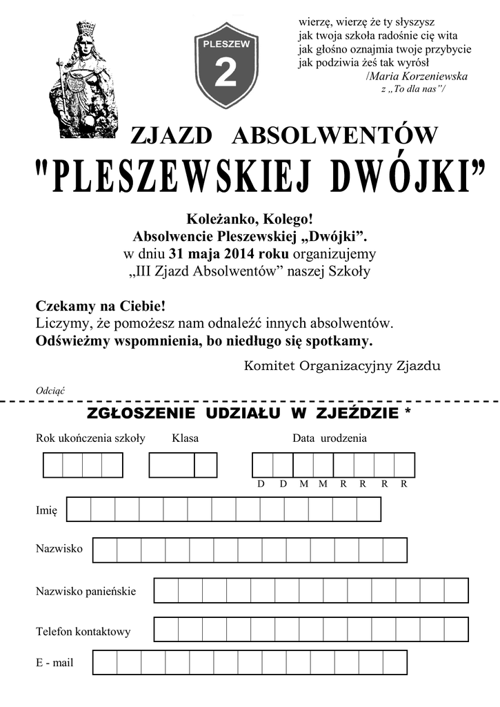 wierzę, wierzę że ty słyszysz jak twoja szkoła radośnie cię wita jak głośno oznajmia twoje przybycie jak podziwia żeś tak wyrósł /Maria Korzeniewska z „To dla nas”/ ZJAZD ABSOLWENTÓW Koleżanko, Kolego! Absolwencie Pleszewskiej „Dwójki”. w dniu 31 maja 2014 roku organizujemy „III Zjazd Absolwentów” naszej Szkoły Czekamy na Ciebie! Liczymy, że pomożesz nam odnaleźć innych absolwentów. Odświeżmy wspomnienia, bo niedługo się spotkamy. Komitet Organizacyjny Zjazdu Odciąć ZGŁOSZENIE UDZIAŁU W ZJEŹDZIE * Rok ukończenia szkoły Klasa Data urodzenia D Imię Nazwisko Nazwisko panieńskie Telefon kontaktowy E - mail D M M R R R R PROGRAM ZJAZDU Godz. 15.00 – Rejestracja uczestników zjazdu Godz. 16.00 – Msza Św. (teren szkoły) Godz. 16.30 – Otwarcie Zjazdu i występ uczniów "Pleszewskiej Dwójki" Godz. 17.00 – Zwiedzanie szkoły (tylko dla uczestników zjazdu) „Biesiada Królewska” – do rana (budynek szkolny) - spotkania koleżeńskie - poczęstunek (obiad, kolacja, zimny bufet, ciasto) - wspólna zabawa Całkowity koszt uczestnictwa w zjeździe wynosi 60 zł. - materiały zjazdowe (publikacja, znaczek, długopis) - poczęstunek Osoba towarzysząca 40 zł Wpłaty i zgłoszenia przyjmowane będą do dnia 15 maja 2014 roku w sekretariacie Zespołu Szkół Publicznych nr 2 w Pleszewie ul. Ogrodowa 2. Zgłoszenie można przesłać listownie na adres: Zespół Szkół Publicznych nr 2 ul. Ogrodowa 2 63-300 Pleszew wraz z kserokopią dowodu wpłaty 60 zł na konto: 80 8407 0003 0011 3481 2000 0001 w Banku Spółdzielczym w Pleszewie z dopiskiem „Zjazd”. Więcej informacji w sekretariacie Szkoły, pod numerem telefonu: (62) 7428 374 oraz na stronie internetowej www.dwojkapleszew.pl Adres zamieszkania Miejscowość Ulica Nr domu/nr lokalu / Kod pocztowy Poczta Wyrażam zgodę na przetwarzanie moich danych osobowych dla celów <<”Zjazdu absolwentów Pleszewskiej „Dwójki”>>. Oświadczam, że zostałem(łam) poinformowany(a) o dobrowolności podania danych osobowych oraz prawie wglądu do swoich danych i ich poprawiania. ………………………………………………………… / podpis uczestnika zjazdu/ * wypełnić drukowanymi literami