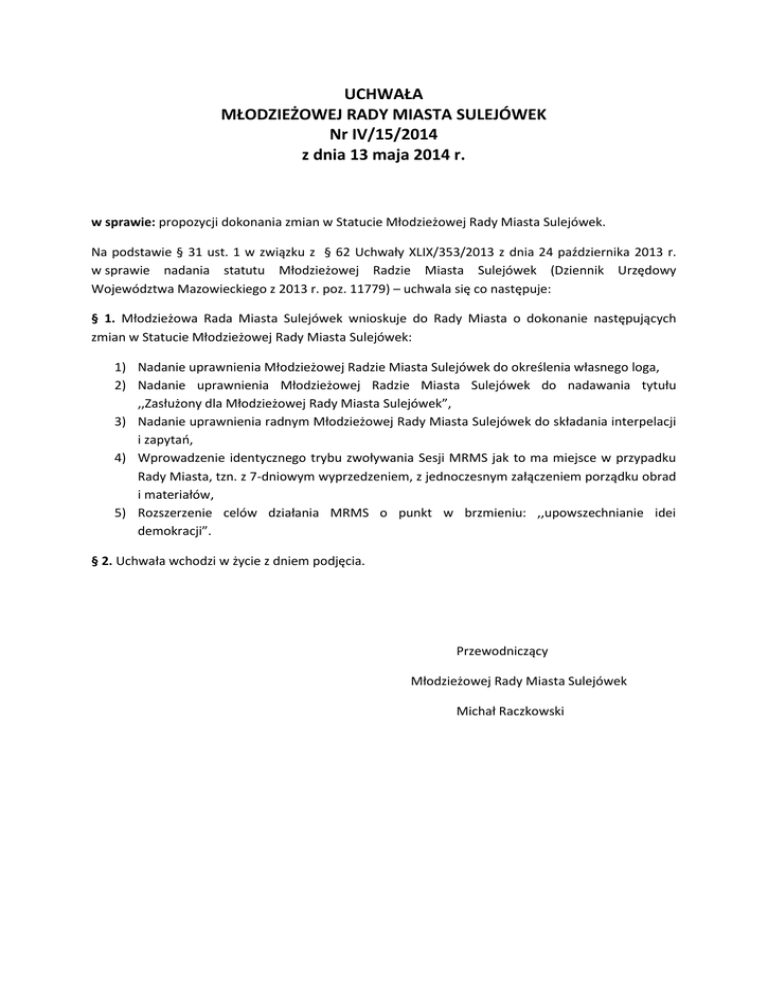Uchwała Młodzieżowej Rady Miasta Sulejówek Nr IV/15/2014 w
