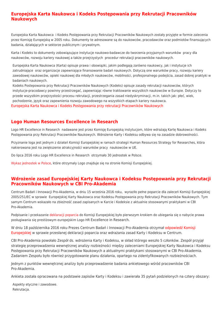 Europejska Karta Naukowca i Kodeks Postępowania przy Rekrutacji Pracowników Naukowych Europejska Karta Naukowca i Kodeks Postępowania przy Rekrutacji Pracowników Naukowych zostały przyjęte w formie zalecenia przez Komisję Europejską w 2005 roku. Dokumenty te adresowane są do naukowców, pracodawców oraz podmiotów finansujących badania, działających w sektorze publicznym i prywatnym. Karta i Kodeks to dokumenty zobowiązujące instytucje naukowo-badawcze do tworzenia przyjaznych warunków pracy dla naukowców, rozwoju kariery naukowej a także przejrzystych procedur rekrutacji pracowników naukowych. Europejska Karta Naukowca (Karta) opisuje prawa i obowiązki, jakim podlegają zarówno naukowcy, jak i instytucje ich zatrudniające oraz organizacje zapewniające finansowanie badań naukowych. Dotyczą one warunków pracy, rozwoju kariery zawodowej naukowców, opieki naukowej dla młodych naukowców, mobilności, profesjonalnego podejścia, zasad dobrej praktyki w badaniach naukowych. Kodeks Postepowania przy Rekrutacji Pracowników Naukowych (Kodeks) opisuje zasady rekrutacji naukowców, których instytucje-pracodawcy powinny przestrzegać, zapewniając równe traktowanie wszystkich naukowców w Europie. Dotyczy to przede wszystkim przejrzystości procesu rekrutacji, przestrzegania zasad niedyskryminacji, m.in. takich jak: płeć, wiek, pochodzenie, język oraz zapewnienia rozwoju zawodowego na wszystkich etapach kariery naukowca. Europejska Karta Naukowca i Kodeks Postępowania przy rekrutacji Pracowników Naukowych Logo Human Resources Excellence in Research Logo HR Excellence in Research nadawane jest przez Komisję Europejską instytucjom, które wdrażają Kartę Naukowca i Kodeks Postępowania przy Rekrutacji Pracowników Naukowych. Wdrożenie Karty i Kodeksu odbywa się na zasadzie dobrowolności. Przyznanie loga jest jednym z działań Komisji Europejskiej w ramach strategii Human Resources Strategy for Researches, która nakierowana jest na zwiększenie atrakcyjności warunków pracy naukowców w UE. Do lipca 2016 roku Logo HR Excellence in Research otrzymało 30 jednostek w Polsce. Wykaz jednostek w Polsce, które otrzymały Logo znajduje się na stronie Komisji Europejskiej. Wdrożenie zasad Europejskiej Karty Naukowca i Kodeksu Postępowania przy Rekrutacji Pracowników Naukowych w CBI Pro-Akademia Centrum Badań i Innowacji Pro-Akademia, w dniu 15 września 2016 roku, wyraziło pełne poparcie dla zaleceń Komisji Europejskiej 2005/251/EC w sprawie Europejskiej Karty Naukowca oraz Kodeksu Postępowania przy Rekrutacji Pracowników Naukowych. Tym samym Centrum wskazało na zbieżność zasad zapisanych w Karcie i Kodeksie z aktualnie stosowanymi praktykami w CBI Pro-Akademia. Podpisanie i przekazanie deklaracji poparcia do Komisji Europejskiej było pierwszym krokiem do ubiegania się o nabycie prawa posługiwania się prestiżowym europejskim Logo HR Excellence in Research. W dniu 18 października 2016 roku Prezes Centrum Badań i Innowacji Pro-Akademia otrzymał odpowiedź Komisji Europejskiej w sprawie przesłanej deklaracji poparcia oraz wdrażania zasad Karty i Kodeksu w Centrum. CBI Pro-Akademia powołało Zespół ds. wdrożenia Karty i Kodeksu, w skład którego weszło 5 członków. Zespół przyjął strategię przeprowadzenia wewnętrznej analizy rozbieżności między zaleceniami Europejskiej Karty Naukowca i Kodeksu Postępowania przy Rekrutacji Pracowników Naukowych a aktualnymi praktykami stosowanymi w CBI Pro-Akademia. Zadaniem Zespołu było również przygotowanie planu działania, opartego na zidentyfikowanych rozbieżnościach. Jednym z punktów wewnętrznej analizy było przeprowadzenie badania ankietowego wśród pracowników CBI Pro-Akademia. Ankieta została opracowana na podstawie zapisów Karty i Kodeksu i zawierała 35 pytań podzielonych na cztery obszary: Aspekty etyczne i zawodowe. Rekrutacja. Warunki pracy i zabezpieczenie społeczne. Kształcenie. Wyniki ankiety zostały zamieszczone w Strategii HR dla pracowników naukowych w Centrum Badań i Innowacji Pro-Akademia. Wewnętrzna analiza wykazała, że większość zasad wyrażonych w Karcie i Kodeksie jest przestrzegana przez CBI Pro-Akademia. Jednocześnie wyłoniono kilka kwestii, w których działania CBI Pro-Akademia w mniejszym lub większym stopniu odbiegają od zapisów Karty i Kodeksu. W wyniku przeprowadzonych działań został opracowany dokument: „HR Strategy for the Scientific Staff at the Research & Innovation Centre Pro-Akademia. Internal gap analysis and action plan for the years 2016-2018” "Strategia HR dla Pracowników Naukowych w Centrum Badań i Innowacji Pro-Akademia. Wewnętrzna analiza luk i plan działania na lata 2016-2018" Strategia została przesłana do Komisji Europejskiej w dniu 15 listopada 2016 roku. Przydatne linki: 1. Portal Komisji Europejskiej – EURAXESS 2. Lista instytucji, które wysłały deklarację poparcia dla Karty i Kodeksu Strona CBI Pro-Akademia używa ciasteczek (cookies), dzięki którym nasz serwis może działać lepiej. Zobacz