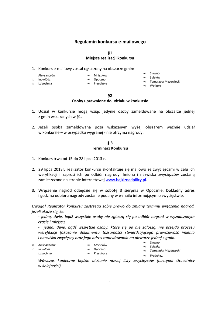 Regulamin konkursu e-mailowego §1 Miejsce realizacji konkursu 1. Konkurs e-mailowy został ogłoszony na obszarze gmin: • • • Aleksandrów Inowłódz Lubochnia • • • • • • • Mniszków Opoczno Przedbórz Sławno Sulejów Tomaszów Mazowiecki Wolbórz §2 Osoby uprawnione do udziału w konkursie 1. Udział w konkursie mogą wziąć jedynie osoby zameldowane na obszarze jednej z gmin wskazanych w §1. 2. Jeżeli osoba zameldowana poza wskazanym wyżej obszarem weźmie udział w konkursie – w przypadku wygranej - nie otrzyma nagrody. §3 Terminarz Konkursu 1. Konkurs trwa od 15 do 28 lipca 2013 r. 2. 29 lipca 2013r. realizator konkursu skontaktuje się mailowo ze zwycięzcami w celu ich weryfikacji i zaprosi ich po odbiór nagrody. Imiona i nazwiska zwycięzców zostaną zamieszczone na stronie internetowej www.bajkiznadpilicy.pl. 3. Wręczenie nagród odbędzie się w sobotę 3 sierpnia w Opocznie. Dokładny adres i godzina odbioru nagrody zostanie podany w e-mailu informującym o zwycięstwie. Uwaga! Realizator konkursu zastrzega sobie prawo do zmiany terminu wręczenia nagród, jeżeli okaże się, że: - jedna, dwie, bądź wszystkie osoby nie zgłoszą się po odbiór nagród w wyznaczonym czasie i miejscu, - jedna, dwie, bądź wszystkie osoby, które się po nie zgłoszą, nie przejdą procesu weryfikacji (okazanie dokumentu tożsamości stwierdzającego prawdziwość imienia i nazwiska zwycięzcy oraz jego adres zameldowania na obszarze jednej z gmin: • • • Aleksandrów Inowłódz Lubochnia • • • Mniszków Opoczno Przedbórz • • • Sławno Sulejów Tomaszów Mazowiecki • Wolbórz). Wówczas konieczne będzie ułożenie nowej listy zwycięzców (następni Uczestnicy w kolejności). 1 §4 Cel konkursu 1. Celem konkursu jest promocja witryny www.bajkiznadpilicy.pl i zawartych na niej treści, a tym samym dotarcie z informacją o atrakcjach turystycznych z obszaru gmin: • • • Aleksandrów Inowłódz Lubochnia • • • • • • • Mniszków Opoczno Przedbórz Sławno Sulejów Tomaszów Mazowiecki Wolbórz do jak największej liczby potencjalnych turystów z całej Polski. §5 Opis konkursu 1. Udział w konkursie jest dobrowolny i bezpłatny. 2. Konkurs polega na rozesłaniu przez Uczestników konkursu (zwanych dalej Uczestnikami) maila z informacją o portalu www.bajkiznadpilicy.pl do jak największej liczby znajomych z wykorzystaniem dedykowanego systemu dostępnego pod adresem internetowym: www.bajkiznadpilicy.pl/konkurs 3. By wziąć udział w konkursie, Uczestnik musi się zarejestrować podając swoje prawdziwe imię i nazwisko oraz prawdziwy adres e-mail, a następnie aktywować konto, klikając w link aktywacyjny, wysłany przez system na podany w formularzu rejestracji adres email. Uwaga! Podanie prawdziwych danych, o których wyżej mowa, jest niezbędne do zweryfikowania zwycięzcy konkursu oraz do wręczenia mu nagrody. Uwaga! Dobrze zapamiętaj swoje hasło podane w trakcie rejestracji. System nie umożliwia odzyskiwania haseł. 4. System automatycznie zlicza wysłane e-maile i przypisuje ich liczbę do konta Uczestnika. Uwaga! System nie zliczy e-maili nieistniejących lub błędnie zapisanych. Adresy e-mail w całym konkursie mogą się powtarzać. Adresy e-mail przypisane do konta danego Uczestnika nie mogą się powtarzać. Jeśli się powtórzą, system zliczy je jako jeden adres. 5. Uczestnik nie ma obowiązku wysyłać e-maili do wszystkich znajomych za jednym razem. Do konkursu można powracać wielokrotnie przez cały czas jego trwania. Ważne, by zawsze wysyłać e-maile z tego samego konta. 6. Jeżeli Uczestnik zarejestruje się w konkursie więcej niż jeden raz (czyli założy kilka różnych kont), każde jego konto będzie traktowane indywidualnie, jako osobny Uczestnik konkursu. 2 7. Uczestnik widzi treść maila, który będzie rozsyłany, ale nie ma możliwości ingerowania w nią. 8. Zwycięzcą konkursu zostanie Uczestnik, który roześle wiadomość e-mailową do największej liczby adresów e-mailowych (adresów swoich znajomych – patrz § 6 p. 1) 9. W konkursie nagrodzone zostaną trzy osoby z największą liczbą rozesłanych e-maili. 10. Nagrodami w konkursie są odpowiednio: I miejsce – aparat fotograficzny FujiFinepix S2980 II miejsce – dyktafon cyfrowy Sony ICD-UX513F III miejsce – książki: album - „Piękno Ziemi Łódzkiej” Włodzimierza Małka; książka - „Czas na e-biznes” Piotra Majewskiego. 11. W chwili wręczenia nagrody Zwycięzca konkursu zostanie poproszony o zalogowanie się na maila, biorącego udział w konkursie w obecności wręczających nagrody oraz o okazanie dokumentu tożsamości, zawierającego informacje o zameldowaniu oraz poświadczające prawdziwość imienia i nazwiska podanego przez Uczestnika konkursu w formularzu rejestracyjnym. Będzie to dowód na to, że nagrodę odbiera właściwa osoba. §6 Oświadczenia i zgody 1. To Uczestnik ponosi odpowiedzialność za to, do kogo wysyła e-maile. Akceptując niniejszy regulamin Uczestnik oświadcza, iż został pouczony o tym, że rozsyłanie e-maili do osób i instytucji, które mogą sobie tego nie życzyć, może być traktowane jako nękanie i pociągać za sobą konsekwencje prawne. Uwaga! Konkurs opiera się na założeniu, że Uczestnik będzie rozsyłał e-maile jedynie do swoich znajomych i przyjaciół. 2. Akceptując niniejszy Regulamin Uczestnik wyraża zgodę na to, by system rozsyłał e-maile na wskazane przez niego adresy e-mailowe - w imieniu Uczestnika, podpisane adresem e-mailowym oraz imieniem i nazwiskiem Uczestnika. 3. Akceptując niniejszy Regulamin Uczestnik wyraża zgodę na przetwarzanie jego danych zawartych w formularzu rejestracyjnym (imię, nazwisko i adres e-mail) – tylko i wyłącznie do celów związanych z niniejszym konkursem. 4. Akceptując niniejszy Regulamin Uczestnik wyraża zgodę na to, iż w przypadku zajęcia pierwszego, drugiego bądź trzeciego miejsca w konku