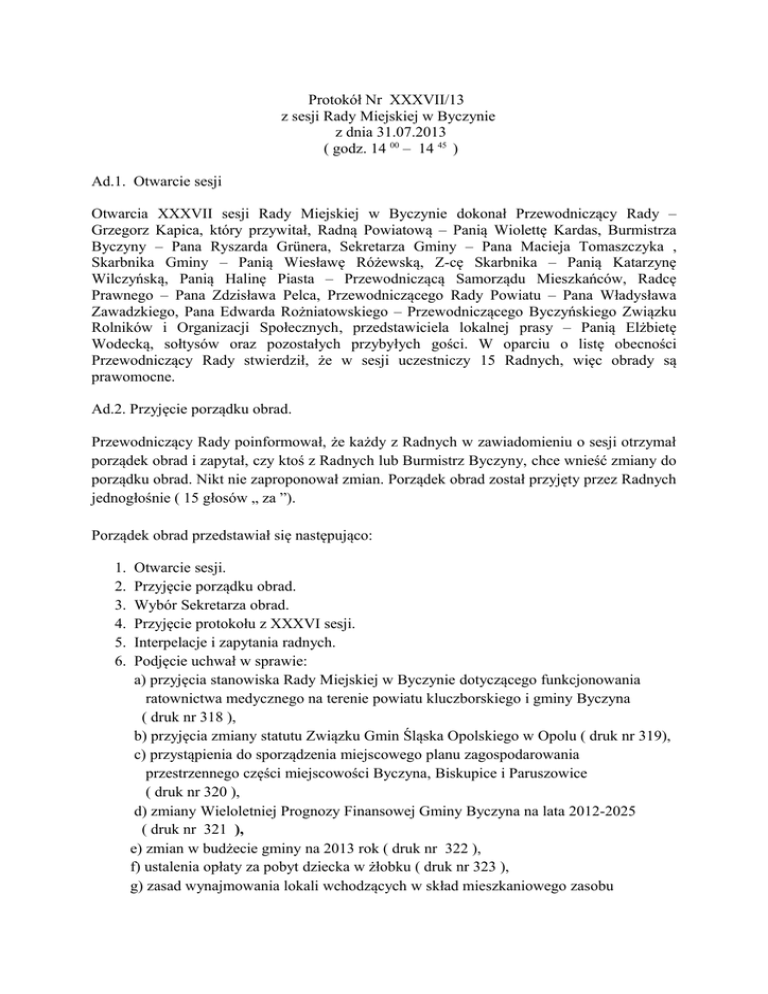 Protokół Nr XXXVII/13 z sesji Rady Miejskiej w Byczynie z dnia 31.07.2013 ( godz. 14 00 – 14 45 ) Ad.1. Otwarcie sesji Otwarcia XXXVII sesji Rady Miejskiej w Byczynie dokonał Przewodniczący Rady – Grzegorz Kapica, który przywitał, Radną Powiatową – Panią Wiolettę Kardas, Burmistrza Byczyny – Pana Ryszarda Grünera, Sekretarza Gminy – Pana Macieja Tomaszczyka , Skarbnika Gminy – Panią Wiesławę Różewską, Z-cę Skarbnika – Panią Katarzynę Wilczyńską, Panią Halinę Piasta – Przewodniczącą Samorządu Mieszkańców, Radcę Prawnego – Pana Zdzisława Pelca, Przewodniczącego Rady Powiatu – Pana Władysława Zawadzkiego, Pana Edwarda Rożniatowskiego – Przewodniczącego Byczyńskiego Związku Rolników i Organizacji Społecznych, przedstawiciela lokalnej prasy – Panią Elżbietę Wodecką, sołtysów oraz pozostałych przybyłych gości. W oparciu o listę obecności Przewodniczący Rady stwierdził, że w sesji uczestniczy 15 Radnych, więc obrady są prawomocne. Ad.2. Przyjęcie porządku obrad. Przewodniczący Rady poinformował, że każdy z Radnych w zawiadomieniu o sesji otrzymał porządek obrad i zapytał, czy ktoś z Radnych lub Burmistrz Byczyny, chce wnieść zmiany do porządku obrad. Nikt nie zaproponował zmian. Porządek obrad został przyjęty przez Radnych jednogłośnie ( 15 głosów „ za ”). Porządek obrad przedstawiał się następująco: 1. 2. 3. 4. 5. 6. Otwarcie sesji. Przyjęcie porządku obrad. Wybór Sekretarza obrad. Przyjęcie protokołu z XXXVI sesji. Interpelacje i zapytania radnych. Podjęcie uchwał w sprawie: a) przyjęcia stanowiska Rady Miejskiej w Byczynie dotyczącego funkcjonowania ratownictwa medycznego na terenie powiatu kluczborskiego i gminy Byczyna ( druk nr 318 ), b) przyjęcia zmiany statutu Związku Gmin Śląska Opolskiego w Opolu ( druk nr 319), c) przystąpienia do sporządzenia miejscowego planu zagospodarowania przestrzennego części miejscowości Byczyna, Biskupice i Paruszowice ( druk nr 320 ), d) zmiany Wieloletniej Prognozy Finansowej Gminy Byczyna na lata 2012-2025 ( druk nr 321 ), e) zmian w budżecie gminy na 2013 rok ( druk nr 322 ), f) ustalenia opłaty za pobyt dziecka w żłobku ( druk nr 323 ), g) zasad wynajmowania lokali wchodzących w skład mieszkaniowego zasobu Gminy Byczyna ( druk nr 324 ). 7. Odpowiedzi na zgłoszone interpelacje i zapytania radnych. 8. Wolne wnioski i zapytania. 9. Komunikaty. 10. Zakończenie sesji. Ad.3. Wybór Sekretarza obrad. Przewodniczący Rady zaproponował aby Sekretarzem obrad został Wiceprzewodnicząca Rady – Iwona Sobania. Przewodniczący Rady poddał pod głosowanie zgłoszoną kandydaturę. Zgłoszona kandydatura została przyjęta przez Radnych jednogłośnie ( 15 głosów „ za” ). Ad.4. Przyjęcie protokołu z XXXVI sesji. Przewodniczący Rady zaproponował przyjęcie protokołu z XXXVI sesji Rady Miejskiej bez uprzedniego czytania. Protokół z XXXVI sesji był dostępny w Biurze Rady oraz był wyłożony przed sesją. Przewodniczący Rady zapytał, czy ktoś z Radnych ma uwagi do protokołu. Nikt nie zabrał głosu. W związku z powyższym Przewodniczący Rady przystąpił do przegłosowania protokołu z XXXVI sesji. Protokół z XXXVI sesji został przyjęty przez Radnych jednogłośnie ( 15 głosów „za” ). Ad.5. Interpelacje i zapytania Radnych. Na wstępie głos zabrała Radna – Urszula Bilińska zadała pytanie, - dlaczego do dnia dzisiejszego sprzęt – zabawki na byczyńskim placu zabaw nie zostały odnowione – naprawione. Następnie Radny – Adam Radom zakomunikował zebranym, że na jego ręce wpłynął wniosek mieszkańców przysiółka Brzózka i osób korzystających z zalewu, w sprawie remontu drogi gminnej przebiegającej przez w/w przysiółek i biegnącej dalej w stronę zalewu. Przedmiotowa droga wymaga natychmiastowego remontu, a tak nawiasem mówiąc, więcej jest takich dróg wymagających remontu w trybie pilnym. Kontynuując wypowiedz Radny –Adam Radom stwierdził, że temat gminnych dróg winien być załatwiony kompleksowo. Następnie Radny –Adam Radom podał jakiego rzędu nakłady zostały poniesione przez Powiat Kluczborski w g.Byczyna w br. I tak, powiat na remonty dróg do dnia 30.06.2013r. wydał kwotę 120 tys.zł, z czego na terenie g.Byczyna wydane zostało 48 tys.zł. Następnie Radny – Adam Radom podał łączne nakłady na remonty i inwestycje w okresie ostatnich sześciu lat poczynionych przez Starostwo Powiatowe w Kluczborku. I tak, przy zainwestowanych 30 mln. zł.przez Starostwo Powiatowe w Kluczborku na teren g.Byczyna przypadło 5 mln. 300 tys.zł. Kończąc wypowiedz Radny –Adam Radom stwierdził, że w/w kwoty wcale nie były małe ale na pewno nie wystarczające na załatwienie wszystkich potrzeb. Następnie głos zabrał Przewodniczący Rady i zakomunikował zebranym, że do biura rady wpłynęło pismo podpisane przez 40 mieszańców, w sprawie pilnego remontu łącznika drogi ul.Stawowej i Brzozowej w m.Byczyna. Kolejną poruszoną sprawą przez Przewodniczącego Rady była nie załatwiona sprawa remontu drogi we wsi Proślice tuż obok gospodarstwa rolnego. Z kolei Radna –Iwona Sobania przypomniała o nie wyremontowanych drogach we wsi Nasale, Pszczonki oraz we wsi Wojsławice. Następnie głos zabrał Radny – Jan Romańczyk i zadał pytanie, kiedy mieszkańcy budynku przylegającego do nowo wybudowanego budynku w Miechowej podłączeni będą do sieci kanalizacji sanitarnej. Powodem zaniepokojenia Radnego – Jana Romańczyka przedmiotowa sprawą jest bardzo duża niepełnosprawność osób zamieszkujących w omawianym budynku. Ponadto jedna rodzina ma już rozprowadzoną sieć kanalizacji sanitarnej w lokalu mieszkalnym i w tym przypadku wystarczyłoby wykonać krótkie przyłącze na zewnątrz budynku do studzienki ( ok. 5 mb). Na koniec Radny – Jan Romańczyk zadał pytanie, dlaczego w chwili obecnej nie ma na poszczególnych wioskach pracowników interwen