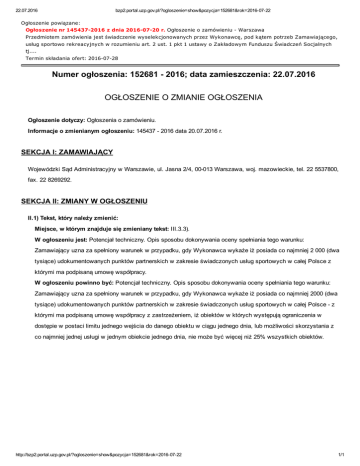 OGŁOSZENIE O ZMIANIE OGŁOSZENIA 22.07.2016