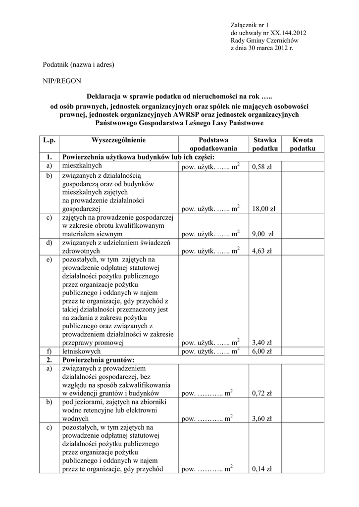 Załącznik nr 1 do uchwały nr XX.144.2012 Rady Gminy Czernichów z dnia 30 marca 2012 r. Podatnik (nazwa i adres) NIP/REGON Deklaracja w sprawie podatku od nieruchomości na rok ….. od osób prawnych, jednostek organizacyjnych oraz spółek nie mających osobowości prawnej, jednostek organizacyjnych AWRSP oraz jednostek organizacyjnych Państwowego Gospodarstwa Leśnego Lasy Państwowe L.p. 1. a) b) c) d) e) f) 2. a) b) c) Wyszczególnienie Podstawa opodatkowania Powierzchnia użytkowa budynków lub ich części: mieszkalnych pow. użytk. .….. m2 związanych z działalnością gospodarczą oraz od budynków mieszkalnych zajętych na prowadzenie działalności gospodarczej pow. użytk. .….. m2 zajętych na prowadzenie gospodarczej w zakresie obrotu kwalifikowanym materiałem siewnym pow. użytk. .….. m2 związanych z udzielaniem świadczeń zdrowotnych pow. użytk. .….. m2 pozostałych, w tym zajętych na prowadzenie odpłatnej statutowej działalności pożytku publicznego przez organizacje pożytku publicznego i oddanych w najem przez te organizacje, gdy przychód z takiej działalności przeznaczony jest na zadania z zakresu pożytku publicznego oraz związanych z prowadzeniem działalności w zakresie przeprawy promowej pow. użytk. .….. m2 letniskowych pow. użytk. .….. m2 Powierzchnia gruntów: związanych z prowadzeniem działalności gospodarczej, bez względu na sposób zakwalifikowania w ewidencji gruntów i budynków pow. ……….. m2 pod jeziorami, zajętych na zbiorniki wodne retencyjne lub elektrowni wodnych pow. ……….. m2 pozostałych, w tym zajętych na prowadzenie odpłatnej statutowej działalności pożytku publicznego przez organizacje pożytku publicznego i oddanych w najem przez te organizacje, gdy przychód pow. ……….. m2 Stawka podatku 0,58 zł 18,00 zł 9,00 zł 4,63 zł 3,40 zł 6,00 zł 0,72 zł 3,60 zł 0,14 zł Kwota podatku Załącznik nr 1 do uchwały nr XX.144.2012 Rady Gminy Czernichów z dnia 30 marca 2012 r. z takiej działalności przeznaczony jest na zadania z zakresu pożytku publicznego oraz związanych z prowadzeniem działalności w zakresie przeprawy promowej III Budowle - wartość (w pełnych złotych)* . …………..…...…zł 2% Kwota podatku (w pełnych złotych)* Informacja o zwolnionych przedmiotach opodatkowania (podać powierzchnie bądź wartość budowli przedmiotów zwolnionych, podstawę prawną oraz kwotę zwolnienia): 1. ………………………………………………………………………………………..… ………………………………………………………………………………………….. 2. ……………………………………………………….…………………………………. ……………………………………………………….…………………………………. Kwota podatku po zwolnieniach (w pełnych złotych)* Uprzedzony/a o odpowiedzialności karnej z art. 233 § 1 Kodeksu Karnego (Dz. U. z 1997 r. nr 88, poz. 553 z późn. zm.) oświadczam, że podane przeze mnie dane są zgodne z prawdą. Na podstawie art. 3a ustawy z dnia 17 czerwca 1966 r. o postępowaniu egzekucyjnym w administracji (Dz. U. z 2005 r. nr 229, poz. 1954 z późn. zm.) niniejsza deklaracja stanowi podstawę do wystawienia tytułu wykonawczego. ………………………... data ……………………………… nazwisko i imię osoby odpowiedzialnej za prawidłowe obliczenie podatku ………………………………. podpis ………………………………….. nr telefonu do kontaktu * - Zgodnie z art. 63 § 1 ustawy z dnia 29 sierpnia 1997 r. – Ordynacja podatkowa (tekst jednolity: Dz. U. z 2005 r. nr 8, poz. 60 z późn. zm.) podstawy opodatkowania, kwoty podatków, odsetki za zwłokę, opłaty prolongacyjne, oprocentowanie nadpłat oraz wynagrodzenia przysługujące płatnikom zaokrągla się do pełnych złotych, w ten sposób, że końcówki kwot wynoszące mniej niż 50 groszy pomija się, a końcówki kwot wynoszące 50 i więcej groszy podwyższa się do pełnych złotych. ___________________________________________________________________________ Wypełnia organ podatkowy W wyniku przeprowadzonej kontroli: do przypisu zł do odpisu zł Do zapłaty pozostaje kwota: ……………………......... zł. ………………………………. …………………………….. data podpis sprawdzającego