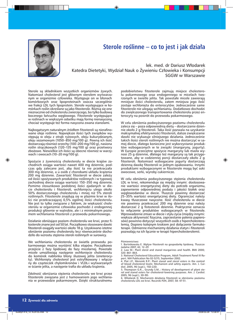 Sterole roślinne – co to jest i jak działa lek. med. dr Dariusz Włodarek Katedra Dietetyki, Wydział Nauk o Żywieniu Człowieka i Konsumpcji SGGW w Warszawie Sterole są składnikiem wszystkich organizmów żywych. Natomiast cholesterol jest głównym sterolem wytwarzanym w organizmie człowieka. Występuje on w błonach komórkowych oraz lipoproteinach osocza szczególnie we frakcji LDL tych lipoprotein. Sterole występujące w komórkach roślin określane są jako fitosterole. Różnią się one nieznacznie od cholesterolu zwierzęcego, bo tylko budową bocznego łańcucha węglowego. Fitosterole występujące w roślinach w większym odsetku mają formę nienasyconą, chociaż występuje też forma nasycona zwana stanolami. Najbogatszym naturalnym źródłem fitosteroli są nierafinowane oleje roślinne. Największe ilości tych związków występują w oleju z otrąb ryżowych, oleju kukurydzianym, oleju sezamowym (1050–850 mg/100 g). Pewną ich ilość dostarczają również orzechy (100–200 mg/100 g), nasiona roślin strączkowych (120–135 mg/100 g) oraz przetwory zbożowe. Niewielkie ich ilości są obecne również w warzywach i owocach (10–20 mg/100 g). Spożycie z żywnością cholesterolu w diecie krajów zachodnich osiąga wartości nawet 400 mg dziennie, podczas gdy zalecane jest, aby ilość ta nie przekraczała 300 mg dziennie, a u osób z chorobami układu krążenia 200 mg dziennie. Zawartość fitosteroli w diecie zależy od ilości spożywanych produktów roślinnych i w typowej zachodniej diecie osiąga wartości 150–350 mg dziennie. Pomimo stosunkowo podobnej ilości zjadanych w diecie cholesterolu i fitosteroli, wchłonięciu ulega około 50% dostarczonego cholesterolu i mniej niż 5% steroli roślinnych. Fitosterole znajdują się w plazmie krwi w ilości nie przekraczającej 0,5% ogólnej ilości cholesterolu. Nie jest to tylko związane z faktem, że większość cholesterolu w organizmie człowieka pochodzi z endogennej produkcji głównie w wątrobie, ale i z minimalnym poziomem wchłaniania fitosteroli z przewodu pokarmowego. Działanie obniżające poziom cholesterolu we krwi, przez fitosterole znane jest od 50 lat. Początkowo stosowane dawki fitosteroli osiągały wartości około 18 g. Uzyskiwano istotne obniżenie poziomu cholesterolu lecz równocześnie dochodziło do wzrostu stężenia steroli roślinnych w surowicy. We wchłanianiu cholesterolu ze światła przewodu pokarmowego można wyróżnić kilka etapów. Początkowo przejście z fazy lipidowej do fazy micelarnej. Powstałe micele umożliwiają następnie wchłonięcie cholesterolu do komórek nabłonka błony śluzowej jelita (eneterocyty). Wchłonięty cholesterol jest estryfikowany i włączany do cząsteczek chylomikronów i VLDL-i wytwarzanych w ścianie jelita, a następnie trafia do układu krążenia. Zdolność obniżania stężenia cholesterolu we krwi przez fitosterole związana jest z hamowaniem jego wchłaniania w przewodzie pokarmowym. Dzięki strukturalnemu 12 podobieństwu fitosterole zajmują miejsce cholesterolu pokarmowego oraz endogennego w micelach tworzonych w świetle jelita. Tak powstałe micele zawierają mniejsze ilości cholesterolu, zatem mniejsza jego ilość zostaje wchłonięta do enterocytów. Jednocześnie same fitosterole nie ulegają wchłanianiu. Dodatkowo dochodzi do zwiększonego transportowania cholesterolu przez enterocyty na powrót do przewodu pokarmowego. W celu obniżenia podwyższonego poziomu cholesterolu zaleca się – poza odpowiednią dietą – dostarczanie dziennie około 2 g fitosteroli. Taka ilość pozwala na uzyskanie maksymalnej efektywności fitosteroli, dalsze zwiększanie dawki nie wykazuje silniejszego działania. Jednocześnie takich ilości steroli roślinnych nie można dostarczyć w samej diecie, dlatego konieczne jest wykorzystanie produktów wzbogaconych w te związki (margaryny, jogurty). W Europie przeciętne spożycie margaryny lub masła wynosi 25 g dziennie, dlatego też margaryny są tak przygotowane, aby w codziennej porcji dostarczały około 2 g fitosteroli. Natomiast wzbogacane jogurty dostarczają dzienną dawkę fitosteroli w jednym opakowaniu. Innymi produktami wzbogaconymi w fitosterole mogą być soki owocowe, serki, wyroby cukiernicze. W celu obniżenia podwyższonego stężenia cholesterolu LDL w krwi, rekomenduje się między innymi: dostosowanie wartości energetycznej diety do potrzeb organizmu, zapewnienie odpowiedniej podaży i jakości białek oraz węglowodanów w diecie. Tłuszcze powinny dostarczać 25–35% wartości energetycznej diety. Ograniczać należy kwasy tłuszczowe nasycone. Ilość cholesterolu w diecie nie powinna przekraczać 200 mg dziennie oraz należy dostarczać 2 g fistosteroli dziennie. Praktycznie oznacza to włączenie produktów wzbogacanych w fitosterole. Wprowadzenie zmian w diecie i stylu życia (między innymi: większa aktywność fizyczna, zaprzestanie palenia papierosów) powinno dotyczyć wszystkich osób z hipercholesterolemią. Dopiero kolejnym krokiem jest dołączenie farmakoterapii. Odmienne mechanizmy działania statyn i fitosteroli pozwalają na ich łącznie w terapii hipercholesterolemii. Piśmiennictwo: 1. Bartnikowska E. Wpływ fitosteroli na gospodarkę lipidową. Tłuszcze Jadalne 2007, 42, 12–29 2. Law M.: Plant sterol and stanol margarines and health. BMJ 2000; 320: 861–864. 3. National Cholesterol Education Program, Adult Treatment Panel III Raport. NIH Publication No 02-5215, September 2002. 4. Plat J.P., Mensink R.P.: Plant stanol and sterol esters in the control of blood cholesterol levels: Mechanism and safety aspects. Am. J. Cardiol. 2005, 96 (supl.), 15D-22D. 5. Thompson G.R.., Grundy S.M..: History of development of plant sterol and stanol esters for cholesterol-lowering purposes. Am. J. Cardiol. 2005, 96 (supl.), 3D-9D. 6. Włodarek D. Mechanizm działania fitosteroli w obniżaniu poziomu cholesterolu LDL we krwi. Roczniki PZH, 20