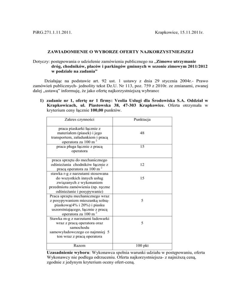 PiRG.271.1.11.2011. Krapkowice, 15.11.2011r. ZAWIADOMIENIE O WYBORZE OFERTY NAJKORZYSTNIEJSZEJ Dotyczy: postępowania o udzielenie zamówienia publicznego na „Zimowe utrzymanie dróg, chodników, placów i parkingów gminnych w sezonie zimowym 2011/2012 w podziale na zadania” Działając na podstawie art. 92 ust. 1 ustawy z dnia 29 stycznia 2004r.- Prawo zamówień publicznych- jednolity tekst Dz.U. Nr 113, poz. 759 z 2010r. ze zmianami, zwanej dalej „ustawą” informuję, że jako ofertę najkorzystniejszą wybrano: 1) zadanie nr 1, ofertę nr 1 firmy: Veolia Usługi dla Środowiska S.A. Oddział w Krapkowicach, ul. Piastowska 38, 47-303 Krapkowice. Oferta otrzymała w kryterium ceny łącznie 100,00 punktów. Zakres czynności praca piaskarki łącznie z materiałem (piasek) i jego transportem, załadunkiem i pracą operatora za 100 m 2 praca pługa łącznie z pracą operatora praca sprzętu do mechanicznego odśnieżania chodników łącznie z pracą operatora za 100 m 2 stawka r-g z narzutami stosowana do wszystkich innych usług związanych z wykonaniem przedmiotu zamówienia (np. ręczne odśnieżanie i posypywanie) Praca sprzętu mechanicznego wraz z posypywaniem mieszanką solnąpiaskową(4% i 20%) i piasku uszorstniającego, łącznie z pracą operatora za 100 m 2 Stawka m-g z narzutami ładowarki wraz z pracą operatora oraz samochodu samowyładowczego co najmniej 5 ton wraz z pracą operatora Razem Punktacja 48 15 12 15 5 5 100 pkt Uzasadnienie wyboru: Wykonawca spełnia warunki udziału w postępowaniu, oferta Wykonawcy nie podlega odrzuceniu. Oferta najkorzystniejsza- z najniższą ceną, zgodnie z jedynym kryterium oceny ofert-ceną. 2) zadanie nr 2,4 ofertę nr 1 firmy: Veolia Usługi dla Środowiska S.A. Oddział w Krapkowicach, ul. Piastowska 38, 47-303 Krapkowice. Oferta otrzymała w kryterium ceny łącznie 100,00 punktów. Zakres czynności Punktacja praca piaskarki łącznie z materiałem (piasek) i jego transportem, załadunkiem i pracą operatora za 100 m 2 praca pługa łącznie z pracą operatora 30 40 stawka r-g z narzutami stosowana do wszystkich innych usług związanych z wykonaniem przedmiotu zamówienia (np. ręczne odśnieżanie i posypywanie) Stawka m-g z narzutami ładowarki wraz z pracą operatora oraz samochodu samowyładowczego co najmniej 5 ton wraz z pracą operatora Razem 10 20 100 pkt Uzasadnienie wyboru: Wykonawca spełnia warunki udziału w postępowaniu, oferta Wykonawcy nie podlega odrzuceniu. Oferta najkorzystniejsza- z najniższą ceną, zgodnie z jedynym kryterium oceny ofert-ceną. 3) zadanie nr 3 ofertę nr 1 firmy: ART.-BRUK Damian Felis, ul. Chrobrego 33, 47303 Krapkowice . Oferta otrzymała w kryterium ceny łącznie 100,00 punktów. Na zadanie nr 3 ofertę nr 2 złożył również Wykonawca: Veolia Usługi dla Środowiska S.A. Oddział w Krapkowicach, ul. Piastowska 38, 47-303 Krapkowice. Oferta otrzymała w kryterium ceny łącznie 75,00 punktów. Zakres czynności praca piaskarki łącznie z materiałem (piasek) i jego transportem, załadunkiem i pracą operatora za 100 m 2 praca pługa łącznie z pracą operatora stawka r-g z narzutami stosowana do wszystkich innych usług związanych z wykonaniem przedmiotu zamówienia (np. ręczne odśnieżanie i posypywanie) Punktacja oferty nr 1 Punktacja oferty nr 2 30 24,99 40 28,49 10 6,64 Stawka m-g z narzutami ładowarki wraz z pracą operatora oraz samochodu ciężarowego o ładowności co najmniej 5 ton do wywozu śniegu wraz z pracą operatora Razem 20 14,88 100 pkt 75 pkt Uzasadnienie wyboru: Wykonawcy spełniają warunki udziału w postępowaniu, oferty Wykonawców nie podlegają odrzuceniu. Oferty najkorzystniejsze- z najniższą ceną, zgodnie z jedynym kryterium oceny ofert-ceną /-/ Andrzej Kasiura Burmistrz