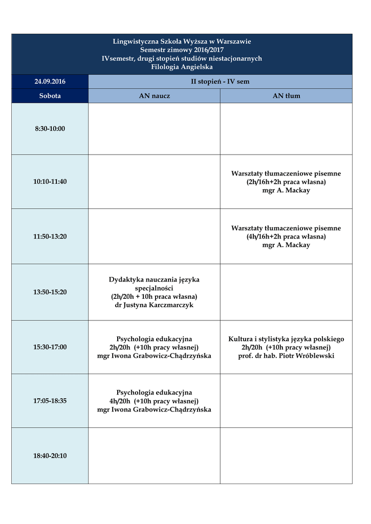 Lingwistyczna Szkoła Wyższa w Warszawie Semestr zimowy 2016/2017 IVsemestr, drugi stopień studiów niestacjonarnych Filologia Angielska II stopień - IV sem 24.09.2016 Sobota AN naucz AN tłum 8:30-10:00 10:10-11:40 Warsztaty tłumaczeniowe pisemne (2h/16h+2h praca własna) mgr A. Mackay 11:50-13:20 Warsztaty tłumaczeniowe pisemne (4h/16h+2h praca własna) mgr A. Mackay 13:50-15:20 Dydaktyka nauczania języka specjalności (2h/20h + 10h praca własna) dr Justyna Karczmarczyk 15:30-17:00 Psychologia edukacyjna 2h/20h (+10h pracy własnej) mgr Iwona Grabowicz-Chądrzyńska 17:05-18:35 Psychologia edukacyjna 4h/20h (+10h pracy własnej) mgr Iwona Grabowicz-Chądrzyńska 18:40-20:10 Kultura i stylistyka języka polskiego 2h/20h (+10h pracy własnej) prof. dr hab. Piotr Wróblewski II stopień - IV sem 25.09.2016 Niedziela 8:30-10:00 10:10-11:40 11:50-13:20 13:50-15:20 15:30-17:00 17:05-18:35 18:40-20:10 AN naucz AN tłum Lingwistyczna Szkoła Wyższa w Warszawie Semestr zimowy 2016/2017 IVsemestr, drugi stopień studiów niestacjonarnych Filologia Angielska II stopień - IV sem 8.10.2016 Sobota AN naucz AN tłum 8:30-10:00 10:10-11:40 11:50-13:20 13:50-15:20 Seminarium dyplomowe 2h/14h dr Elżbieta Lesiak-Bielawska 15:30-17:00 Psychologia edukacyjna 4h/20h (+10h pracy własnej) mgr Iwona Grabowicz-Chądrzyńska 17:05-18:35 18:40-20:10 Kultura i stylistyka języka polskiego 4h/20h (+10h pracy własnej) prof. dr hab. Piotr Wróblewski Seminarium dyplomowe 2h/14h dr Iwona Drabik II stopień - IV sem 9.10.2016 Niedziela AN naucz AN tłum 8:30-10:00 10:10-11:40 Praca z tekstem 2h/16h (+4h praca własna) dr Przemysław Wilk 11:50-13:20 Praca z tekstem 4h/16h (+4h praca własna) dr Przemysław Wilk 13:50-15:20 15:30-17:00 17:05-18:35 18:40-20:10 Lingwistyczna Szkoła Wyższa w Warszawie Semestr zimowy 2016/2017 IVsemestr, drugi stopień studiów niestacjonarnych Filologia Angielska II stopień - IV sem 22.10.2016 Sobota AN naucz AN tłum 8:30-10:00 Warsztaty tłumaczeniowe pisemne (6h/16h+2h praca własna) mgr A. Mackay s. 105 10:10-11:40 Warsztaty tłumaczeniowe pisemne (8h/16h+2h praca własna) mgr A. Mackay s. 105 11:50-13:20 Seminarium dyplomowe 4h/14h dr Elżbieta Lesiak-Bielawska s. 102 13:50-15:20 Dydaktyka nauczania języka specjalności (4h/20h + 10h praca własna) dr Justyna Karczmarczyk s. 105 Seminarium dyplomowe 4h/14h dr Iwona Drabik s. 106 15:30-17:00 Psychologia edukacyjna 6h/20h (+10h pracy własnej) mgr Iwona Grabowicz-Chądrzyńska s. 114 Kultura i stylistyka języka polskiego 6h/20h (+10h pracy własnej) prof. dr hab. Piotr Wróblewski s. 117 17:05-18:35 18:40-20:10 II stopień - IV sem 23.10.2016 Niedziela AN naucz AN tłum 8:30-10:00 10:10-11:40 11:50-13:20 13:50-15:20 15:30-17:00 17:05-18:35 Praca z tekstem 6h/16h (+4h praca własna) dr Przemysław Wilk s. 114 18:40-20:10 Praca z tekstem 8h/16h (+4h praca własna) dr Przemysław Wilk s. 114 Lingwistyczna Szkoła Wyższa w Warszawie Semestr zimowy 2016/2017 IVsemestr, drugi stopień studiów niestacjonarnych Filologia Angielska II stopień - IV sem 5.11.2016 Sobota AN naucz AN tłum 8:30-10:00 Warsztaty tłumaczeniowe pisemne (10h/16h+2h praca własna) mgr A. Mackay s. 110 10:10-11:40 Warsztaty tłumaczeniowe pisemne (12h/16h+2h praca własna) mgr A. Mackay s. 110 11:50-13:20 13:50-15:20 Seminarium dyplomowe 6h/14h dr Elżbieta Lesiak-Bielawska s. 109 15:30-17:00 Seminarium dyplomowe 8h/14h dr Elżbieta Lesiak-Bielawska s. 109 17:05-18:35 18:40-20:10 II stopień - IV sem 6.11.2016 Niedziela AN naucz AN tłum 8:30-10:00 10:10-11:40 11:50-13:20 Dydaktyka nauczania języka specjalności (6h/20h + 10h praca własna) dr Justyna Karczmarczyk s. 113 13:50-15:20 Występowanie publiczne (2h/20h+20h praca własna) mgr K. Wiśniewska s. 109 15:30-17:00 Występowanie publiczne (4h/20h+20h praca własna) mgr K. Wiśniewska s. 109 17:05-18:35 Praca z tekstem 10h/16h (+4h praca własna) dr Przemysław Wilk s. 100 18:40-20:10 Praca z tekstem 12h/16h (+4h praca własna) dr Przemysław Wilk s. 100 Lingwistyczna Szkoła Wyższa w Warszawie Semestr zimowy 2016/2017 IVsemestr, drugi stopień studiów niestacjonarnych Filologia Angielska II stopień - IV sem 19.11.2016 Sobota AN naucz AN tłum 8:30-10:00 10:10-11:40 11:50-13:20 Pisanie akademickie oraz znajomość struktrur leksykalno-gramatycznych (2h/12h + 8h praca własna) dr Anna Bielska s. 114 13:50-15:20 Pisanie akademickie oraz znajomość struktrur leksykalno-gramatycznych (4h/12h + 8h praca własna) dr Anna Bielska s. 114 15:30-17:00 Psychologia edukacyjna 10h/20h (+10h pracy własnej) mgr Iwona Grabowicz-Chądrzyńska s. 114 Kultura i stylistyka języka polskiego 8h/20h (+10h pracy własnej) prof. dr hab. Piotr Wróblewski s. 117 17:05-18:35 Psychologia edukacyjna 12h/20h (+10h pracy własnej) mgr Iwona Grabowicz-Chądrzyńska s. 114 Kultura i stylistyka języka polskiego 10h/20h (+10h pracy własnej) prof. dr hab. Piotr Wróblewski s. 117 18:40-20:10 II stopień - IV sem 20.11.2016 Niedziela AN naucz 8:30-10:00 Dydaktyka nauczania języka specjalności (8h/20h + 10h praca własna) dr Justyna Karczmarczyk s. 108 10:10-11:40 Dydaktyka nauczania języka specjalności (10h/20h + 10h praca własna) dr Justyna Karczmarczyk s. 108 AN tłum 11:50-13:20 13:50-15:20 15:30-17:00 17:05-18:35 18:40-20:10 Seminarium dyplomowe 6h/14h dr Iwona Drabik s. 114 Lingwistyczna Szkoła Wyższa w Warszawie Semestr zimowy 2016/2017 IVsemestr, drugi stopień studiów niestacjonarnych Filologia Angielska II stopień - IV sem 03.12.2016 Sobota AN naucz AN tłum 8:30-10:00 10:10-11:40 11:50-13:20 Warsztaty tłumaczeniowe pisemne (14h/16h+2h praca własna) mgr A. Mackay s. 108 13:50-15:20 Warsztaty tłumaczeniowe pisemne (16h/16h+2h praca własna) mgr A. Mackay s. 108 15:30-17:00 Psychologia edukacyjna 14h/20h (+10h pracy własnej) mgr Iwona Grabowicz-Chądrzyńska s. 114 Kultura i stylistyka języka polskiego 12h/20h (+10h pracy własnej) prof. dr hab. Piotr Wróblewski s. 117 17:05-18:35 Psychologia edukacyjna 