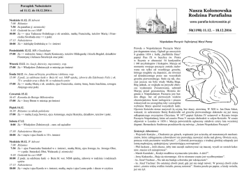 Porządek Nabożeństw od 11.12. do 18.12.2016 r. Niedziela 11.12. III Adwent 7:00 Różaniec 7:30 Za parafian (j. niemiecki) 9:30 Godzinki ku czci NMP 10:00 Za ++ ojca Tadeusza Osińskiego z ok urodzin, matkę Franciszkę, teściów Marię i Franciszka Swoboda oraz ++ z pokr. 17:15 Nabożeństwo 18:00 Za + Adelajdę Grabińską w 1 r. śmierci Poniedziałek 12.12. MB z Guadalupe 17:00 Za ++ rodziców Annę i Józefa Konieczny, teściów Hildegardę i Józefa Bogdoł, dziadków Florentynę i Juliusza Strzelczyk oraz pokr. Wtorek 13.12. św. Łucji, dziewicy, męczennicy, wsp. 17:00 Za + Władysław Żołnierczyk w miesiąc po śmierci Środa 14.12. św. Jana od krzyża, prezbitera i doktora, wsp. 15:00 Z podz. za odebrane łaski o Boże bł. wst. NMP opiekę, zdrowie dla Edeltrauty Felix z ok. 75 r. urodzin oraz o Boże bł. w rodzinach synów 17:00 Za ++ matkę Marię z ok. urodzin, ojca Franciszka, siostrę Annę, brata Joachima, szwagra Alojzego oraz pokr. Czwartek 15.12. 16:45 Koronka do Bożego Miłosierdzia 17:00 Za + Jerzy Ibrom w miesiąc po śmierci Piątek 16.12. 16:30 Różaniec za młode pokolenie 17:00 Za ++ matkę Łucję Sowicz, ojca Antoniego, męża Henryka, dziadków, teściów i pokr. Sobota 17.12. 8:00 Za + Władysław Żołnierczyk - zam. od sąsiadów ——–—–——–——————–—————–—–——–—————— 17:30 Nabożeństwo Maryjne 18:00 Za + męża i ojca Józefa w 10 r. śmierci Niedziela 18.12. IV Adwent 7:00 Różaniec 7:30 Za + ojca Franciszka Smieskol w r. śmierci., matkę Różę, ojca Jerzego, ks. Jerzego Obst, ++ z pokr. Smieskol, Obst, Wałaszek (j. niemiecki) 9:30 Godzinki ku czci NMP 10:00 Z podz. za odebrane łaski o Boże bł. wst. NSM opiekę, zdrowie w rodzinie i rodzinach synów 17:15 Nabożeństwo 18:00 Za + męża i ojca Karola w r. śmierci, matkę, męża i ojca Leona pokr. i dusze w czyśćcu Nasza Kolonowska Rodzina Parafialna www.parafia-kolonowskie.pl 50(1198) 11.12. – 18.12.2016 Niepokalane Poczęcie Najświętszej Maryi Panny Prawda o Niepokalanym Poczęciu Maryi jest dogmatem wiary. Ogłosił go uroczyście 8 grudnia 1854 r. bullą „Ineffabilis Deus” papież Pius IX w bazylice św. Piotra w Rzymie w obecności 54 kardynałów i 140 arcybiskupów i biskupów. Maryja od momentu swojego poczęcia została zachowana nie tylko od wszelkiego grzechu, którego mogłaby się dopuścić, ale również od dziedziczonego przez nas wszystkich grzechu pierworodnego. Stało się tak, chociaż jeszcze nie była wtedy Matką Boga. Bóg jednak, ze względu na przyszłe zbawcze wydarzenie Zwiastowania, uchronił Maryję przed grzesznością. Historia dogmatu o Niepokalanym Poczęciu jest bardzo długa. Już od pierwszych wieków chrześcijaństwa liczni teologowie i pisarze wskazywali na szczególną rolę i szczególne wybranie Maryi spośród wszystkich ludzi. Ojcowie Kościoła nieraz nazywali Ją czystą, bez skazy, niewinną. W XIII w. Jan Duns Szkot, wskazał, że uchronienie Bożej Rodzicielki od grzechu pierworodnego dokonało się już mocą odkupieńczego zwycięstwa Chrystusa. W 1477 papież Sykstus IV ustanowił w Rzymie święto Poczęcia Niepokalanej, które od czasów Piusa V zaczęto obchodzić w całym Kościele. W czasie objawień w Lourdes w 1858 r. Maryja potwierdziła ogłoszony zaledwie cztery lata wcześniej dogmat. Bernardecie Soubirous przedstawiła się mówiąc: „Jestem Niepokalane Poczęcie”. Sentencje Adwentowe: - Wojciech Kurtyka „ Chodzenie po górach, wspinanie jest ucieczką od monotonnych mechanizmów, które zabieganemu człowiekowi nie pozwalają zauważyć nieba nad głową. Otwiera oczy, porusza wiele poziomów wrażliwości”. „ Człowiek powracający z trudnej górskiej eskapady jest istotą mądrzejszą, spokojniejszą i promieniującą wewnętrznie”. - Phil Jackson „ Jeśli chcesz, żeby inni zaczęli zachowywać się inaczej, wyszli ze swoich kokonów, musisz ich zainspirować”. - Marek Kamiński „ Kiedyś modlitwa wyznaczała rytm dnia. A dziś?”. - Jerzy Kukuczka „ Boję się nieznanego. Ale to nieznane często jest wyolbrzymiane”. - ks. Józef Tischner „ Nic tak nie buduje człowieka jak wdzięczność”. - ks. Józef Tischner: Do ostatniej chwili pisał, gdy już nie mógł mówić. W pewnej chwili cicho mówi „siostro widzę wielkie światło, proszę notować”. Siostra poszła po papier, a kiedy wróciła, już nie żył. 50/2016 Zaproszenie: * Od I Niedzieli Adwentu do II Święta Wielkanocy, w domu, w jakimś miejscu postawmy słoiczek Panama, do którego przez ten czas można wrzucać ofiary. Jeśli z czegoś dla siebie zrezygnujemy, to można wrzucić tam wartość rzeczy, przyjemności z której, ktoś zrezygnował (np. ktoś zrezygnuje z kupna czekolady, paczki papierosów, itp. i taka to wartość, zostaje ofiarą do słoiczka). W II Dzień Wielkanocy będzie przeprowadzona przed młodzież akcja „ Panama - dyngus”, i słoiki (z ofiarami) zostaną zebrane. W wejściu do kościoła jest skarbonka, z której ofiary przeznaczamy na akcję - Panama 2019. * W połowie grudnia, ukaże się książka „Camino. Nowe Drogi”. . Po Pasterce i w I dzień Świąt, będzie można książkę nabywać. Ewentualne zyski przeznaczone zostaną na ten sam cel Zapraszamy, każdego (również gimnazjalistów) kto chce włączyć się do Naszej Grupy i robić „Raban” przez spotkania, pomysły, modlitwę, prace, zbiórki. Przyjdź do Nas na Facebooku strona (fanpage) „Kajakiem do Panamy”. Tam można przystanąć nad cytatem adwentowym, pomyśleć i wg. uznania dokończyć. Tam też licytacja „Aniołka z drzewa oliwnego, wykonanego przez chrześcijan z Betlejem”. Licytacja jest wirtualna, ale ofiara z niej na Panamę, ma być jak najbardziej realna. Na razie ofiarowana suma150 zł. Propozycja: Wyjazd większych grup, planowany jest z dużym wyprzedzeniem, dlatego jeśli ktoś jest zainteresowany wyjazdem, to do 22 grudnia prosz