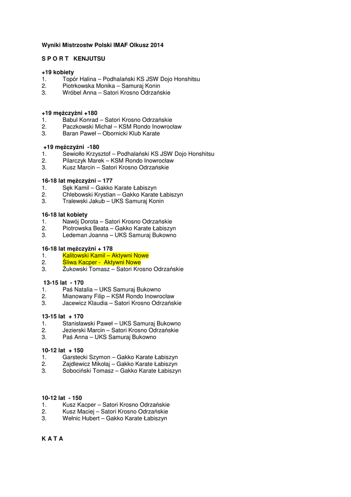 Wyniki Mistrzostw Polski IMAF Olkusz 2014 S P O R T KENJUTSU +19 kobiety 1. Topór Halina – Podhalański KS JSW Dojo Honshitsu 2. Piotrkowska Monika – Samuraj Konin 3. Wróbel Anna – Satori Krosno Odrzańskie +19 mężczyźni +180 1. Babul Konrad – Satori Krosno Odrzańskie 2. Paczkowski Michał – KSM Rondo Inowrocław 3. Baran Paweł – Obornicki Klub Karate +19 mężczyźni -180 1. Sewiołło Krzysztof – Podhalański KS JSW Dojo Honshitsu 2. Pilarczyk Marek – KSM Rondo Inowrocław 3. Kusz Marcin – Satori Krosno Odrzańskie 16-18 lat mężczyźni – 177 1. Sęk Kamil – Gakko Karate Łabiszyn 2. Chlebowski Krystian – Gakko Karate Łabiszyn 3. Tralewski Jakub – UKS Samuraj Konin 16-18 lat kobiety 1. Nawój Dorota – Satori Krosno Odrzańskie 2. Piotrowska Beata – Gakko Karate Łabiszyn 3. Ledeman Joanna – UKS Samuraj Bukowno 16-18 lat mężczyźni + 178 1. Kalitowski Kamil – Aktywni Nowe 2. Śliwa Kacper - Aktywni Nowe 3. Żukowski Tomasz – Satori Krosno Odrzańskie 13-15 lat - 170 1. Paś Natalia – UKS Samuraj Bukowno 2. Mianowany Filip – KSM Rondo Inowrocław 3. Jacewicz Klaudia – Satori Krosno Odrzańskie 13-15 lat + 170 1. Stanisławski Paweł – UKS Samuraj Bukowno 2. Jezierski Marcin – Satori Krosno Odrzańskie 3. Paś Anna – UKS Samuraj Bukowno 10-12 lat + 150 1. Garstecki Szymon – Gakko Karate Łabiszyn 2. Zajdlewicz Mikołaj – Gakko Karate Łabiszyn 3. Sobociński Tomasz – Gakko Karate Łabiszyn 10-12 lat - 150 1. Kusz Kacper – Satori Krosno Odrzańskie 2. Kusz Maciej – Satori Krosno Odrzańskie 3. Wełnic Hubert – Gakko Karate Łabiszyn KATA Kata synchroniczne do 19 lat 1. Dolata Zuzanna Damian Górski Marta Dziewałtowicz - Gakko Karate Łabiszyn 2. Głowacki Dominik Leon Staszak Eugeniusz Barczak – Inowrocławski Klub Sportowy Karate (3) 3. Wabiszewska Karina Rutkowska Joanna Ukleja Paulina – Inowrocławski Klub Sportowy Karate (2) Kata synchroniczne +16 1. Dawid Górzyński Ryszard Piskowski Anna Thomas – Aktywni Nowe 2. Dolata Zuzanna Chlebowski Krystian Piotrkowska Beata – Gakko Karate Łabiszyn 3. Konstancja Kujawa Czarniak Natalia Zadka Agnieszka – Inowrocławski Klub Sportowy Karate (1) Seniorzy 1. Piskorski Ryszard – Aktywni Nowe 2. Michalik Grzegorz – Dynamic Poznań 3. Baran Paweł – Obornicki Klub Karate Seniorki 1. Thomas Anna – Aktywni Nowe 2. Zadka Agnieszka – Inowrocławski Klub Sportowy Karate 3. Gniadek Kamila – Dojo Toruń Juniorzy 1. Faust Erik – IMAS Kraków 2. Chlebowski Krystian – Gakko Łabiszyn 3. Kalitowski Kamil – Aktywni Nowe Juniorki 1. Czarniak Natalia – Inowrocławski Klub Sportowy Karate 2. Piotrowska Beata – Gakko Karate Łabiszyn 3. Konstancja Kujawa – Inowrocławski Klub Sportowy Karate Kat Kadetki 13-15 lat 1. Dolata Zuzanna – Gakko Karate Łabiszyn 2. Rutkowska Joanna – Inowrocławski Klub Sportowy Karate 3. Dziewiałtowska Marta – Gakko Karate Łabiszyn Kat kadeci 13-15 lat 1. Górzyński Dawid – Aktywni Nowe 2. Skrzeczkowski Filip – Dojo Toruń 3. Bruckman Andrzej – IMAS Kraków Kat Młodziczki 10-12 lat 1. Racławska Beata – Aktywni Nowe 2. Wabiszewska Karina – Inowrocławski Klub Sportowy Karate 3. Korpalska Roksana – Dojo Toruń Kat Młodzicy 10-12 lat 1. Staszak Leon – Inowrocławski Klub Sportowy Karate 2. 3. Raszka Mieszko – Aktywni Nowe Głowacki Dominik – Inowrocławski Klub Sportowy Karate Jujitsu Mixed Kumite Seniorki +16 -60 kg 1. Nawój Dorota – Satori Krosno Odrzańskie 2. Wróbel Anna – Satori Krosno Odrzańskie 3. Ledeman Joanna - UKS Samuraj Bukowno Senior +19 -91 kg 1. Pasecki Krzysztof – Zielonogórskie Centrum JJ 2. Babul Konrad – Satori Krosno Odrzańskie 3. Kiełbik Artur - SJSW Łódź Senior +19 +91 kg 1. Żukowski Karol – Zielonogórskie Centrum JJ 2. Kostrzewa Łukasz - SJSW Łódź 3. Smela Łukasz – Ruda Śląska Senior +19 -77 kg 1. Stacha Przemysław – Shogun Mysłowice 2. Miłowicki Damian – UKS Samuraj Bukowno 3. Bartoszewski Łukasz – Satori Krosno Odrzańskie 4. Żok Damian – Ruda Śląska Grappling 10-12 młodzicy -40 kg 1. Mazy Bartosz – UKS Samuraj Bukowno 2. Ledeman Grzegorz – UKS Samuraj Bukowno Grappling 10-12 młodzicy -45 kg 1. Sęk Dawid – UKS Samuraj Bukowno 2. Zygmunt Krzysztof – UKS Samuraj Bukowno 3. Bucki Bartosz – Shogun Mysłowice Grappling 10-12 młodzicy -50 kg 1. Sioła Karol – Shogun Mysłowice 2. Kurdys Oskar – Shogun Mysłowice 3. Jochymczyk Jan – PCSW Olkusz Grappling 10-12 młodzicy +55 kg 1. Zając Aleksander – UKS Samuraj Bukowno Grappling 10-12 młodzicy +70 kg 1. Błoński Tobiasz – Shogun Mysłowice 2. Nalberski Kacper – Shogun Mysłowice Grappling 10-12 młodziczki -40 kg 1. Makieła Karolina – Shogun Mysłowice 2. Makieła Katarzyna – Shogun Mysłowice 3. Sorek Paulina – Shogun Mysłowice Kadetki 13-15 lat -59 kg 1. Paś Anna – UKS Samuraj Bukowno 2. Zygmunt Zofia – UKS Samuraj Bukowno 3. Wojtaszek Maja – UKS Samuraj Bukowno Kadetki 13-15 lat -66 kg 1. Paś Natalia – UKS Samuraj Bukowno 2. Grawon Aleksandra – UKS Samuraj Bukowno 3. Jacewicz Klaudia – Satori Krosno Odrzańskie Kadetki 13-15 lat -52 kg 1. Białecka Julia – PCSW Olkusz 2. Sorek Małgorzata – Shogun Mysłowice 3. Kasprzyk Julia – UKS Samuraj Bukowno Kadet 13-15 lat -52 kg 1. Górski Tomasz -PCSW Olkusz 2. Hajduła Kamil – UKS Samuraj Bukowno 13-15 lat -58 kg 1. Swędrowski Paweł – Ruda Śląska 2. Stanisławski Paweł – UKS Samuraj Bukowno 3. Jochemczyk Kamil – Shogun Mysłowice Junior 16-18 lat -79 kg 1. Mądrala Dawid – Shogun Mysłowice 2. Imański Kamil KSW Bushido Żychlin 3. Wócik Piotr – Shogun Myslowice Junior 16-18 lat +86 kg 1. Gąsior Sebastian – Shogun Mysłowice 2. Maciulewicz Marcin – Ruda Śląska 3. Sońko Kacper – Zielonogórskie Centrum JJ Ju Jitsu Mixed Kumite 13-15 lat -66 kg 1. Jezierski Marcin – Satori Krosno Odrzańskie 2. Mulawa Marcin – Zielonogórskie Centrum JJ 3. Plichta Antoni – Zielo