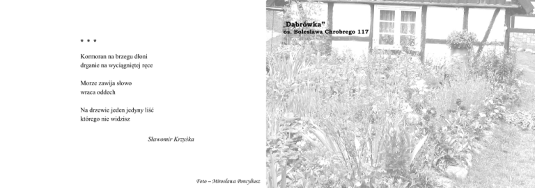 „Dąbrówka” os. Bolesława Chrobrego 117 * * * Kormoran na brzegu dłoni drganie na wyciągniętej ręce Morze zawija słowo wraca oddech Na drzewie jeden jedyny liść którego nie widzisz Sławomir Krzyśka Foto – Mirosława Poncyliusz K LUB L ITERACKI „D ĄBRÓWKA ” – P IĄTKOWSKIE C ENTRUM K ULTURY PSM. 10 V 2016 o godz. 1800 (wtorek) 7 VI 2016 o godz. 1800 (wtorek) Nowe książki w Klubie. Maciej Porzycki – „Zakres”, Jolanta Skamarska – „półgłosem”. Omówienie Piotr Bagiński, Stanisław Szwarc. 24 V 2016 o godz. 1800 (wtorek) W 60 rocznicę Poznańskiego Czerwca zapraszamy do wspomnień i czytania wierszy o Powstaniu 1956. Brygida Mielcarek prezentuje nową książkę pt. „W granicach rzeczywistości”, omawia Paweł Kuszczyński. 12 VI 2016 o godz. 1800 (wtorek) Prof. dr hab. Lech W. Szajdak – Grupa poetycka „Wołyń” – tradycje, kontynuacje, wydawnictwa. Najmłodsza poezja polska – wiersze czyta Patryk Nadolny. Piszemy dla dzieci… Twórczość Aldony Latosik, Stanisława Romaniuka, Barbary Tylman. Recenzja – Jolanta Szwarc. Zapraszamy do publikacji w „Protokole Kulturalnym”. Spotkania w „Dąbrówce”, os. Bolesława Chrobrego 117. Prowadzi Jerzy Grupiński.