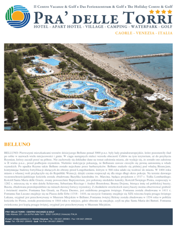 BELLUNO BELLUNO: Pierwszymi mieszkańcami terenów dzisiejszego Belluno ponad 3000 p.n.e. były ludy praindoeuropejskie, które pozostawiły ślad po sobie w nazwach wielu miejscowości i gmin. W ciągu następnych stuleci wzrosła obecność Celtów na tym terytorium, aż do przybycia Rzymian, którzy zaczęli przeć na północ. Nie zachowały się dokładne dane na temat założenia miasta, ale wydaje się, że zostało one założona w II wieku p.n.e., przed podbojem rzymskim. Niektóre inskrypcje pokazują, że Bellunum zawsze cieszyło się pewną autonomią u władz rzymskich. Po upadku Rzymu także Belluno zostało najechane przez barbarzyńców. Belluno znalazło się później pod władzą Bizancjum, kontynuując budowę fortyfikacji służących do obrony przed Longobardami, którym w 568 roku udało się wedrzeć do miasta. W 1404 roku miasto z własnej woli przyłączyło się do Republiki Wenecji, dzięki czemu rozpoczął się dla niego długi okres pokoju. Na terenie dawnego wczesnochrześcijańskiego kościoła została zbudowana Bazylika katedralna św. Marcina, będąca projektem z 1517 r. Tullia Lombardiego; Kościół Santa Maria delle Grazie, zwany powszechnie Baptysterium, jest położony niedaleko katedry; Kościół Świętego Piotra, rozpoczęty w 1282 r, mieszczą się w nim dzieła Schiavona, Sebastiana Ricciego i Andrei Brustolona; Brama Dojona, biorąca imię od pobliskiej baszty; Baszta, zbudowana prawdopodobnie na ruinach dawnej fortecy rzymskiej. Z chodników strzeleckich starej baszty można obserwować grubość i świetność murów; Fontanna San Gioatà, na Piazza Duomo, jest ozdobiona posągiem świętego. Fontanna została zbudowana w 1411 r; Fontanna San Lucano znajduje się na Piazza delle Erbe (1318 - 1410, na szczycie fontanny znajduje się XIX-wieczna kopia posągu świętego Lukana, oryginał jest przechowywany w Muzeum Miejskim w Belluno; Fontanna świętej Heleny została zbudowana w 1554 roku w pobliżu kościoła św Piotra, została przeniesiona w 1844 roku w miejsce, gdzie obecnie się znajduje, czyli na plac Santa Maria dei Battuti. Fontanna zwieńczona jest kopią posągu świętej, oryginał jest przechowywany w Muzeum Miejskim. PRA' DELLE TORRI - CENTRO VACANZE & GOLF Viale Altanea, 201 - Loc.tà Pra' delle Torri - 30021 CAORLE (Venezia) ITALIA E-mail: [email protected] - Centro Vacanze: Tel. +39 0421.299063 - Fax +39 0421.299035 Hotel: Tel. +39 0421.299445 - Golf: Tel./Fax +39 0421.299570 Powered by TCPDF (www.tcpdf.org)