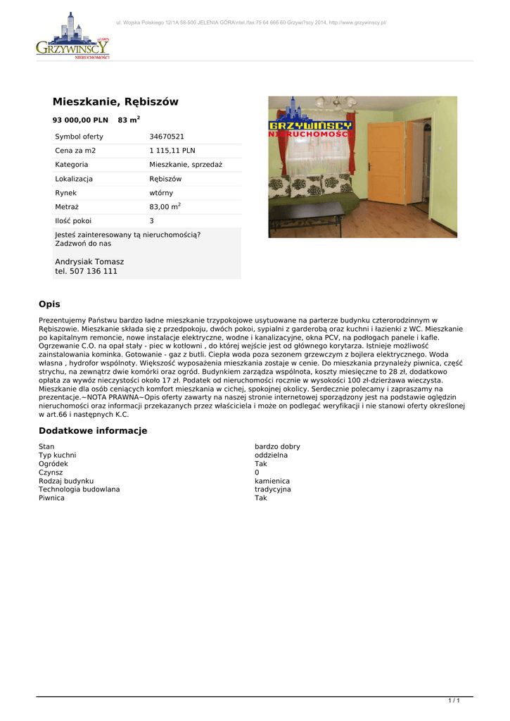 ul. Wojska Polskiego 12/1A 58-500 JELENIA GÓRA\ntel./fax:75 64 666 60 Grzywi?scy 2014, http://www.grzywinscy.pl/ Mieszkanie, Rębiszów 93 000,00 PLN 83 m2 Symbol oferty 34670521 Cena za m2 1 115,11 PLN Kategoria Mieszkanie, sprzedaż Lokalizacja Rębiszów Rynek wtórny Metraż 83,00 m2 Ilość pokoi 3 Jesteś zainteresowany tą nieruchomością? Zadzwoń do nas Andrysiak Tomasz tel. 507 136 111 Opis Prezentujemy Państwu bardzo ładne mieszkanie trzypokojowe usytuowane na parterze budynku czterorodzinnym w Rębiszowie. Mieszkanie składa się z przedpokoju, dwóch pokoi, sypialni z garderobą oraz kuchni i łazienki z WC. Mieszkanie po kapitalnym remoncie, nowe instalacje elektryczne, wodne i kanalizacyjne, okna PCV, na podłogach panele i kafle. Ogrzewanie C.O. na opał stały - piec w kotłowni , do której wejście jest od głównego korytarza. Istnieje możliwość zainstalowania kominka. Gotowanie - gaz z butli. Ciepła woda poza sezonem grzewczym z bojlera elektrycznego. Woda własna , hydrofor wspólnoty. Większość wyposażenia mieszkania zostaje w cenie. Do mieszkania przynależy piwnica, część strychu, na zewnątrz dwie komórki oraz ogród. Budynkiem zarządza wspólnota, koszty miesięczne to 28 zł, dodatkowo opłata za wywóz nieczystości około 17 zł. Podatek od nieruchomości rocznie w wysokości 100 zł-dzierżawa wieczysta. Mieszkanie dla osób ceniących komfort mieszkania w cichej, spokojnej okolicy. Serdecznie polecamy i zapraszamy na prezentacje.~NOTA PRAWNA~Opis oferty zawarty na naszej stronie internetowej sporządzony jest na podstawie oględzin nieruchomości oraz informacji przekazanych przez właściciela i może on podlegać weryfikacji i nie stanowi oferty określonej w art.66 i następnych K.C. Dodatkowe informacje Stan Typ kuchni Ogródek Czynsz Rodzaj budynku Technologia budowlana Piwnica bardzo dobry oddzielna Tak 0 kamienica tradycyjna Tak 1/1 Powered by TCPDF (www.tcpdf.org)