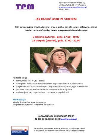 Towarzystwo Pomocy Młodzieży ul. Nowolipki 2, 00-160 Warszawa www.tpm.org.pl, [email protected] 22 887 88 05 JAK RADZIĆ SOBIE ZE STRESEM Jeśli potrzebujesz chwili oddechu, chcesz zrobić coś dla siebie, zatrzymać się na chwilę, zachować spokój pomimo wyzwań dnia codziennego 9 sierpnia (wtorek), godz. 17.00 - 20.00 23 sierpnia (wtorek), godz. 17.00 - 20.00 Podczas zajęć: • zatrzymasz się w „tu i teraz” • nawiążesz kontakt ze swoim ciałem poprzez oddech, ruch i taniec • dzięki wizualizacji skontaktujesz się ze swoim sercem i jego potrzebami • poznasz metody radzenia sobie ze stresem i napięciem • zrelaksujesz się, odpoczniesz i poznasz nowych ludzi PROWADZĄCE: Monika Szeliga - trenerka, terapeutka Małgorzata Wojdowska – trenerka, terapeutka NA WARSZTATY OBOWIĄZUJĄ ZAPISY 22 887 88 05, 508 350 320 [email protected], Szczególnie zapraszamy osoby w wieku do 35 lat biorące udział w programie „Pomoc młodym osobom z niepełnosprawnością”