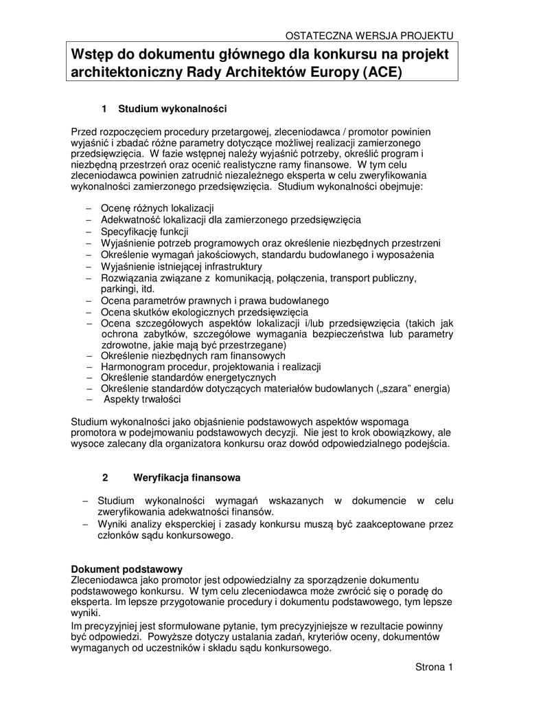 OSTATECZNA WERSJA PROJEKTU Wstęp do dokumentu głównego dla konkursu na projekt architektoniczny Rady Architektów Europy (ACE) 1 Studium wykonalności Przed rozpoczęciem procedury przetargowej, zleceniodawca / promotor powinien wyjaśnić i zbadać różne parametry dotyczące możliwej realizacji zamierzonego przedsięwzięcia. W fazie wstępnej należy wyjaśnić potrzeby, określić program i niezbędną przestrzeń oraz ocenić realistyczne ramy finansowe. W tym celu zleceniodawca powinien zatrudnić niezależnego eksperta w celu zweryfikowania wykonalności zamierzonego przedsięwzięcia. Studium wykonalności obejmuje: − − − − − − − − − − − − − − − Ocenę różnych lokalizacji Adekwatność lokalizacji dla zamierzonego przedsięwzięcia Specyfikację funkcji Wyjaśnienie potrzeb programowych oraz określenie niezbędnych przestrzeni Określenie wymagań jakościowych, standardu budowlanego i wyposażenia Wyjaśnienie istniejącej infrastruktury Rozwiązania związane z komunikacją, połączenia, transport publiczny, parkingi, itd. Ocena parametrów prawnych i prawa budowlanego Ocena skutków ekologicznych przedsięwzięcia Ocena szczegółowych aspektów lokalizacji i/lub przedsięwzięcia (takich jak ochrona zabytków, szczegółowe wymagania bezpieczeństwa lub parametry zdrowotne, jakie mają być przestrzegane) Określenie niezbędnych ram finansowych Harmonogram procedur, projektowania i realizacji Określenie standardów energetycznych Określenie standardów dotyczących materiałów budowlanych („szara” energia) Aspekty trwałości Studium wykonalności jako objaśnienie podstawowych aspektów wspomaga promotora w podejmowaniu podstawowych decyzji. Nie jest to krok obowiązkowy, ale wysoce zalecany dla organizatora konkursu oraz dowód odpowiedzialnego podejścia. 2 Weryfikacja finansowa − Studium wykonalności wymagań wskazanych w dokumencie w celu zweryfikowania adekwatności finansów. − Wyniki analizy eksperckiej i zasady konkursu muszą być zaakceptowane przez członków sądu konkursowego. Dokument podstawowy Zleceniodawca jako promotor jest odpowiedzialny za sporządzenie dokumentu podstawowego konkursu. W tym celu zleceniodawca może zwrócić się o poradę do eksperta. Im lepsze przygotowanie procedury i dokumentu podstawowego, tym lepsze wyniki. Im precyzyjniej jest sformułowane pytanie, tym precyzyjniejsze w rezultacie powinny być odpowiedzi. Powyższe dotyczy ustalania zadań, kryteriów oceny, dokumentów wymaganych od uczestników i składu sądu konkursowego. Strona 1 OSTATECZNA WERSJA PROJEKTU Na podstawie studium wykonalności, dokument podstawowy określa realistyczne parametry i definiuje szczegółowy program. Wnioski ze studium wykonalności winny mieć odzwierciedlenie w dokumencie podstawowym konkursu. Prace oczekiwane od uczestników winny być odpowiednie do zadania i wystarczające do zrozumienia zgłoszenia. Od uczestników należy żądać tylko takich dokumentów, odnośnie których gwarantuje się profesjonalnie kompetentną ocenę. Dokument podstawowy konkursu powinien stwarzać jak najszersze możliwości realizacji zadania. Dokument podstawowy powinien określać skład sądu konkursowego. Sąd konkursowy musi zaakceptować dokument podstawowy. W szczególności, dokument podstawowy konkursu powinien zawierać: Przepisy proceduralne a) wskazanie zleceniodawcy b) określenie rodzaju konkursu i procedury c) oświadczenie co do odpowiedzialności w odniesieniu do przepisów d) odniesienie do postanowień prawa o zamówieniach publicznych e) warunki uczestnictwa i wskazanie terminu spełnienia wymagań oraz analogicznych warunków dotyczących zleceniodawcy w przypadku rozszerzenia grupy uczestników f) łączna suma nagród pieniężnych (nagrody oraz kwota maksymalna i warunki dla ewentualnych wyróżnień); informacje dotyczące sposobu obliczenia kwoty nagród oraz przybliżona liczba nagród, jakie mają być przyznane http://www.arching.at/preisgeldrechner/ g) zamiary zleceniodawcy co do sposobu dalszej pracy oraz rodzaju i zakresu wskazanego kontraktu h) przepisy proceduralne w przypadku nieporozumień i) nazwiska członków sądu konkursowego, ich ewentualnych zastępców oraz wyznaczonych ekspertów j) nazwiska wybranych i/lub zaproszonych uczestników k) harmonogram zakończenia konkursu (termin rejestracji zgłoszeń, termin do zadawania pytań i udzielania odpowiedzi, termin i miejsce składania zgłoszeń konkursowych) l) spis dokumentów dostarczonych uczestnikom m) lista prac wymaganych od uczestników i specyfikacje dotyczące prezentacji przedsięwzięcia n) rodzaj kodu identyfikacyjnego dla wszystkich dokumentów zgłoszeniowych w konkursie oraz obowiązek podania nazwiska autora (autorów) i ich współpracowników w anonimowej kopercie Przepisy dotyczące sformułowania zadań a) krótki opis zadania w konkursie i wskazanie odnośnych dziedzin wiedzy eksperckiej, b) wiążące zasady winny być wskazane wyłącznie w bardzo jasnych kwestiach, gdzie inne rozwiązania są bezwzględnie wykluczone c) akceptacja wariantów d) kryteria oceny. ACE rekomenduje, żeby organizacje zawodowe na poziomie krajowym lub regionalnym doradzały i przedstawiały ocenę, czy dokument podstawowy konkursu jest zgodny z zasadami. Taka ocena powinna być odnotowana w podstawowym dokumencie konkursowym. Strona 2 OSTATECZNA WERSJA PROJEKTU Pytania i odpowiedzi Do wskazanego terminu uczestnicy mogą zadawać pytania dotyczące podstawowego dokumentu konkursu. Sąd konkursowy odpowiada na piśmie w imieniu zleceniodawcy, zbiera wszystkie pytania i odpowiedzi w ustalonym czasie w postaci dokumentu dostępnego (przesyłanego) wszystkim uczestnikom. Wezwanie do składania ofert w procedurze konkursowej jest prośbą o zawarcie umowy. Biorąc udział, uczestnik akceptuje prośbę i zawiera kontrakt. Podstawowy dokument konkursowy oraz dokument z odpowiedziami na pytania uczestników stanowią podstawowe dokum