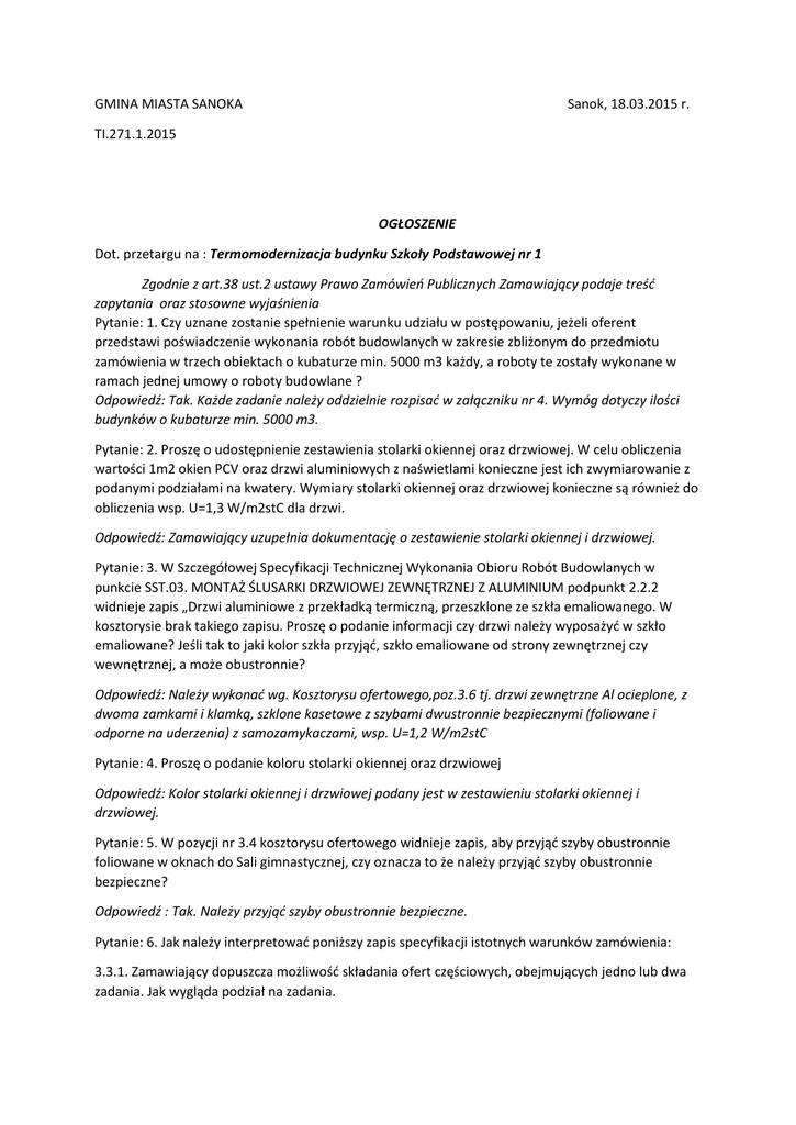 GMINA MIASTA SANOKA Sanok, 18.03.2015 r. TI.271.1.2015 OGŁOSZENIE Dot. przetargu na : Termomodernizacja budynku Szkoły Podstawowej nr 1 Zgodnie z art.38 ust.2 ustawy Prawo Zamówień Publicznych Zamawiający podaje treść zapytania oraz stosowne wyjaśnienia Pytanie: 1. Czy uznane zostanie spełnienie warunku udziału w postępowaniu, jeżeli oferent przedstawi poświadczenie wykonania robót budowlanych w zakresie zbliżonym do przedmiotu zamówienia w trzech obiektach o kubaturze min. 5000 m3 każdy, a roboty te zostały wykonane w ramach jednej umowy o roboty budowlane ? Odpowiedź: Tak. Każde zadanie należy oddzielnie rozpisać w załączniku nr 4. Wymóg dotyczy ilości budynków o kubaturze min. 5000 m3. Pytanie: 2. Proszę o udostępnienie zestawienia stolarki okiennej oraz drzwiowej. W celu obliczenia wartości 1m2 okien PCV oraz drzwi aluminiowych z naświetlami konieczne jest ich zwymiarowanie z podanymi podziałami na kwatery. Wymiary stolarki okiennej oraz drzwiowej konieczne są również do obliczenia wsp. U=1,3 W/m2stC dla drzwi. Odpowiedź: Zamawiający uzupełnia dokumentację o zestawienie stolarki okiennej i drzwiowej. Pytanie: 3. W Szczegółowej Specyfikacji Technicznej Wykonania Obioru Robót Budowlanych w punkcie SST.03. MONTAŻ ŚLUSARKI DRZWIOWEJ ZEWNĘTRZNEJ Z ALUMINIUM podpunkt 2.2.2 widnieje zapis „Drzwi aluminiowe z przekładką termiczną, przeszklone ze szkła emaliowanego. W kosztorysie brak takiego zapisu. Proszę o podanie informacji czy drzwi należy wyposażyć w szkło emaliowane? Jeśli tak to jaki kolor szkła przyjąć, szkło emaliowane od strony zewnętrznej czy wewnętrznej, a może obustronnie? Odpowiedź: Należy wykonać wg. Kosztorysu ofertowego,poz.3.6 tj. drzwi zewnętrzne Al ocieplone, z dwoma zamkami i klamką, szklone kasetowe z szybami dwustronnie bezpiecznymi (foliowane i odporne na uderzenia) z samozamykaczami, wsp. U=1,2 W/m2stC Pytanie: 4. Proszę o podanie koloru stolarki okiennej oraz drzwiowej Odpowiedź: Kolor stolarki okiennej i drzwiowej podany jest w zestawieniu stolarki okiennej i drzwiowej. Pytanie: 5. W pozycji nr 3.4 kosztorysu ofertowego widnieje zapis, aby przyjąć szyby obustronnie foliowane w oknach do Sali gimnastycznej, czy oznacza to że należy przyjąć szyby obustronnie bezpieczne? Odpowiedź : Tak. Należy przyjąć szyby obustronnie bezpieczne. Pytanie: 6. Jak należy interpretować poniższy zapis specyfikacji istotnych warunków zamówienia: 3.3.1. Zamawiający dopuszcza możliwość składania ofert częściowych, obejmujących jedno lub dwa zadania. Jak wygląda podział na zadania. Odpowiedź: Zamawiający poprawia błąd pisarski w specyfikacji istotnych warunków zamówienia. Po poprawce pkt. 3.3.1 otrzymuje brzmienie : 3.3.1. Zamawiający nie dopuszcza możliwości składania ofert częściowych. Pytanie: 7. Proszę o uzupełnienie dokumentacji o zestawienie stolarki. Odpowiedź: Zamawiający uzupełnia dokumentację o zestawienie stolarki okiennej i drzwiowej Pytanie: 8. Proszę o uściślenie ilości grzejników, gdyż w pozycji 4.4 przedmiaru są przewidziane 155 kpl, natomiast zaworów jest 340 sztuk. Odpowiedź : Wymianie podlegają grzejniki typu FAVIER 155 kpl. na grzejniki stalowe dwupłytowe lub konwektorowe. Wymianie podlega 340 szt. zaworów na termostatyczne. Pytanie: 9. Zwracamy się z uprzejmą prośbą o uzupełnienie na Waszej stronie dokumentacji technicznej w postaci rzutów poziomych kondygnacji SP nr 1 oraz przekrojów tych budynków. Jest to niezbędne w celu opracowania dokumentacji, właściwego doboru grzejników, a tym samym dokonanie prawidłowej wyceny. Za szybką odpowiedź z góry dziękujemy. Odpowiedź: Zamawiający zamieszcza rzuty i przekroje budynku szkoły, oraz dokumentację instalacji c.o. Pytanie:10.Zwracam się z prośbą o udostepnienie zestawienia grzejników podlegających wymianie oraz inwentaryzacji pomieszczeń z wykazem w których pomieszczeniach należy wymienić grzejnik a w których same zawory termostatyczne. Proszę również o przedłużenie terminu składania ofert. Odpowiedź: Zamawiający zamieszcza rzuty i przekroje budynku szkoły, oraz dokumentację instalacji c.o. Pytanie: 11. Proszę o podanie grupy koloru farby silikatowej w poz. 1.18 przedmiaru robót. Odpowiedź: Zamawiający uzupełnia dokumentację o rysunek kolorystyki. Pytanie: 12. W poz.2.4, 2.5 przedmiaru robót przyjęto gr. warstw wyrównawczych 3 cm- czy należy tak policzyć, czy zwiększyć krotność a poz. 2.5. (do ilu cm?) Odpowiedź: Zamawiający zamieszcza poprawiony kosztorys. Pytanie: 13. Proszę o udostępnienie zestawienia stolarki okiennej i drzwiowej. Jeżeli inwestor nie posiada to będzie wymagana inwentaryzacja. Odpowiedź: Zamawiający uzupełnia dokumentację o zestawienie stolarki okiennej i drzwiowej. Pytanie: 14. W elemencie 5 przedmiaru robót przyjęto 2x94,20 m3 wywiezienie gruzu na 2 km raz samochodem samowyładowczym i raz skrzyniowym. Czy tak ma zostać ? Odpowiedź: Zgodnie z zapisami w poprawionym kosztorysie Pytanie: 15. Czy utylizacja zdemontowanej stolarki okiennej i drzwiowej leży po stronie inwestora? Odpowiedź: zgodnie z zapisami w poprawionym kosztorysie Pytanie: 16. Czy w kosztorysie Inwestora załączonym do SIWZ zostały ujęte powierzchnie kominów w części nad dachem? Czy w zakres przedmiotu zamówienia wchodzi remont kominów? Jeśli tak to prosimy o podanie zakresu remontu kominów? Odpowiedź: Nie. W zakres przedmiotu zamówienia nie wchodzi remont kominów. Pytanie: 17. Czy ilość wykazana w przedmiarze rynien objętych wymianą nie jest za mała? Odpowiedź: Wymianie podlega ilość wskazana w kosztorysie. Pytanie: 18.Czy pokrycie dachu nie wchodzi w zakres zamówienia? Odpowiedź : Pokrycie dachu nie wchodzi w zakres zamówienia. Zgodnie z art. 38.1.4 ustawy Prawo zamówień publicznych Zamawiający zmienia treść specyfikacji istotnych warunków zamówienia. Zmianie podlegają następujące punkty specyfikacji istotnych