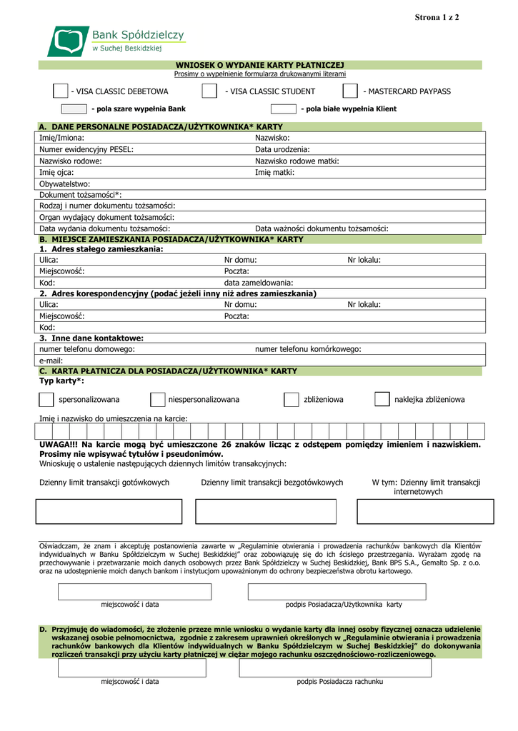 Strona 1 z 2 WNIOSEK O WYDANIE KARTY PŁATNICZEJ Prosimy o wypełnienie formularza drukowanymi literami - VISA CLASSIC DEBETOWA - VISA CLASSIC STUDENT - pola szare wypełnia Bank - MASTERCARD PAYPASS - pola białe wypełnia Klient A. DANE PERSONALNE POSIADACZA/UŻYTKOWNIKA* KARTY Imię/Imiona: Nazwisko: Numer ewidencyjny PESEL: Data urodzenia: Nazwisko rodowe: Nazwisko rodowe matki: Imię ojca: Imię matki: Obywatelstwo: Dokument tożsamości*: Rodzaj i numer dokumentu tożsamości: Organ wydający dokument tożsamości: Data wydania dokumentu tożsamości: Data ważności dokumentu tożsamości: B. MIEJSCE ZAMIESZKANIA POSIADACZA/UŻYTKOWNIKA* KARTY 1. Adres stałego zamieszkania: Ulica: Nr domu: Nr lokalu: Miejscowość: Poczta: Kod: data zameldowania: 2. Adres korespondencyjny (podać jeżeli inny niż adres zamieszkania) Ulica: Nr domu: Nr lokalu: Miejscowość: Poczta: Kod: 3. Inne dane kontaktowe: numer telefonu domowego: numer telefonu komórkowego: e-mail: C. KARTA PŁATNICZA DLA POSIADACZA/UŻYTKOWNIKA* KARTY Typ karty*: spersonalizowana niespersonalizowana zbliżeniowa naklejka zbliżeniowa Imię i nazwisko do umieszczenia na karcie: UWAGA!!! Na karcie mogą być umieszczone 26 znaków licząc z odstępem pomiędzy imieniem i nazwiskiem. Prosimy nie wpisywać tytułów i pseudonimów. Wnioskuję o ustalenie następujących dziennych limitów transakcyjnych: Dzienny limit transakcji gotówkowych Dzienny limit transakcji bezgotówkowych W tym: Dzienny limit transakcji internetowych Oświadczam, że znam i akceptuję postanowienia zawarte w „Regulaminie otwierania i prowadzenia rachunków bankowych dla Klientów indywidualnych w Banku Spółdzielczym w Suchej Beskidzkiej” oraz zobowiązuję się do ich ścisłego przestrzegania. Wyrażam zgodę na przechowywanie i przetwarzanie moich danych osobowych przez Bank Spółdzielczy w Suchej Beskidzkiej, Bank BPS S.A., Gemalto Sp. z o.o. oraz na udostępnienie moich danych bankom i instytucjom upoważnionym do ochrony bezpieczeństwa obrotu kartowego. miejscowość i data podpis Posiadacza/Użytkownika karty D. Przyjmuję do wiadomości, że złożenie przeze mnie wniosku o wydanie karty dla innej osoby fizycznej oznacza udzielenie wskazanej osobie pełnomocnictwa, zgodnie z zakresem uprawnień określonych w „Regulaminie otwierania i prowadzenia rachunków bankowych dla Klientów indywidualnych w Banku Spółdzielczym w Suchej Beskidzkiej” do dokonywania rozliczeń transakcji przy użyciu karty płatniczej w ciężar mojego rachunku oszczędnościowo-rozliczeniowego. miejscowość i data podpis Posiadacza rachunku Strona 2 z 2 WYPEŁNIA BANK Data przyjęcia wniosku stempel dzienny i podpis pracownika przyjmującego wniosek Karta wydana do rachunku (pełny numer) Nr karty Decyzja banku .............................................................................................................................................................................................................. .............................................................................................................................................................................................................. .............................................................................................................................................................................................................. .............................................................................................................................................................................................................. .............................................................................................................................................................................................................. miejscowość i data podpis i stempel /pieczątka imienna upoważnionego pracownika Adnotacje .............................................................................................................................................................................................................. .............................................................................................................................................................................................................. .............................................................................................................................................................................................................. .............................................................................................................................................................................................................. ..............................................................................................................................................................................................................