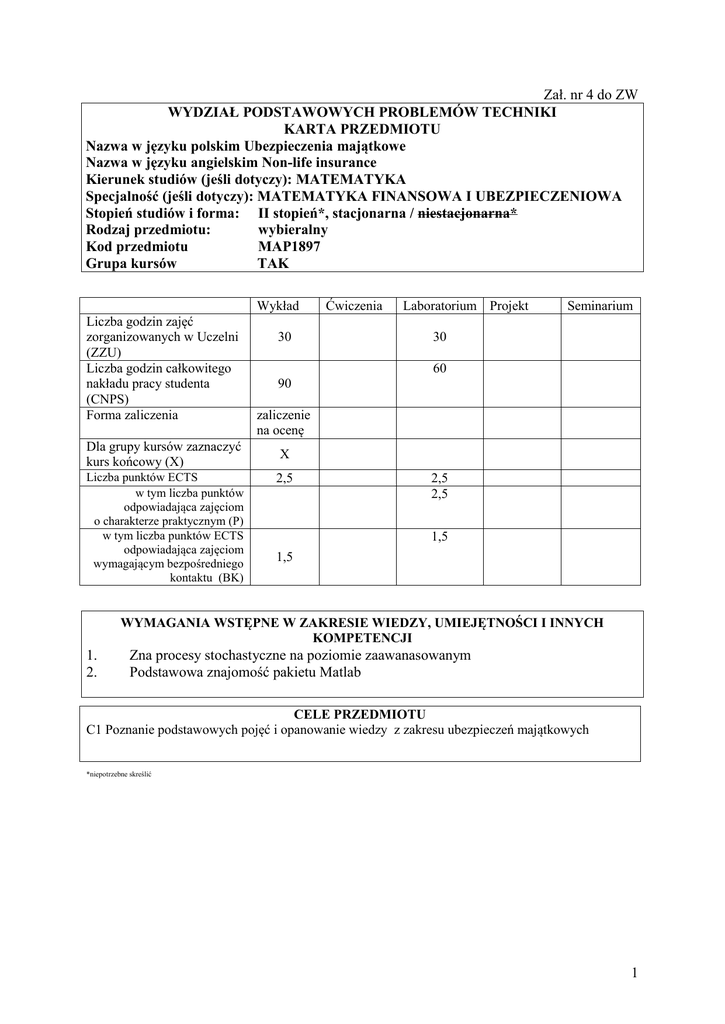 Zał. nr 4 do ZW WYDZIAŁ PODSTAWOWYCH PROBLEMÓW TECHNIKI KARTA PRZEDMIOTU Nazwa w języku polskim Ubezpieczenia majątkowe Nazwa w języku angielskim Non-life insurance Kierunek studiów (jeśli dotyczy): MATEMATYKA Specjalność (jeśli dotyczy): MATEMATYKA FINANSOWA I UBEZPIECZENIOWA Stopień studiów i forma: II stopień*, stacjonarna / niestacjonarna* Rodzaj przedmiotu: wybieralny Kod przedmiotu MAP1897 Grupa kursów TAK Wykład Liczba godzin zajęć zorganizowanych w Uczelni (ZZU) Liczba godzin całkowitego nakładu pracy studenta (CNPS) Forma zaliczenia Dla grupy kursów zaznaczyć kurs końcowy (X) Liczba punktów ECTS w tym liczba punktów odpowiadająca zajęciom o charakterze praktycznym (P) w tym liczba punktów ECTS odpowiadająca zajęciom wymagającym bezpośredniego kontaktu (BK) 30 Ćwiczenia Laboratorium Projekt Seminarium 30 60 90 zaliczenie na ocenę X 2,5 2,5 2,5 1,5 1,5 WYMAGANIA WSTĘPNE W ZAKRESIE WIEDZY, UMIEJĘTNOŚCI I INNYCH KOMPETENCJI 1. 2. Zna procesy stochastyczne na poziomie zaawanasowanym Podstawowa znajomość pakietu Matlab CELE PRZEDMIOTU C1 Poznanie podstawowych pojęć i opanowanie wiedzy z zakresu ubezpieczeń majątkowych *niepotrzebne skreślić 1 PRZEDMIOTOWE EFEKTY KSZTAŁCENIA Z zakresu wiedzy: PEK_W1 Zna najważniejsze twierdzenia i hipotezy z głównych działów matematyki PEK_W2 Zna podstawy modelownia stochastycznego w matematyce finansowej i aktuarialnej lub w naukach przyrodniczych, w szczególności fizyce, chemii lub biologii Z zakresu umiejętności: PEK_U1 potrafi konstruować modele matematyczne, wykorzystywane w konkretnych zaawansowanych zastosowaniach matematyki Z zakresu kompetencji społecznych: PEK_K1 potrafi samodzielnie wyszukiwać informacje w literaturze, także w językach obcych TREŚCI PROGRAMOWE Wy1 Wy2 Wy3 Wy4 Wy5 Wy6 Wy7 Wy8 Wy9 Wy10 Wy11 Wy12 Forma zajęć – wykłady Zasady ustalania składek. Funkcje użyteczności. Zasada zerowej użyteczności. Tw. Borcha o polisie optymalnej. Franszyzy i ich rodzaje. Wycena składki netto przy założeniu franszyzy. Model ryzyka kolektywnego. Parametry i rozkład zagregowanej wypłaty. Złożony rozkład Poissona. Twierdzenie o łączeniu ryzyk i jego zastosowania. Twierdzenie o dekompozycji złożonego rozkładu Poissona. Aproksymacja modelu indywidualnego. Klasa rozkładów (a,b). Wzory rekurencyjne. Mieszane procesy Poissona. Proces ryzyka w czasie ciągłym. Współczynnik dopasowania. Twierdzenia o prawdopodobieństwie ruiny. Rozkład maksymalnej zagregowanej wypłaty a prawdopodobieństwo ruiny. Wzór Pollaczka-Chinczyna. Aproksymacje prawdopodobieństwa ruiny w skończonym i nieskończonym czasie. Proces ryzyka w czasie dyskretnym. Współczynnik dopasowania. Twierdzenia o prawdopodobieństwie ruiny. Rodzaje reasekuracji proporcjonalnej i nieproporcjonalnej. Wzory rekurencyjne na składkę reasekuratora. Suma godzin Forma zajęć – laboratorium La1 Liczba godzin 2 2 2 2 2 2 2 4 4 2 2 4 30 Liczba godzin Ćwiczenia ilustrujące zagadnienia z wykładów Suma godzin 30 2 STOSOWANE NARZĘDZIA DYDAKTYCZNE 1. Wykład problemowy – metoda tradycyjna 2. Laboratorium komputerowe z użyciem pakietu Matlab OCENA OSIĄGNIĘCIA EFEKTÓW KSZTAŁCENIA Oceny (F – formująca (w trakcie semestru), P – podsumowująca (na koniec semestru) F1 F2 Numer efektu kształcenia Sposób oceny osiągnięcia efektu kształcenia PEK_W1 PEK_W2 PEK_K1 PEK_U1 PEK_K1 Egzamin Odpowiedzi ustne, kolokwia, kartkówki P=0.5*F1+0.5*F2 LITERATURA PODSTAWOWA I UZUPEŁNIAJĄCA LITERATURA PODSTAWOWA: [1] N. L. Bowers i inni, Actuarial Mathematics, The Society of Actuaries, Itasca, Illinois 1997. [2] W. Ostasiewicz (red.), Metody aktuarialne, Wyd. AE Wrocław, 2000. LITERATURA UZUPEŁNIAJĄCA: [1] S. Asmussen, Ruin Probabilities, World Scientific, 2000 [2] P. Cizek, W. Haerdle, R. Weron (red.), Statistical tools for finance and insurance, Springer, Berlin, 2011. [3] W. Otto, Ubezpieczenia majątkowe - Część I - Teoria ryzyka, WNT, Warszawa, 2004. [4] H. H. Panjer, G. E. Willmot, Insurance risk models, Society of Actuaries, 1992. OPIEKUN PRZEDMIOTU (IMIĘ, NAZWISKO, ADRES E-MAIL) Dr Krzysztof Burnecki ([email protected]) Dr Agnieszka Wyłomańska ([email protected]) 3 MACIERZ POWIĄZANIA EFEKTÓW KSZTAŁCENIA DLA PRZEDMIOTU UBEZPIECZNIA MAJĄTKOWE Z EFEKTAMI KSZTAŁCENIA NA KIERUNKU MATEMATYKA, 2 stopnia I SPECJALNOŚCI MATEMATYKA FINANSOWA I UBEZPIECZENIOWA Efekt kształcenia PEK_W1 PEK_W2 PEK_U1 PEK_K1 Odniesienie danego efektu do efektów kształcenia zdefiniowanych dla kierunku studiów K2MAT_W03 K2MAT_W09 K2MAT_U15 K2MAT_K06 Cele przedmiotu Treści programowe C1 C1 C1 C1 Wy1-Wy12 Wy1-Wy12 La1 Wy1-Wy12, La1 Numer narzędzia dydaktycznego Sposób oceny (z tabeli powyżej) 1 1 2 1,2 F1 F1 F2 F2