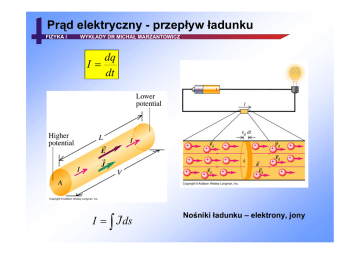 Prąd elektryczny - przepływ ładunku dq I= dt r I = ∫ J ds Nośniki ładunku – elektrony, jony Prawo Ohma U I= R R= ρL A Prąd elektryczny – model mikroskopowy Ve~106 m/s r r J = neVD VD~10-4 m/s Prąd elektryczny – model Drudego r r J =σ ⋅E rozpraszanie jest określone przez tzw. czas relaksacji τ Równanie ruchu: Teoria Drudego dobrze opisuje zjawisko oporu elektrycznego. Nie wyjaśnia wartości przewodności uzyskanych dla poszczególnych metali. Prąd elektryczny – model Blocha Elektrony są rozpraszane jedynie na niedoskonałościach sieci krystalicznej. Model poprawnie opisuje przewodność różnych metali i jej zależność temperaturową. Zależność temperaturowa przewodności ρ-ρ0=ρ0⋅α(T-T0) Oporność i elementy oporowe Moc i energia prądu elektrycznego Prawo Joule’a Q = I 2 ⋅ R ⋅t U2 P = UI = = RI 2 R Przy przesyłaniu energii elektrycznej należy zredukować prąd (co zmniejsza straty cieplne) Obwód elektryczny Siła elektromotoryczna (SEM) ε= dW dq Energia elektryczna jaką uzyskuje jednostkowy ładunek elektryczny w źródle prądu elektrycznego. Źródło energii: -chemiczne (baterie, ogniwa paliwowe) - mechaniczne (prądnica) -termoogniwa -fotoogniwa itp. Proste obwody Połączenie szeregowe Połączenie równoległe Prawa Kirchoffa I Prawo Kirchoffa Suma natężeń prądów dopływających do węzła jest równa sumie natężeń prądów wypływających z tego węzła II Prawo Kirchoffa Suma wartości sił elektromotorycznych występujących w obwodzie zamkniętym równa jest sumie wartości spadków napięcia na elementach tego obwodu (dla prądu zmiennego – na elementach pasywnych obwodu). Instalacje elektryczne Pomiar natężenia i napięcia