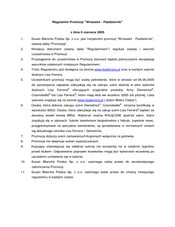 Regulamin Promocji "Wrzesie - Pa dziernik" z dnia 6 czerwca 2005 1. Susan Blanche Polska Sp. z o.o. jest inicjatorem promocji "Wrzesie - Pa dziernik", zwanej dalej "Promocj ". 2. Niniejszy dokument (zwany dalej "Regulaminem") reguluje zasady i warunki uczestnictwa w Promocji. 3. Przyst pienie do uczestnictwa w Promocji stanowi b dzie jednocze nie akceptacj warunków ustalonych niniejszym Regulaminem. 4. Tre Regulaminu jest dost pna na stronie www.lisaferrera.pl oraz w ka dym salonie lubnym Lisa Ferrera. 5. Uczestnikami promocji mog by osoby pełnoletnie, które w okresie od 06.06.2005 do wyczerpania zapasów zdecyduj lubnych Ferrera® Lisa si oferuj cych na zakupu sukni lubnej w sieci salonów oryginalne Cosmobella® lub Lisa Ferrera®, które maj produkty firmy Demetrios®, lub we wrze niu 2005 lub pó niej. Lista salonów znajduje si na stronie www.lisaferrera.pl („Salon Blisko Ciebie”). 6. Osoba, która dokona zakupu sukni Demetrios®, Cosmobella® otrzyma bonifikat w wysoko ci 600zł. Osoba, która zdecyduje si na zakup sukni Lisa Ferrera® ! "# $ % & ) ')* $ $ . . + ,' $ ' . ) & & /$ 0 % - + $ Promocja dotyczy sukni zamawianych/kupionych wył cznie za gotówk . 8. Promocja nie obejmuje sukien wypo yczanych. 9. Kupuj cy zobowi zuje si sukni & ( + 7. odebra ( ( ' ( $* $ 12 $' nie wcze niej ni w ostatnim tygodniu przed lubem. Odpowiednie poprawki krawieckie mog by wykonane wcze niej po uprzednim umówieniu si w salonie. 10. Susan Blanche Polska Sp. z o.o. zastrzega sobie prawo do wcze niejszego zako czenia Promocji. 11. Susan Blanche Polska Sp. z o.o. zastrzega sobie prawo do zmiany niniejszego regulaminu w ka dym czasie.