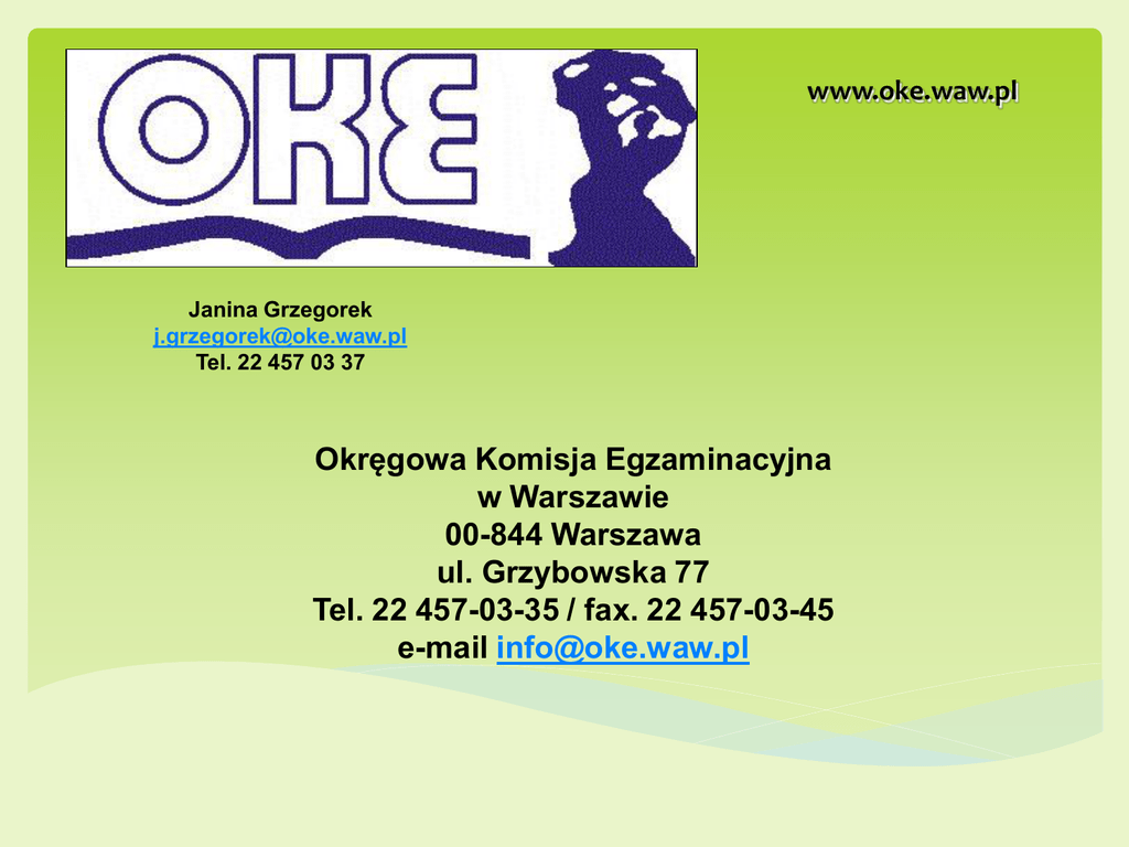 www.oke.waw.pl Janina Grzegorek [email protected] Tel. 22 457 03 37 Okręgowa Komisja Egzaminacyjna w Warszawie 00-844 Warszawa ul. Grzybowska 77 Tel. 22 457-03-35 / fax. 22 457-03-45 e-mail [email protected] WYNIKI EGZAMINU MATURALNEGO W WOJEWÓDZTWIE MAZOWIECKIM W 2012 ROKU Egzamin maturalny przeprowadzono w 1047 szkołach dla 59177 zdających. Typ szkoły Liczba zdających, którzy przystąpili do egzaminu maturalnego w poszczególnych typach szkół (wszyscy) pierwszy lub kolejny raz pierwszy raz pierwszy raz i zdawali wszystkie egzaminy obowiązkowe Liceum ogólnokształcące 38 756 32 143 31 827 Liceum profilowane 2 861 1 903 1 832 Technikum 14 796 11 728 11 435 Liceum uzupełniające 1 977 1 344 1 203 787 483 420 59 177 47 601 46 717 Technikum uzupełniające Zdawalność egzaminu ustnego z języka polskiego 1. absolwenci, którzy zadali egzamin.; 2. absolwenci, którzy uzyskali mniej niż 30% punktów. 2; 1,30% 1; 98,70% www.oke.waw.pl 4 Zdawalność egzaminu ustnego z języka obcego 1. absolwenci, którzy zadali egzamin.; 2. absolwenci, którzy uzyskali mniej niż 30% punktów. 5% 2; 1,30% 1;1;98,70% 95% www.oke.waw.pl 5 Podsumowanie wyników egzaminów ustnych 603 zdających ustny egzamin z języka polskiego uzyskało mniej niż 30% punktów 2342 zdających egzaminy z języków obcych (przedmiot obowiązkowy) uzyskało mniej niż 30% punktów w sumie - wyniki z 2945 egzaminów ustnych zdawanych obowiązkowo były niższe od 30% punktów możliwych do uzyskania 115 absolwentów nie zdało obu egzaminów ustnych 2227 zdających (4,2% przystępujących pierwszy raz do matury) nie otrzymało świadectwa dojrzałości po regulaminowej sesji egzaminacyjnej, ze względu na negatywne wyniki egzaminu ustnego www.oke.waw.pl 6 Zestawienie wyników pisemnych egzaminów obowiązkowych (sesja majowa i czerwcowa) absolwentów, którzy przystąpili do matury pierwszy raz i zdawali wszystkie egzaminy obowiązkowe Zestawienie wyników pisemnych egzaminów obowiązkowych Przedmiot Liczba egzaminów Liczba egzaminów poniżej poniżej 30% 30% punktów (łącznie) punktów Język polski 1618 Język obcy nowożytny 3359 Matematyka 5900 www.oke.waw.pl 10877 Procent egzaminów poniżej 30% punktów 3,5% 7,2% (14887 w 2011) 7 12,6% Porównanie zdawalności pisemnych egzaminów obowiązkowych Porównanie zdawalności pisemnych egzaminów obowiązkowych 98,0% 96,5% 96,0% 94,0% 92,8% 92,0% 90,0% 87,4% 88,0% 86,0% 84,0% 82,0% Język polski www.oke.waw.pl Język obcy nowożytny 8 Matematyka Z pierwszego przedmiotu obowiązkowego – języka polskiego - zdawalność jest taka sama jak w roku ubiegłym (96,49 % w 2011). Z drugiego przedmiotu obowiązkowego – języka obcego - zdawalność jest nieco niższa niż w roku ubiegłym (94,16 %w 2011). Z trzeciego przedmiotu obowiązkowego – matematyki - zdawalność jest wyższa niż w roku ubiegłym (80,33% w 2011). www.oke.waw.pl 9 Zestawienie wyników części ustnej i pisemnej egzaminu maturalnego absolwentów, którzy przystąpili po raz pierwszy do wszystkich egzaminów obowiązkowych w sesji majowej i czerwcowej 2012 roku Typ szkoły Liceum ogólnokształcące Liceum profilowane Technikum Liceum uzupełniające Technikum uzupełniające Liczba przystępujących do matury Liczba absolwentów, którzy zdali maturę Odsetek sukcesów 31 827 28 406 89,3% 1 832 1 080 59,0% 11 435 7 579 66,3% 1 203 446 37,1% 420 107 25,5% 46 717 37 618 80,5% Zdawalność egzaminu maturalnego w województwie mazowieckim w ubiegłym roku wyniosła 76,5%, czyli wynik tegoroczny jest wyższy o 4%. www.oke.waw.pl 10 Odsetek absolwentów w poszczególnych typach szkół, którzy przystąpili do matury po raz pierwszy (sesja majowa i czerwcowa) do wszystkich egzaminów obowiązkowych i otrzymali świadectwo dojrzałości 100,0% 90,0% 89,3% 80,0% 66,3% 70,0% 59,0% 60,0% 50,0% 37,1% 40,0% 25,5% 30,0% 20,0% 10,0% 0,0% Liceum ogólnokształcące www.oke.waw.pl Liceum profilowane Technikum 11 Liceum uzupełniające Technikum uzupełniające WYNIKI EGZAMINU MATURALNEGO W 2012 ROKU ŁĄCZNIE Z SESJI MAJOWEJ, CZERWCOWEJ I SIERPNIOWEJ Odsetek sukcesów z egzaminów ustnych i pisemnych Przedmiot obowiązkowy % Język polski – egzamin pisemny 97,2% Język polski – egzamin ustny 99,3% Język obcy – egzamin pisemny 93,9% Język obcy – egzamin ustny 96,6% Matematyka – egzamin pisemny 90,0% www.oke.waw.pl 12 Odsetek sukcesów w poszczególnych typach szkół Typ szkoły % Liceum ogólnokształcące 93.6% Technikum 75,6% Liceum profilowane 70,1% Liceum uzupełniające 48,2% Technikum uzupełniające 34,3% Zdawalność egzaminu maturalnego w województwie mazowieckim 86,6% www.oke.waw.pl 13 NAJWAŻNIEJSZE ZMIANY W PRAWIE OŚWIATOWYM DOTYCZĄCE EGZAMINU MATURALNEGO OD 2013 ROKU W SZCZEGÓLNOŚCI o § 59 ust. 8 rozporządzenia Ministra Edukacji Narodowej z dnia 30 kwietnia 2007 roku w sprawie warunków i sposobu oceniania, klasyfikowania i promowania uczniów i słuchaczy oraz przeprowadzania sprawdzianów i egzaminów w szkołach publicznych (DzU nr 83, poz. 562; z późniejszymi zmianami) o Komunikaty Dyrektora CKE: harmonogram egzaminów, deklaracje, egzamin maturalny z informatyki, egzamin o z języka polskiego, olimpiady zwalniające z matury, dostosowania warunków i form egzaminu ….. www.oke.waw.pl 14 HARMONOGRAM EGZAMINU MATURALNEGO W TERMINIE GŁÓWNYM Część ustna i pisemna egzaminu maturalnego od 7 do 28 maja HARMONOGRAM EGZAMINU MATURALNEGO W TERMINIE DODATKOWYM* dla zdających, którzy uzyskali zgodę dyrektora okręgowej komisji egzaminacyjnej na przystąpienie do egzaminu maturalnego w dodatkowym terminie Część ustna i pisemna egzaminu maturalnego od 3 do 19 czerwca Przekazanie przez okręgowe komisje egzaminacyjne świadectw do szkół – 28 czerwca 2013 r. www.oke.waw.pl 15 HARMONOGRAM EGZAMINU MATURALNEGO W TERMINIE POPRAWKOWYM* dla zdających egzamin, którzy przystąpili do egzaminu maturalnego ze wszystkich przedmiotów obowiązkowych i nie zdali egzaminu tylko z j