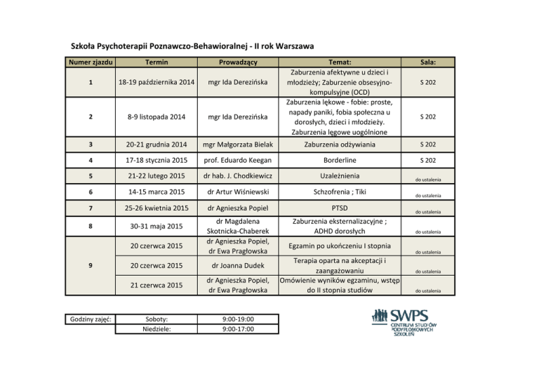 Szkoła Psychoterapii Poznawczo-Behawioralnej - II rok Warszawa Numer zjazdu Termin Prowadzący 1 18-19 października 2014 mgr Ida Derezińska 2 8-9 listopada 2014 mgr Ida Derezińska 3 20-21 grudnia 2014 mgr Małgorzata Bielak Zaburzenia odżywiania S 202 4 17-18 stycznia 2015 prof. Eduardo Keegan Borderline S 202 5 21-22 lutego 2015 dr hab. J. Chodkiewicz Uzależnienia do ustalenia 6 14-15 marca 2015 dr Artur Wiśniewski Schzofrenia ; Tiki 7 25-26 kwietnia 2015 dr Agnieszka Popiel PTSD 8 30-31 maja 2015 dr Magdalena Skotnicka-Chaberek dr Agnieszka Popiel, dr Ewa Pragłowska Zaburzenia eksternalizacyjne ; ADHD dorosłych 20 czerwca 2015 9 Godziny zajęć: 20 czerwca 2015 dr Joanna Dudek 21 czerwca 2015 dr Agnieszka Popiel, dr Ewa Pragłowska Soboty: Niedziele: 9:00-19:00 9:00-17:00 Temat: Zaburzenia afektywne u dzieci i młodzieży; Zaburzenie obsesyjnokompulsyjne (OCD) Zaburzenia lękowe - fobie: proste, napady paniki, fobia społeczna u dorosłych, dzieci i młodzieży. Zaburzenia lęgowe uogólnione Sala: S 202 S 202 do ustalenia do ustalenia do ustalenia Egzamin po ukończeniu I stopnia do ustalenia Terapia oparta na akceptacji i zaangażowaniu Omówienie wyników egzaminu, wstęp do II stopnia studiów do ustalenia do ustalenia