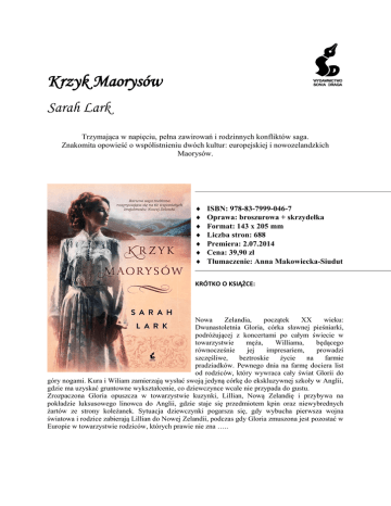 Krzyk Maorysów Sarah Lark Trzymająca w napięciu, pełna zawirowań i rodzinnych konfliktów saga. Znakomita opowieść o współistnieniu dwóch kultur: europejskiej i nowozelandzkich Maorysów. ISBN: 978-83-7999-046-7 Oprawa: broszurowa + skrzydełka Format: 143 x 205 mm Liczba stron: 688 Premiera: 2.07.2014 Cena: 39,90 zł Tłumaczenie: Anna Makowiecka-Siudut KRÓTKO O KSIĄŻCE: Nowa Zelandia, początek XX wieku: Dwunastoletnia Gloria, córka sławnej pieśniarki, podróżującej z koncertami po całym świecie w towarzystwie męża, Williama, będącego równocześnie jej impresariem, prowadzi szczęśliwe, beztroskie życie na farmie pradziadków. Pewnego dnia na farmę dociera list od rodziców, który wywraca cały świat Glorii do góry nogami. Kura i Wiliam zamierzają wysłać swoją jedyną córkę do ekskluzywnej szkoły w Anglii, gdzie ma uzyskać gruntowne wykształcenie, co dziewczynce wcale nie przypada do gustu. Zrozpaczona Gloria opuszcza w towarzystwie kuzynki, Lillian, Nową Zelandię i przybywa na pokładzie luksusowego linowca do Anglii, gdzie staje się przedmiotem kpin oraz niewybrednych żartów ze strony koleżanek. Sytuacja dziewczynki pogarsza się, gdy wybucha pierwsza wojna światowa i rodzice zabierają Lillian do Nowej Zelandii, podczas gdy Gloria zmuszona jest pozostać w Europie w towarzystwie rodziców, których prawie nie zna ….. O AUTORCE: Sarah Lark (ur. 1958 r.) zawsze fascynowały odległe zakątki świata, będące przedmiotem tęsknot i westchnień wielu ludzi. Jej porywające powieści nowozelandzkie natychmiast znajdowały liczne grono czytelników i wszystkie szybko zostały bestsellerami. Sarah Lark to pseudonim niemieckiej pisarki, odnoszącej wiele sukcesów. Jako autorka pisząca też pod nazwiskiem Ricarda Jordan porywa swych czytelników w barwny świat średniowiecza. WYBRANA PRASA: „Sarah Lark w porywający sposób opowiada pasjonującą historię nowozelandzkiej rodziny, wplecioną w tradycję i obyczaje Maorysów”. Booklooker.de „To wspaniale napisana książka, opowiadająca ze znawstwem o tradycji i zagadkowych obyczajach Maorysów, z barwnymi opisami fascynującego kraju i jego przyrody, stanowiącymi tło dla pełnej zawirowań historii rodzinnej”. Bürgerstimme POZOSTAŁE KSIĄŻKI AUTORKI Sonia Draga Sp. z o.o., Pl. Grunwaldzki 8−10, 40-127 Katowice, Tel.: 327826477, 7826037, Fax: 032/ 2537728 Dział handlowy: Danuta Czarnowska, 693420384, [email protected] Promocja: Agnieszka Jedlińska, 695672067, [email protected] Redakcja: Magdalena Bargłowska, 697800066, [email protected]