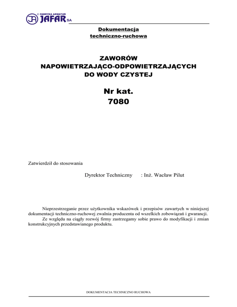 R SA Dokumentacja techniczno-ruchowa ZAWORÓW NAPOWIETRZAJĄCO-ODPOWIETRZAJĄCYCH DO WODY CZYSTEJ Nr kat. 7080 Zatwierdził do stosowania Dyrektor Techniczny : InŜ. Wacław Pilut Nieprzestrzeganie przez uŜytkownika wskazówek i przepisów zawartych w niniejszej dokumentacji techniczno-ruchowej zwalnia producenta od wszelkich zobowiązań i gwarancji. Ze względu na ciągły rozwój firmy zastrzegamy sobie prawo do modyfikacji i zmian konstrukcyjnych przedstawianego produktu. DOKUMENTACJA TECHNICZNO RUCHOWA R SA SPIS TREŚCI 1 OPIS TECHNICZNY ......................................................................................................................................... 3 1.1 NAZWA I CECHY WYROBU .................................................................................................................... 3 1.2 PRZEZNACZENIE....................................................................................................................................... 3 1.3 CHARAKTERYSTYKA TECHNICZNA .................................................................................................... 3 2 KONSTRUKCJA................................................................................................................................................ 4 2.1 OPIS KONSTRUKCJI ARMATURY .......................................................................................................... 4 2.2 MATERIAŁY. ........................................................................................................................................... 5-6 2.3 WYMIARY................................................................................................................................................... 7 2.4 NORMALIZACJA........................................................................................................................................ 8 2.5 ZASADY ZAMAWIANIA ........................................................................................................................... 9 2.6 WYKONANIE I ODBIÓR ........................................................................................................................... 9 2.7 ZNAKOWANIE ........................................................................................................................................... 9 3 ZABEZPIECZANIE – MAGAZYNOWANIE – TRANSPORT ........................................................................ 9 3.1 POWŁOKI OCHRONNE ............................................................................................................................. 9 3.2 PAKOWANIE .............................................................................................................................................. 9 3.3 MAGAZYNOWANIE ................................................................................................................................ 10 3.4 TRANSPORT ............................................................................................................................................. 10 4 MONTAś I INSTALACJA ............................................................................................................................... 11 4.1 WYTYCZNE MONTAśU ......................................................................................................................... 11 4.2 INSTRUKCJA MONTAśU .................................................................................................................. 11-12 4.3 EKSPLOATACJA ...................................................................................................................................... 13 4.4 PRZEPISY B.H.P ....................................................................................................................................... 14 5 WARUNKI GWARANCJI ................................................................................................................................ 14 DOKUMENTACJA TECHNICZNO RUCHOWA 2 R SA 1 OPIS TECHNICZNY 1.1 NAZWA I CECHY WYROBU Przedmiotem niniejszej DTR jest: zawór napowietrzająco-odpowietrzający do instalacji wodociągowych (wody czystej) TYP 7080; - korpus, tuleja, kołnierz i wspornik wykonane z Ŝeliwa sferoidalnego; zabezpieczenie przed korozją farbą epoksydową - kolumna i wewnętrzne elementy zbiornika wykonane ze stali nierdzewnej - pływak wykonany z PP - nakrętki, podkładki i śruby łączące wykonane ze stali nierdzewnej 1.2 PRZEZNACZENIE Zawór napowietrzająco-odpowietrzający kołnierzowy do bezpośredniej zabudowy w ziemi przeznaczony jest do odprowadzania powietrza z rurociągu przy jego napełnianiu lub do napowietrzania rurociągu przy jego opróŜnianiu. MoŜe być uŜywany w instalacjach podziemnych, koniecznie w najwyŜszym punkcie rurociągu ułoŜonego poziomo. 1.3 CHARAKTERYSTYKA TECHNICZNA Zawory napowietrzająco-odpowietrzające kołnierzowe TYP 7080 przeznaczone są do nai odpowietrzania rurociągu. - zakres stosowanych średnic (dymensji): - DN50 –DN100[mm] - max prędkość przepływu medium: - ciekłe do 4m/s - gazowe do 15m/s - wartości ciśnienia nominalnego PN - ciśnienie robocze - do - 1,6MPa - 0,00 – 1,6MPa - temperatura czynnika - do 70oC - max. wydajność odpowietrzania i napowietrzania - 190m3/h - max. wydajność odpowietrzania II-stopień 7,5m3/h. Kołnierz przyłączeniowy zaworu wykonany jest zgodnie z PN-EN 1092-2: 1999 o wymiarach odpowiednich dla przyjętych ciśnień nominalnych (PN 10/16). Wymiary zaworu napowietrzająco-odpowietrzającego kołnierzowego TYP 7080 są zgodne z dokumentacją techniczną. Dobór zaworów prowadzi się w zaleŜności od ilości odprowadzanego (doprowadzanego) powietrza, a więc od wielkości średnicy rurociągu i długości odpowietrzanego odcinka. Przy napełnianiu rurociągu maksymalna prędkość przepływu w wolnym przekroju zaworu nie powinna przekraczać wartości 20m/sek., aby nie porwać pływaka i nie 