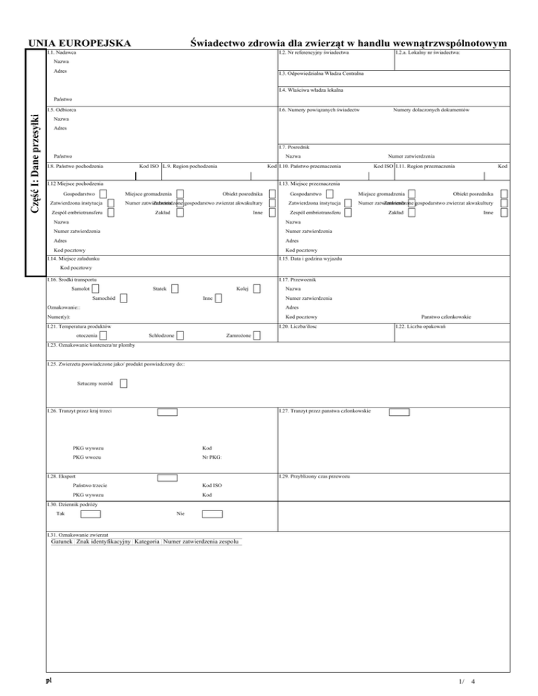 Część I: Dane przesyłki UNIA EUROPEJSKA Świadectwo zdrowia