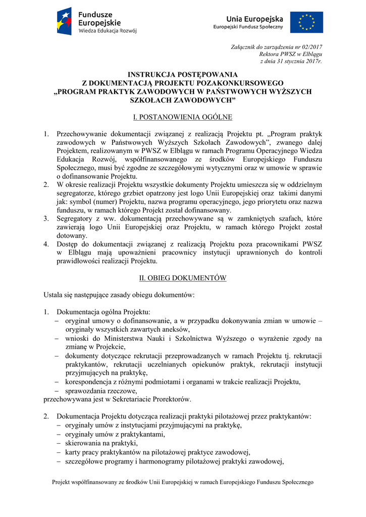 Załącznik do zarządzenia nr 02/2017 Rektora PWSZ w Elblągu z dnia 31 stycznia 2017r. INSTRUKCJA POSTĘPOWANIA Z DOKUMENTACJĄ PROJEKTU POZAKONKURSOWEGO „PROGRAM PRAKTYK ZAWODOWYCH W PAŃSTWOWYCH WYŻSZYCH SZKOŁACH ZAWODOWYCH” I. POSTANOWIENIA OGÓLNE 1. 2. 3. 4. Przechowywanie dokumentacji związanej z realizacją Projektu pt. „Program praktyk zawodowych w Państwowych Wyższych Szkołach Zawodowych”, zwanego dalej Projektem, realizowanym w PWSZ w Elblągu w ramach Programu Operacyjnego Wiedza Edukacja Rozwój, współfinansowanego ze środków Europejskiego Funduszu Społecznego, musi być zgodne ze szczegółowymi wytycznymi oraz w umowie w sprawie o dofinansowanie Projektu. W okresie realizacji Projektu wszystkie dokumenty Projektu umieszcza się w oddzielnym segregatorze, którego grzbiet opatrzony jest logo Unii Europejskiej oraz takimi danymi jak: symbol (numer) Projektu, nazwa programu operacyjnego, jego priorytetu oraz nazwa funduszu, w ramach którego Projekt został dofinansowany. Segregatory z ww. dokumentacją przechowywane są w zamkniętych szafach, które zawierają logo Unii Europejskiej oraz Projektu, w ramach którego Projekt został dotowany. Dostęp do dokumentacji związanej z realizacją Projektu poza pracownikami PWSZ w Elblągu mają upoważnieni pracownicy instytucji uprawnionych do kontroli prawidłowości realizacji Projektu. II. OBIEG DOKUMENTÓW Ustala się następujące zasady obiegu dokumentów: Dokumentacja ogólna Projektu: oryginał umowy o dofinansowanie, a w przypadku dokonywania zmian w umowie – oryginały wszystkich zawartych aneksów, wnioski do Ministerstwa Nauki i Szkolnictwa Wyższego o wyrażenie zgody na zmianę w Projekcie, dokumenty dotyczące rekrutacji przeprowadzanych w ramach Projektu tj. rekrutacji praktykantów, rekrutacji uczelnianych opiekunów praktyk, rekrutacji instytucji przyjmujących na praktykę, korespondencja z różnymi podmiotami i organami w trakcie realizacji Projektu, sprawozdania rzeczowe, przechowywana jest w Sekretariacie Prorektorów. 1. 2. Dokumentacja Projektu dotycząca realizacji praktyki pilotażowej przez praktykantów: oryginały umów z instytucjami przyjmującymi na praktykę, oryginały umów z praktykantami, skierowania na praktyki, karty pracy praktykantów na pilotażowej praktyce zawodowej, szczegółowe programy i harmonogramy pilotażowej praktyki zawodowej, Projekt współfinansowany ze środków Unii Europejskiej w ramach Europejskiego Funduszu Społecznego dzienniki pilotażowych praktyk zawodowych (po zaliczeniu praktyki), protokoły zaliczenia pilotażowej praktyki zawodowej, sprawozdania praktykantów, oświadczenia praktykantów, przechowywana jest w dziekanatach instytutów, w których realizowane są praktyki zawodowe. 3. Dokumentacja Projektu dotycząca uczelnianych opiekunów praktyk zawodowych: 1) oryginały umów z uczelnianymi opiekunami praktyk zawodowych, protokoły potwierdzające wykonanie zadań w projekcie, oświadczenia o zaangażowaniu zawodowym - przechowywane są w dziekanatach instytutów, w których realizowane są praktyki zawodowe, 2) wnioski o przyznanie dodatku specjalnego zatwierdzone przez rektora – przechowywane są w Kwesturze, 3) informacje o przyznaniu dodatku specjalnego – przechowywane są w aktach osobowych pracownika. Dokumentacja Projektu dotycząca zakładowych opiekunów praktyk zawodowych: oryginały umów z zakładowymi opiekunami praktyk zawodowych, oświadczenia, kwestionariusze związane z zawartymi umowami z zakładowymi opiekunami praktyk zawodowych, protokoły potwierdzające wykonanie zadań w projekcie, rachunki wystawiane przez zakładowych opiekunów praktyk zawodowych, przechowywana jest w Dziale Osobowym. 4. 5. Dokumentacja finansowa Projektu: 1) stypendialne listy wypłat z poszczególnych instytutów, parafowane przez dyrektorów właściwych instytutów i zatwierdzone przez rektora, 2) wnioski o refundację dodatkowych kosztów praktykanta oraz kosztów powstających przy prowadzeniu aplikacyjnej pracy dyplomowej wraz z dokumentami potwierdzającymi ich poniesienie, 3) kopie wniosków o płatność wraz z załącznikami potwierdzone za zgodność z oryginałem, 4) sprawozdania finansowe, 5) wydruki operacji gospodarczych z księgi rachunkowej dotyczące realizowanego Projektu, 6) oryginały dokumentów potwierdzających poniesienie kosztów (faktury, rachunki, paragony, listy płac, deklaracje ZUS, US, polecenia księgowania PK, potwierdzenie przelewu/ wpłata gotówki, wyciągi z rachunku bankowego itp.), 7) wydruki z rejestrów VAT oraz deklaracje VAT za okres realizacji Projektu ( jeżeli VAT stanowi koszt kwalifikowany w ramach Projektu), 8) polityka rachunkowości, zakładowy plan kont, 9) wydruki z ewidencji księgowej za okres realizacji Projektu, przechowywana jest w Kwesturze. 6. Oryginały dokumentów potwierdzających przeprowadzenie działań o charakterze promocyjnym: materiały ze szkoleń organizowanych w ramach Projektu, zaproszenia, potwierdzenia uczestnictwa, listy uczestników, materiały szkoleniowe, zdjęcia z przeprowadzonych szkoleń, Projekt współfinansowany ze środków Unii Europejskiej w ramach Europejskiego Funduszu Społecznego zdjęcia tablic informacyjnych, zdjęcia tablic pamiątkowych, ulotki, plakaty, oryginały gazet, czasopism, w których zamieszczono ogłoszenia i inne informacje dotyczące Projektu, nagrania radiowe i telewizyjne – jeżeli w ten sposób informowano o realizowanym Projekcie, wydruki ze stron internetowych na których zamieszczono informacje promocyjne, inne dowody dotyczące promocji Projektu, przechowywane są w Biurze Promocji i Współpracy z Zagranicą. 7. Dokumentacja przetargowa dotycząca Projektu przechowywana jest w Dziale Zamówień Publicznych. 8. Oryginały informacji z kontroli przeprowadzonych przez uprawnione do tego podmioty (informacje pokontrolne, protokoły, wyniki kontroli, zalecenia pokontrolne) przechowywane są w Dziale Prawno-Organizacyjnym. P