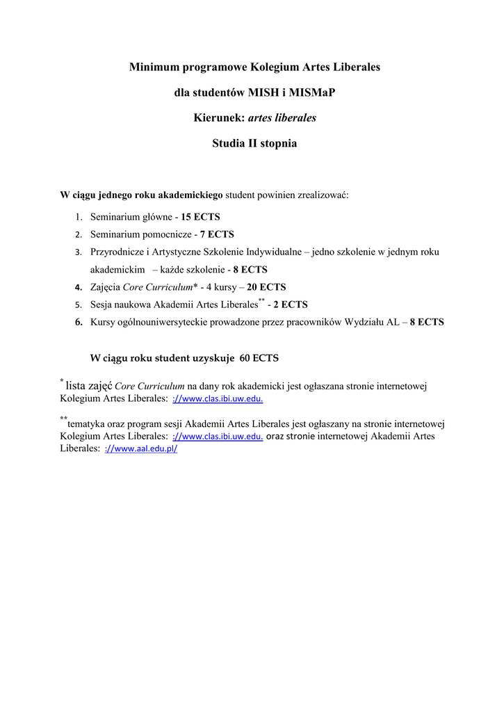 Minimum programowe Kolegium Artes Liberales dla studentów MISH i MISMaP Kierunek: artes liberales Studia II stopnia W ciągu jednego roku akademickiego student powinien zrealizować: 1. Seminarium główne - 15 ECTS 2. Seminarium pomocnicze - 7 ECTS 3. Przyrodnicze i Artystyczne Szkolenie Indywidualne – jedno szkolenie w jednym roku akademickim – każde szkolenie - 8 ECTS 4. Zajęcia Core Curriculum* - 4 kursy – 20 ECTS 5. Sesja naukowa Akademii Artes Liberales** - 2 ECTS 6. Kursy ogólnouniwersyteckie prowadzone przez pracowników Wydziału AL – 8 ECTS W ciągu roku student uzyskuje 60 ECTS lista zajęć Core Curriculum na dany rok akademicki jest ogłaszana stronie internetowej Kolegium Artes Liberales: ://www.clas.ibi.uw.edu. * ** tematyka oraz program sesji Akademii Artes Liberales jest ogłaszany na stronie internetowej Kolegium Artes Liberales: ://www.clas.ibi.uw.edu. oraz stronie internetowej Akademii Artes Liberales: ://www.aal.edu.pl/ Rok akademicki 2012/2013 1. 2. 3. 4. 5. SEMINARIUM GŁÓWNE I. Dzieło sztuki w kulturze (Works of Art in Culture) prowadzący: prof. dr hab. Jerzy Axer, dr hab. prof. UW Krzysztof Rutkowski, prof. dr hab. Piotr Wilczek II. Czas pamięć i wiedza jako wymiary życia społecznego (Time, memory and knowledge as social dimensions) prowadzący: prof. dr hab. Joanna Partyka, dr hab. Andrzej Waśkiewicz, dr Piotr Filipkowski SEMINARIUM POMOCNICZE Student wybiera (spośród wyróżnionych w punkcie 1) inne seminarium niż to, które jest dlań seminarium głównym (magisterskim). Tematyka seminariów pomocniczych odpowiada tematyce seminariów głównych (magisterskich), ale student dostaje prawie dwa razy mniej ECTS niż za udział w głównym, bo mniejszy jest wkład pracy studenta. SZKOLENIA INDYWIDUALNE Przyrodnicze szkolenie indywidualne (2x po 30 godz.) prowadząca: prof. dr hab. Joanna Pijanowska Artystyczne szkolenie indywidualne prowadzący: dr hab. prof. UW Krzysztof Rutkowski CORE CURRICULUM • Sienkiewicz dla dorosłych [I semestr, 30 godz.] prowadzący: prof. Ryszard Koziołek • Indywidualizm. "Ja" i dystynkcja. [I semestr, 30godz.] prowadzący:prof. dr hab. Małgorzata Jacyno • w semestrze letnim 2012-2013 student wybiera 2 kursy z oferty Kolegium Artes Liberales - po uzgodnieniu z Kierownictwem CLASS UDZIAŁ W SESJI NAUKOWEJ Udział w jednej spośród dwóch sesji naukowych Akademii Artes Liberales i przygotowanie krótkiego (5-6 stronicowego) eseju nawiązującego do wybranego przez studenta elementu programowego sesji. • 18 - 21 marca 2013 r. Warszawa Żywność kulturowo przetworzona. Kulinaria z perspektywy humanistycznej, organizator: Uniwersytet Warszawski • 14 - 15 stycznia 2013 r. Warszawa Nauczyciel akademicki: etos i warsztat, organizator: Uniwersytet Warszawski 6. KURSY DODATKOWE UZGODNIONE Z TUTOREM – 8 ECTS