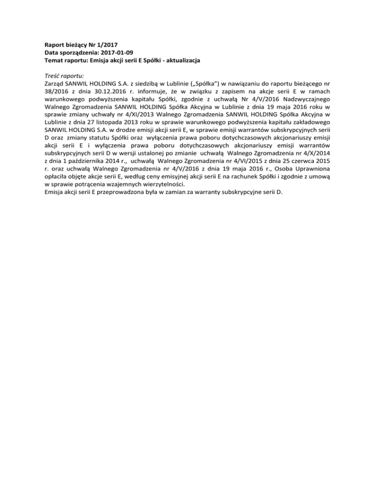Raport bieżący Nr 1/2017 Data sporządzenia: 2017-01-09 Temat raportu: Emisja akcji serii E Spółki - aktualizacja Treść raportu: Zarząd SANWIL HOLDING S.A. z siedzibą w Lublinie („Spółka”) w nawiązaniu do raportu bieżącego nr 38/2016 z dnia 30.12.2016 r. informuje, że w związku z zapisem na akcje serii E w ramach warunkowego podwyższenia kapitału Spółki, zgodnie z uchwałą Nr 4/V/2016 Nadzwyczajnego Walnego Zgromadzenia SANWIL HOLDING Spółka Akcyjna w Lublinie z dnia 19 maja 2016 roku w sprawie zmiany uchwały nr 4/XI/2013 Walnego Zgromadzenia SANWIL HOLDING Spółka Akcyjna w Lublinie z dnia 27 listopada 2013 roku w sprawie warunkowego podwyższenia kapitału zakładowego SANWIL HOLDING S.A. w drodze emisji akcji serii E, w sprawie emisji warrantów subskrypcyjnych serii D oraz zmiany statutu Spółki oraz wyłączenia prawa poboru dotychczasowych akcjonariuszy emisji akcji serii E i wyłączenia prawa poboru dotychczasowych akcjonariuszy emisji warrantów subskrypcyjnych serii D w wersji ustalonej po zmianie uchwałą Walnego Zgromadzenia nr 4/X/2014 z dnia 1 października 2014 r., uchwałą Walnego Zgromadzenia nr 4/VI/2015 z dnia 25 czerwca 2015 r. oraz uchwałą Walnego Zgromadzenia nr 4/V/2016 z dnia 19 maja 2016 r., Osoba Uprawniona opłaciła objęte akcje serii E, według ceny emisyjnej akcji serii E na rachunek Spółki i zgodnie z umową w sprawie potrącenia wzajemnych wierzytelności. Emisja akcji serii E przeprowadzona była w zamian za warranty subskrypcyjne serii D.
