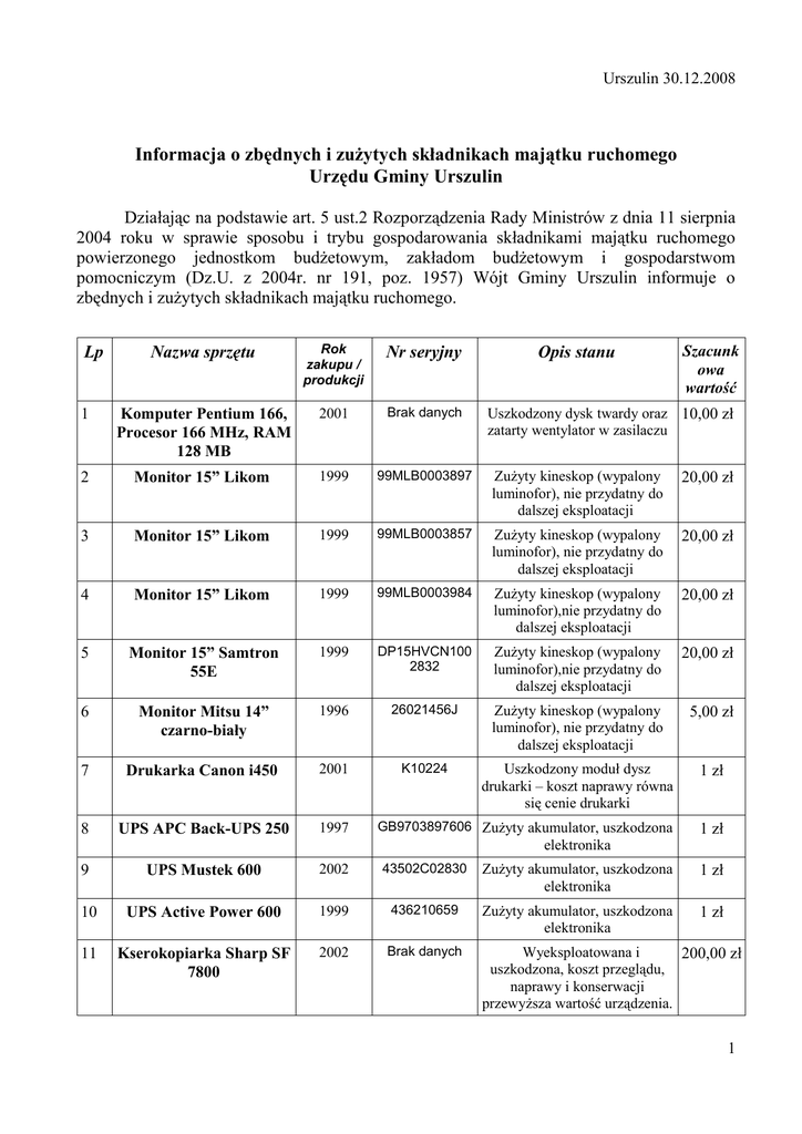 Urszulin 30.12.2008 Informacja o zbędnych i zużytych składnikach majątku ruchomego Urzędu Gminy Urszulin Działając na podstawie art. 5 ust.2 Rozporządzenia Rady Ministrów z dnia 11 sierpnia 2004 roku w sprawie sposobu i trybu gospodarowania składnikami majątku ruchomego powierzonego jednostkom budżetowym, zakładom budżetowym i gospodarstwom pomocniczym (Dz.U. z 2004r. nr 191, poz. 1957) Wójt Gminy Urszulin informuje o zbędnych i zużytych składnikach majątku ruchomego. Nazwa sprzętu Rok zakupu / produkcji Nr seryjny 1 Komputer Pentium 166, Procesor 166 MHz, RAM 128 MB 2001 Brak danych 2 Monitor 15” Likom 1999 99MLB0003897 Zużyty kineskop (wypalony luminofor), nie przydatny do dalszej eksploatacji 20,00 zł 3 Monitor 15” Likom 1999 99MLB0003857 Zużyty kineskop (wypalony luminofor), nie przydatny do dalszej eksploatacji 20,00 zł 4 Monitor 15” Likom 1999 99MLB0003984 Zużyty kineskop (wypalony luminofor),nie przydatny do dalszej eksploatacji 20,00 zł 5 Monitor 15” Samtron 55E 1999 DP15HVCN100 2832 Zużyty kineskop (wypalony luminofor),nie przydatny do dalszej eksploatacji 20,00 zł 6 Monitor Mitsu 14” czarno-biały 1996 26021456J Zużyty kineskop (wypalony luminofor), nie przydatny do dalszej eksploatacji 5,00 zł 7 Drukarka Canon i450 2001 K10224 Uszkodzony moduł dysz drukarki – koszt naprawy równa się cenie drukarki 1 zł 8 UPS APC Back-UPS 250 1997 GB9703897606 Zużyty akumulator, uszkodzona 1 zł 9 UPS Mustek 600 2002 43502C02830 Zużyty akumulator, uszkodzona elektronika 1 zł 10 UPS Active Power 600 1999 436210659 Zużyty akumulator, uszkodzona elektronika 1 zł 11 Kserokopiarka Sharp SF 7800 2002 Brak danych Wyeksploatowana i 200,00 zł uszkodzona, koszt przeglądu, naprawy i konserwacji przewyższa wartość urządzenia. Lp Opis stanu Szacunk owa wartość Uszkodzony dysk twardy oraz 10,00 zł zatarty wentylator w zasilaczu elektronika 1 Składniki te przeznaczone są do sprzedaży, nieodpłatnego przekazania i darowizny. Osoba wyznaczona do kontaktu: Waldemar Parczewski tel. (082) 5713 001 lub kontakt email: [email protected] Zainteresowanych prosimy o składanie ofert pisemnych w terminie do dnia 22.01.2009 do godziny 15.30 w sekretariacie Urzędu Gminy Urszulin lub przesłanie na adres Urzędu, koniecznie z dopiskiem „Zbędne i zużyte składniki majątku”. Sprzęt można obejrzeć w Urzędzie Gminy Urszulin przy ulicy Kwiatowej 35 we wtorki w godzinach 7.30 - 15.30 w terminie 20 dni od publikacji niniejszego ogłoszenia. Zagospodarowanie zbędnych lub zużytych składników majątku ruchomego Urzędu Gminy Urszulin odbywa się poprzez: 1. nieodpłatne przekazanie innej jednostce, przy czym przez jednostkę rozumie się jednostkę budżetową, zakład budżetowy, gospodarstwo pomocnicze; 2. sprzedaż, o ile nie dojdzie do skutku zagospodarowanie składników w sposób określony w pkt. 1; 3. zbycie w formie darowizny, o ile nie dojdzie do skutku zagospodarowanie składników w sposób określony w pkt. 1-2. UWAGA: 1. Nieodpłatne przekazanie składników majątku ruchomego może nastąpić na pisemny wniosek podmiotów określonych w § 38 Rozporządzenia Rady Ministrów z dnia 11 sierpnia 2004 r. (Dz.U. z 2004r. Nr 191, poz. 1957). Wniosek powinien zawierać: a) nazwę, siedzibę i adres jednostki, b) informację o zadaniach publicznych realizowanych przez jednostkę, c) wskazanie składnika majątku ruchomego, o który występuje jednostka, d) uzasadnienie potrzeb i sposobu wykorzystania składnika majątku ruchomego, e) oświadczenie, że przekazany składnik zostanie odebrany w terminie i miejscu wskazanym w umowie, f) telefon kontaktowy; 2. Darowizna składników majątku ruchomego może nastąpić na pisemny wniosek podmiotów określonych w § 39 Rozporządzenia Rady Ministrów z dnia 11 sierpnia 2004 r. (Dz.U. z 2004r. Nr 191,poz. 1957). Wniosek powinien zawierać: a) nazwę, siedzibę i adres jednostki, b) statut, c) informację o zadaniach publicznych realizowanych przez jednostkę, 2 3