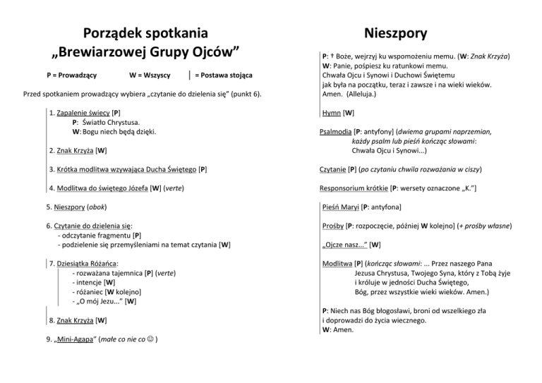 Porządek spotkania „Brewiarzowej Grupy Ojców” P = Prowadzący W = Wszyscy = Postawa stojąca Przed spotkaniem prowadzący wybiera „czytanie do dzielenia się” (punkt 6). 1. Zapalenie świecy [P] P: Światło Chrystusa. W: Bogu niech będą dzięki. Nieszpory P: † Boże, wejrzyj ku wspomożeniu memu. (W: Znak Krzyża) W: Panie, pośpiesz ku ratunkowi memu. Chwała Ojcu i Synowi i Duchowi Świętemu jak była na początku, teraz i zawsze i na wieki wieków. Amen. (Alleluja.) Hymn [W] 2. Znak Krzyża [W] Psalmodia [P: antyfony] (dwiema grupami naprzemian, każdy psalm lub pieśń kończąc słowami: Chwała Ojcu i Synowi...) 3. Krótka modlitwa wzywająca Ducha Świętego [P] Czytanie [P] (po czytaniu chwila rozważania w ciszy) 4. Modlitwa do świętego Józefa [W] (verte) Responsorium krótkie [P: wersety oznaczone „K.”] 5. Nieszpory (obok) Pieśń Maryi [P: antyfona] 6. Czytanie do dzielenia się: - odczytanie fragmentu [P] - podzielenie się przemyśleniami na temat czytania [W] Prośby [P: rozpoczęcie, później W kolejno] (+ prośby własne) 7. Dziesiątka Różańca: - rozważana tajemnica [P] (verte) - intencje [W] - różaniec [W kolejno] - „O mój Jezu...” [W] 8. Znak Krzyża [W] 9. „Mini-Agapa” (małe co nie co ) „Ojcze nasz...” [W] Modlitwa [P] (kończąc słowami: ... Przez naszego Pana Jezusa Chrystusa, Twojego Syna, który z Tobą żyje i króluje w jedności Ducha Świętego, Bóg, przez wszystkie wieki wieków. Amen.) P: Niech nas Bóg błogosławi, broni od wszelkiego zła i doprowadzi do życia wiecznego. W: Amen. Modlitwa „Brewiarzowej Grupy Ojców” do świętego Józefa (na podstawie nowenny do św. Józefa — Sanktuarium św. Józefa w Kaliszu) Święty Józefie, wzorze i patronie wszystkich ojców rodzin, naucz nas chrześcijańskiego traktowania naszych obowiązków, napełnij prawdziwą radością serca nas ojców, którzy przekazujemy życie swym dzieciom. Chcemy tak opiekować się swymi rodzinami, jak Ty opiekowałeś się Świętą Rodziną w Nazarecie. Niech w naszym życiu rodzinnym nigdy nie zabraknie obecności Jezusa. Spraw, by żadne trudności nie zdołały nas oddalić od Boga i oziębić miłości do Niego, jak również do naszych żon i dzieci. Poleć święty Józefie Bogu nas ojców zatroskanych o swe rodziny, a szczególnie tych, którym trudno jest podołać swym obowiązkom. Amen. Tajemnice Różańca Tajemnice radosne Tajemnice światła Tajemnice bolesne Tajemnice chwalebne 1. Zwiastowanie Maryi 1. Chrzest Pana Jezusa w Jordanie 1. Modlitwa w Ogrójcu 1. Zmartwychwstanie 2. Nawiedzenie św. Elżbiety 2. Objawienie siebie na weselu w Kanie 2. Biczowanie 2. Wniebowstąpienie 3. Narodzenie Pana Jezusa 3. Głoszenie Królestwa Bożego i wzywanie do nawrócenia 3. Ukoronowanie cierniem 3. Zesłanie Ducha Świętego 4. Dźwiganie krzyża 4. Wniebowzięcie Maryi 5. Śmierć na krzyżu 5. Ukoronowanie Maryi na Królową Nieba i Ziemi 4. Ofiarowanie Pana Jezusa w świątyni 5. Znalezienie Pana Jezusa w świątyni 4. Przemienienie na górze Tabor 5. Ustanowienie Eucharystii