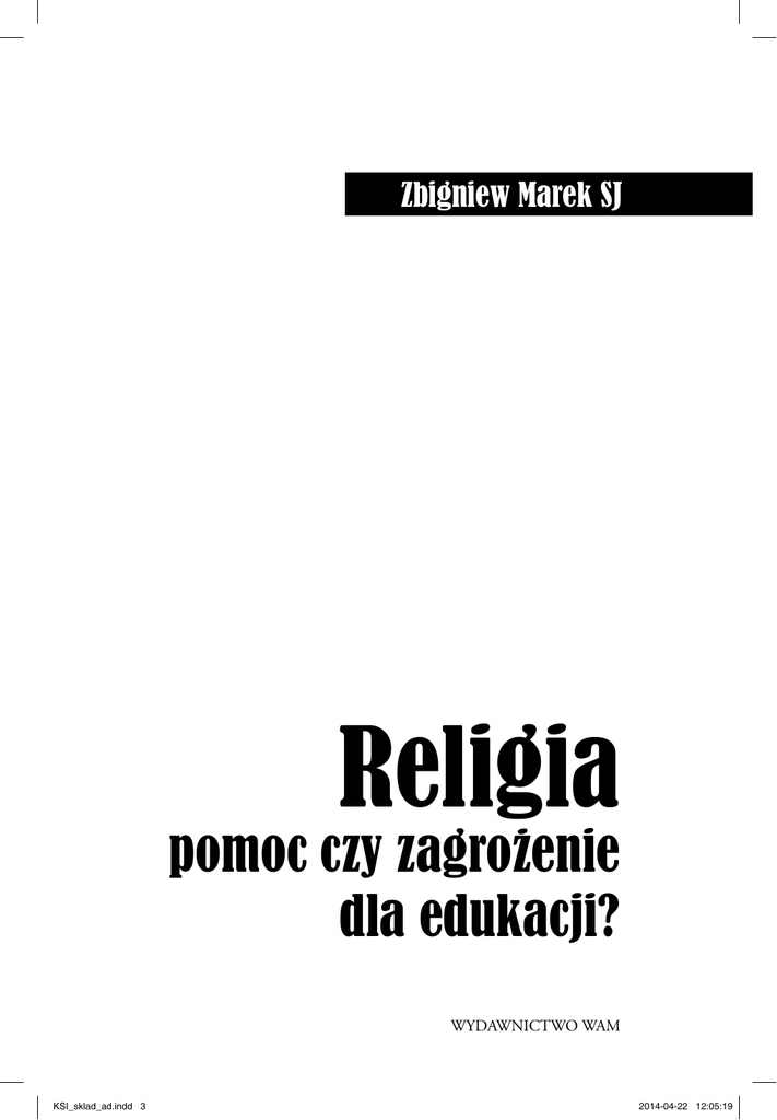 Zbigniew Marek SJ Religia pomoc czy zagrozenie dla edukacji? WYDAWNICTWO WAM KSI_sklad_ad.indd 3 2014-04-22 12:05:19 Spis treści Przedmowa . . . . . . . . . . . . . . . . . . . . . . . . . . . . . . . . . . . . . . . . . . . . . . . . . . . . . . . . . . . . . .7 Wstęp. . . . . . . . . . . . . . . . . . . . . . . . . . . . . . . . . . . . . . . . . . . . . . . . . . . . . . . . . . . . . . . . . . 11 Rozdział 1. Transcendencja i człowiek . . . . . . . . . . . . . . . . . . . . . . . . . . . . . . . . . . . 15 Natura człowieka . . . . . . . . . . . . . . . . . . . . . . . . . . . . . . . . . . . . . . . . . . . . . . . . . . . 16 Człowiek osobą . . . . . . . . . . . . . . . . . . . . . . . . . . . . . . . . . . . . . . . . . . . . . . . . . . . . . 23 Religia i religijność . . . . . . . . . . . . . . . . . . . . . . . . . . . . . . . . . . . . . . . . . . . . . . . . . . 32 Religia chrześcijańska . . . . . . . . . . . . . . . . . . . . . . . . . . . . . . . . . . . . . . . . . . . . . . . 43 Rozdział 2. Religia w refleksji pedagogicznej . . . . . . . . . . . . . . . . . . . . . . . . . . . . . . 49 Poznanie naturalne i religijne . . . . . . . . . . . . . . . . . . . . . . . . . . . . . . . . . . . . . . . . 49 Pedagogika religii czy katechetyka . . . . . . . . . . . . . . . . . . . . . . . . . . . . . . . . . . . . 54 Pedagogika religii dyscypliną nauki . . . . . . . . . . . . . . . . . . . . . . . . . . . . . . . . . . . 60 Rozdział 3. Edukacja otwarta na Transcendencję . . . . . . . . . . . . . . . . . . . . . . . . . . 67 Edukacja i religia . . . . . . . . . . . . . . . . . . . . . . . . . . . . . . . . . . . . . . . . . . . . . . . . . . . . 67 Źródło edukacji religijnej . . . . . . . . . . . . . . . . . . . . . . . . . . . . . . . . . . . . . . . . . . . 70 Biblia Księgą religijną . . . . . . . . . . . . . . . . . . . . . . . . . . . . . . . . . . . . . . . . . . . . 71 Zasady korzystania z Biblii w edukacji . . . . . . . . . . . . . . . . . . . . . . . . . . . . . 73 Antropologiczne podstawy edukacji religijnej . . . . . . . . . . . . . . . . . . . . . . . . . 82 Teologiczne podstawy edukacji religijnej. . . . . . . . . . . . . . . . . . . . . . . . . . . . . . 91 Rozdział 4. Miejsce religii w edukacji . . . . . . . . . . . . . . . . . . . . . . . . . . . . . . . . . . . . . 99 Nowe myślenie o edukacji . . . . . . . . . . . . . . . . . . . . . . . . . . . . . . . . . . . . . . . . . . . 99 Całożyciowa edukacja . . . . . . . . . . . . . . . . . . . . . . . . . . . . . . . . . . . . . . . . . . . . . . 103 Uczyć się, aby wiedzieć . . . . . . . . . . . . . . . . . . . . . . . . . . . . . . . . . . . . . . . . . 104 Uczyć się, aby działać . . . . . . . . . . . . . . . . . . . . . . . . . . . . . . . . . . . . . . . . . . . 107 Uczyć się, aby żyć wspólnie. . . . . . . . . . . . . . . . . . . . . . . . . . . . . . . . . . . . . . 114 Uczyć się, aby być . . . . . . . . . . . . . . . . . . . . . . . . . . . . . . . . . . . . . . . . . . . . . . 117 Religia w praktyce edukacyjnej. . . . . . . . . . . . . . . . . . . . . . . . . . . . . . . . . . . . . . 129 Rozdział 5. Religia i wychowanie . . . . . . . . . . . . . . . . . . . . . . . . . . . . . . . . . . . . . . . 155 Wychowanie religijne . . . . . . . . . . . . . . . . . . . . . . . . . . . . . . . . . . . . . . . . . . . . . . 155 Pedagogia ignacjańska modelem wychowania religijnego . . . . . . . . . . . . . 165 Posłowie . . . . . . . . . . . . . . . . . . . . . . . . . . . . . . . . . . . . . . . . . . . . . . . . . . . . . . . . . . . . . . 175 Abstract. . . . . . . . . . . . . . . . . . . . . . . . . . . . . . . . . . . . . . . . . . . . . . . . . . . . . . . . . . . . . . . 177 Bibliografia . . . . . . . . . . . . . . . . . . . . . . . . . . . . . . . . . . . . . . . . . . . . . . . . . . . . . . . . . . . . 181 Indeks rzeczowy . . . . . . . . . . . . . . . . . . . . . . . . . . . . . . . . . . . . . . . . . . . . . . . . . . . . . . . 193 Indeks nazwisk . . . . . . . . . . . . . . . . . . . . . . . . . . . . . . . . . . . . . . . . . . . . . . . . . . . . . . . . 197 KSI_sklad_ad.indd 5 2014-04-22 12:05:19 Wstęp W ostatnich latach z różnym nasileniem powraca dyskusja o miejscu i roli religii w edukacji. Są podawane argumenty przemawiające „za” oraz „przeciw” jej obecności w życiu publicznym. Dyskusja ta przybrała na sile wraz z powrotem katechezy (szkolnego nauczania religii) do polskiej szkoły. W kontekście tego wydarzenia rodzi się pytanie: czy wejście katechezy do szkoły było tylko przeniesieniem nauczania religii z przykościelnych sal katechetycznych do sal szkolnych, czy też czymś więcej. Pytanie to, choć niezmiernie ważne, pozostaje retoryczne choćby dlatego, że w tej kwestii wciąż trudno znaleźć zadowalający wszystkich konsensus. Prowadzone dyskusje o miejscu religii w życiu społecznym zainspirowały refleksję nad pytaniem o to, czy religia jest dla edukacji wsparciem czy raczej przeszkodą, partnerem czy też rywalem. Niniejsza publikacja, która jest owocem tych przemyśleń, nie rości sobie prawa do rozstrzygnięć w dyskutowanych kwestiach. W zamierzeniach autora pierwszorzędnym celem tego przedłożenia jest objaśnienie kwestii, które nie zawsze i nie w pełni brane są pod lupę przez uczestników dyskusji nad znaczeniem religii w edukacji. W opracowaniu będziemy poszukiwać odpowiedzi na pytanie o to, czy religia jest/może być dla edukacji wsparciem czy zagrożeniem; partnerem czy konkurentem? Możliwość ubogacania oddziaływań wychowawczych rzeczywistością religijną widzi między innymi B. Śliwerski, który zauważa, że w każdej teorii wychowania można wyróżnić wymiar transcendentności1. Chodzi o rzeczywistość – tajemnicę, której człowiek nie jest w stanie inaczej poznać, jak tylko za pomocą objaśnień czerpanych z religii. Ten niezmiernie skomplikowany proces właściwy jest ludziom wszystkich epok, co nie 
