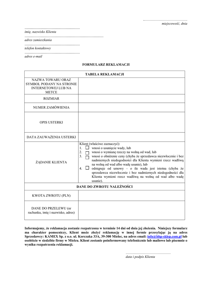 ..………………………………. miejscowość, dnia ............................................................... imię, nazwisko Klienta .......................................................................................... adres zamieszkania ............................................................... telefon kontaktowy ............................................................... adres e-mail FORMULARZ REKLAMACJI TABELA REKLAMACJI NAZWA TOWARU ORAZ SYMBOL PODANY NA STRONIE INTERNETOWEJ LUB NA METCE ROZMIAR NUMER ZAMÓWIENIA OPIS USTERKI DATA ZAUWAŻENIA USTERKI ŻĄDANIE KLIENTA Klient (właściwe zaznaczyć): 1. wnosi o usunięcie wady, lub 2. wnosi o wymianę rzeczy na wolną od wad, lub 3. wnosi o obniżenie ceny (chyba że sprzedawca niezwłocznie i bez nadmiernych niedogodności dla Klienta wymieni rzecz wadliwą na wolną od wad albo wadę usunie), lub 4. odstępuje od umowy – o ile wada jest istotna (chyba że sprzedawca niezwłocznie i bez nadmiernych niedogodności dla Klienta wymieni rzecz wadliwą na wolną od wad albo wadę usunie). DANE DO ZWROTU NALEŻNOŚCI KWOTA ZWROTU (PLN) DANE DO PRZELEWU (nr rachunku, imię i nazwisko, adres) Informujemy, że reklamacja zostanie rozpatrzona w terminie 14 dni od dnia jej złożenia. Niniejszy formularz ma charakter pomocniczy, Klient może złożyć reklamację w innej formie przesyłając ją na adres Sprzedawcy: KAMEX Sp. z o.o. ul. Korczaka 33A, 39-300 Mielec, na adres email: [email protected] lub osobiście w siedzibie firmy w Mielcu. Klient zostanie poinformowany telefonicznie lub mailowo lub pisemnie o wyniku rozpatrzenia reklamacji. ………………………………… data i podpis Klienta