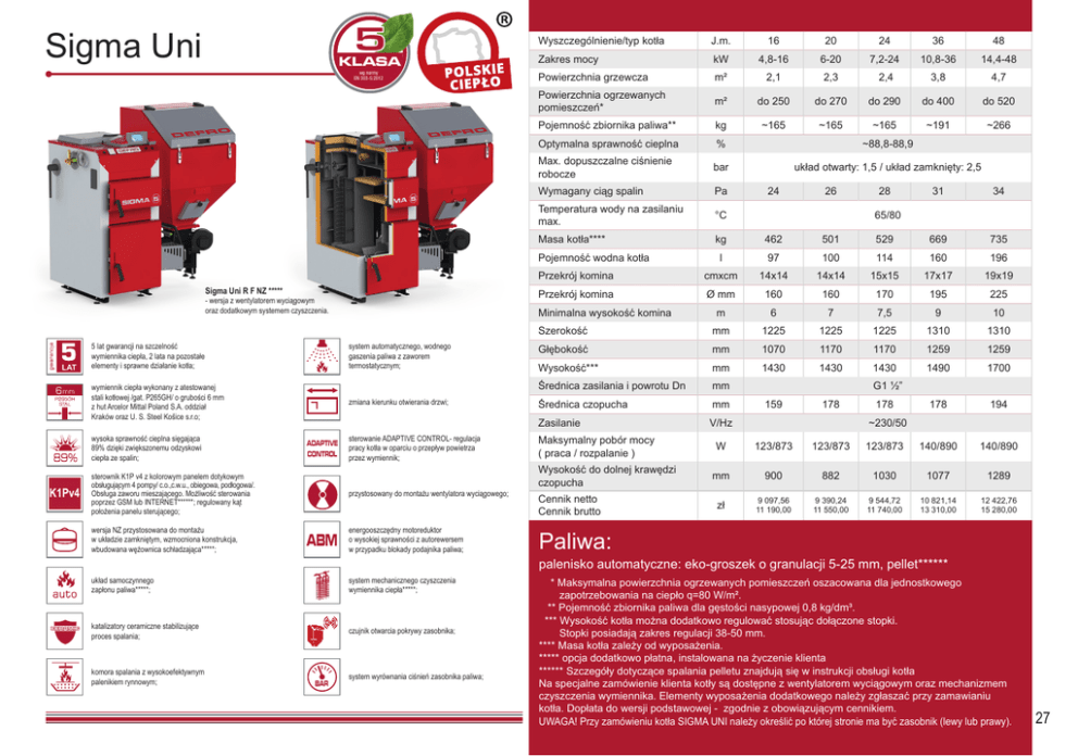 5 Sigma Uni KLASA wg normy EN 303-5:2012 Wyszczególnienie/typ kotła J.m. 16 20 24 36 48 Zakres mocy kW 4,8-16 6-20 7,2-24 10,8-36 14,4-48 Powierzchnia grzewcza m² 2,1 2,3 2,4 3,8 4,7 Powierzchnia ogrzewanych pomieszczeń* m² do 250 do 270 do 290 do 400 do 520 Pojemność zbiornika paliwa** kg ~165 ~165 ~165 ~191 ~266 Optymalna sprawność cieplna % ~88,8-88,9 Max. dopuszczalne ciśnienie robocze bar układ otwarty: 1,5 / układ zamknięty: 2,5 Wymagany ciąg spalin Pa Temperatura wody na zasilaniu max. °C 31 34 Masa kotła**** kg 462 501 l 97 100 529 669 735 114 160 Przekrój komina cmxcm 14x14 196 14x14 15x15 17x17 19x19 Przekrój komina Ø mm m 160 160 170 195 225 6 7 7,5 9 Szerokość 10 mm 1225 1225 1225 1310 1310 Głębokość mm 1070 1170 1170 1259 1259 Wysokość*** mm 1430 1430 1430 1490 1700 Średnica zasilania i powrotu Dn mm 178 194 140/890 140/890 Pojemność wodna kotła Sigma Uni R F NZ ***** - wersja z wentylatorem wyciągowym oraz dodatkowym systemem czyszczenia. 5 lat gwarancji na szczelność wymiennika ciepła, 2 lata na pozostałe elementy i sprawne działanie kotła; system automatycznego, wodnego gaszenia paliwa z zaworem termostatycznym; wymiennik ciepła wykonany z atestowanej stali kotłowej /gat. P265GH/ o grubości 6 mm z hut Arcelor Mittal Poland S.A. oddział Kraków oraz U. S. Steel Košice s.r.o; wysoka sprawność cieplna sięgająca 89% dzięki zwiększonemu odzyskowi ciepła ze spalin; K1Pv4 zmiana kierunku otwierania drzwi; ADAPTIVE CONTROL sterownik K1P v4 z kolorowym panelem dotykowym obsługującym 4 pompy/ c.o.,c.w.u., obiegowa, podłogowa/. Obsługa zaworu mieszającego. Możliwość sterowania poprzez GSM lub INTERNET******; regulowany kąt położenia panelu sterującego; wersja NZ przystosowana do montażu w układzie zamkniętym, wzmocniona konstrukcja, wbudowana wężownica schładzająca*****; Minimalna wysokość komina sterowanie ADAPTIVE CONTROL- regulacja pracy kotła w oparciu o przepływ powietrza przez wymiennik; przystosowany do montażu wentylatora wyciągowego; ABM energooszczędny motoreduktor o wysokiej sprawności z autorewersem w przypadku blokady podajnika paliwa; Średnica czopucha mm Zasilanie V/Hz Maksymalny pobór mocy ( praca / rozpalanie ) Wysokość do dolnej krawędzi czopucha Cennik netto Cennik brutto W 24 26 28 65/80 G1 ½” 159 178 178 ~230/50 123/873 123/873 123/873 mm 900 882 1030 1077 1289 zł 9 097,56 11 190,00 9 390,24 11 550,00 9 544,72 11 740,00 10 821,14 13 310,00 12 422,76 15 280,00 Paliwa: palenisko automatyczne: eko-groszek o granulacji 5-25 mm, pellet****** układ samoczynnego zapłonu paliwa*****; system mechanicznego czyszczenia wymiennika ciepła*****; katalizatory ceramiczne stabilizujące proces spalania; czujnik otwarcia pokrywy zasobnika; komora spalania z wysokoefektywnym palenikiem rynnowym; BAR system wyrównania ciśnień zasobnika paliwa; * Maksymalna powierzchnia ogrzewanych pomieszczeń oszacowana dla jednostkowego zapotrzebowania na ciepło q=80 W/m². ** Pojemność zbiornika paliwa dla gęstości nasypowej 0,8 kg/dm³. *** Wysokość kotła można dodatkowo regulować stosując dołączone stopki. Stopki posiadają zakres regulacji 38-50 mm. **** Masa kotła zależy od wyposażenia. ***** opcja dodatkowo płatna, instalowana na życzenie klienta ****** Szczegóły dotyczące spalania pelletu znajdują się w instrukcji obsługi kotła Na specjalne zamówienie klienta kotły są dostępne z wentylatorem wyciągowym oraz mechanizmem czyszczenia wymiennika. Elementy wyposażenia dodatkowego należy zgłaszać przy zamawianiu kotła. Dopłata do wersji podstawowej - zgodnie z obowiązującym cennikiem. UWAGA! Przy zamówieniu kotła SIGMA UNI należy określić po której stronie ma być zasobnik (lewy lub prawy). 27