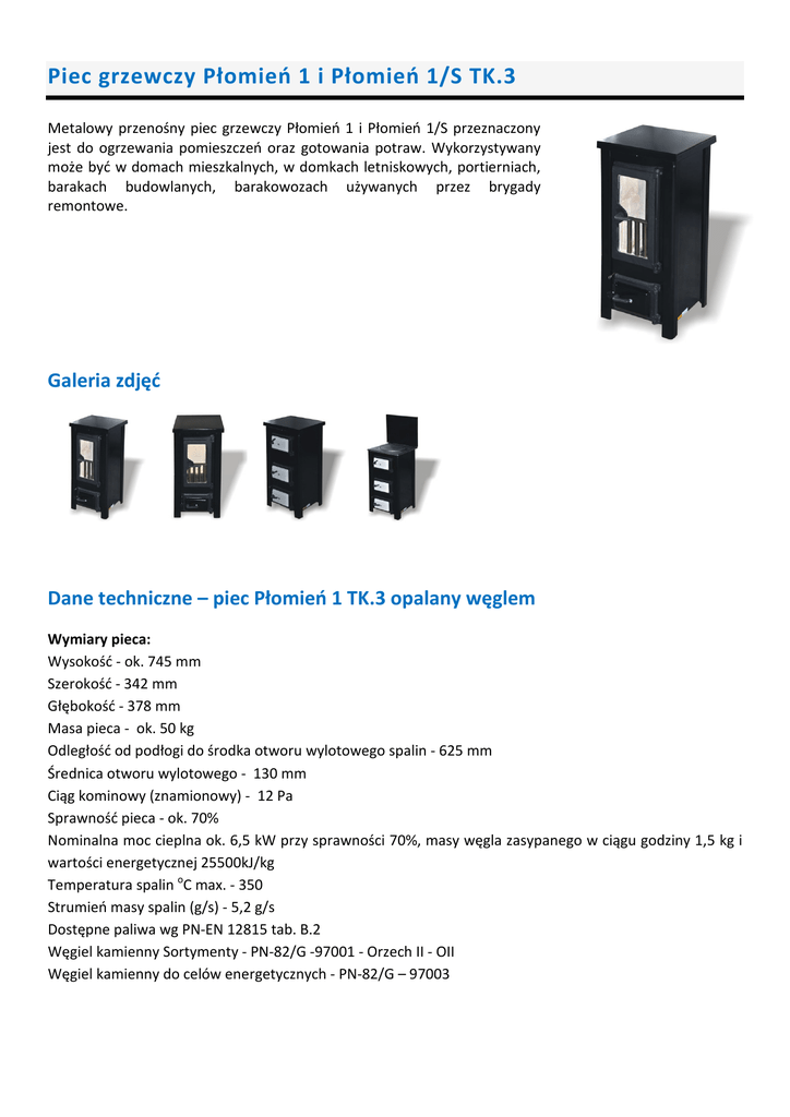 Piec grzewczy Płomień 1 i Płomień 1/S TK.3 Metalowy przenośny piec grzewczy Płomień 1 i Płomień 1/S przeznaczony jest do ogrzewania pomieszczeń oraz gotowania potraw. Wykorzystywany może być w domach mieszkalnych, w domkach letniskowych, portierniach, barakach budowlanych, barakowozach używanych przez brygady remontowe. Galeria zdjęć Dane techniczne – piec Płomień 1 TK.3 opalany węglem Wymiary pieca: Wysokość - ok. 745 mm Szerokość - 342 mm Głębokość - 378 mm Masa pieca - ok. 50 kg Odległość od podłogi do środka otworu wylotowego spalin - 625 mm Średnica otworu wylotowego - 130 mm Ciąg kominowy (znamionowy) - 12 Pa Sprawność pieca - ok. 70% Nominalna moc cieplna ok. 6,5 kW przy sprawności 70%, masy węgla zasypanego w ciągu godziny 1,5 kg i wartości energetycznej 25500kJ/kg Temperatura spalin oC max. - 350 Strumień masy spalin (g/s) - 5,2 g/s Dostępne paliwa wg PN-EN 12815 tab. B.2 Węgiel kamienny Sortymenty - PN-82/G -97001 - Orzech II - OII Węgiel kamienny do celów energetycznych - PN-82/G – 97003 Dane techniczne - piec Płomień 1 TK.3 opalany drewnem Wymiary pieca: Wysokość - ok. 745 mm Szerokość - 342 mm Głębokość - 378 mm Masa pieca - ok. 50 kg Odległość od podłogi do środka otworu wylotowego spalin - 625 mm Średnica otworu wylotowego - 130 mm Ciąg kominowy (znamionowy) - 12 Pa Sprawność pieca - ok. 58% Nominalna moc cieplna ok. 4,5 kW, masa drewna w ciągu godziny 2,0 kg Temperatura spalin oC max. - 410 Strumień masy spalin (g/s) - 7,0 g/s Drewno opalowe liściaste-polana, szczapy: Długość - 20cm, obwód - 30-35 cm, wilgotność max 20% Budowa Korpus pieca zbudowany jest ze ścian skręcanych. Płyta górna żeliwna z krążkiem o średnicy 240 mm. Na ścianie przedniej zamocowano drzwi paleniska górne i dolne oraz drzwi popielnik. Na ścianie tylnej znajduje się wylot spalin wyposażony w regulowaną przesłoną. Piec wyposażony jest w ruchomy ruszt w celu łatwego usuwania resztek popiołu. Wymurówka pieca wykonano z kształtek szamotowych.
