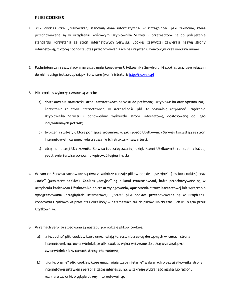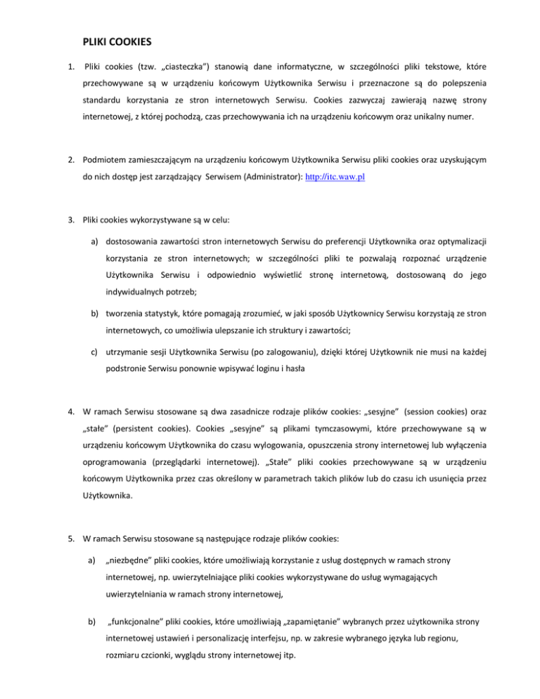 PLIKI COOKIES 1. Pliki cookies (tzw. „ciasteczka”) stanowią dane informatyczne, w szczególności pliki tekstowe, które przechowywane są w urządzeniu końcowym Użytkownika Serwisu i przeznaczone są do polepszenia standardu korzystania ze stron internetowych Serwisu. Cookies zazwyczaj zawierają nazwę strony internetowej, z której pochodzą, czas przechowywania ich na urządzeniu końcowym oraz unikalny numer. 2. Podmiotem zamieszczającym na urządzeniu końcowym Użytkownika Serwisu pliki cookies oraz uzyskującym do nich dostęp jest zarządzający Serwisem (Administrator): http://itc.waw.pl 3. Pliki cookies wykorzystywane są w celu: a) dostosowania zawartości stron internetowych Serwisu do preferencji Użytkownika oraz optymalizacji korzystania ze stron internetowych; w szczególności pliki te pozwalają rozpoznać urządzenie Użytkownika Serwisu i odpowiednio wyświetlić stronę internetową, dostosowaną do jego indywidualnych potrzeb; b) tworzenia statystyk, które pomagają zrozumieć, w jaki sposób Użytkownicy Serwisu korzystają ze stron internetowych, co umożliwia ulepszanie ich struktury i zawartości; c) utrzymanie sesji Użytkownika Serwisu (po zalogowaniu), dzięki której Użytkownik nie musi na każdej podstronie Serwisu ponownie wpisywać loginu i hasła 4. W ramach Serwisu stosowane są dwa zasadnicze rodzaje plików cookies: „sesyjne” (session cookies) oraz „stałe” (persistent cookies). Cookies „sesyjne” są plikami tymczasowymi, które przechowywane są w urządzeniu końcowym Użytkownika do czasu wylogowania, opuszczenia strony internetowej lub wyłączenia oprogramowania (przeglądarki internetowej). „Stałe” pliki cookies przechowywane są w urządzeniu końcowym Użytkownika przez czas określony w parametrach takich plików lub do czasu ich usunięcia przez Użytkownika. 5. W ramach Serwisu stosowane są następujące rodzaje plików cookies: a) „niezbędne” pliki cookies, które umożliwiają korzystanie z usług dostępnych w ramach strony internetowej, np. uwierzytelniające pliki cookies wykorzystywane do usług wymagających uwierzytelniania w ramach strony internetowej, b) „funkcjonalne” pliki cookies, które umożliwiają „zapamiętanie” wybranych przez użytkownika strony internetowej ustawień i personalizację interfejsu, np. w zakresie wybranego języka lub regionu, rozmiaru czcionki, wyglądu strony internetowej itp. 6. Domyślne ustawienia oprogramowań służących do przeglądania stron internetowych (przeglądarek internetowych) dopuszczają najczęściej przechowywanie plików cookies w urządzeniu końcowym Użytkownika. Użytkownicy Serwisu mogą dokonać w każdym czasie zmiany ustawień swojej przeglądarki dotyczących plików cookies. Ustawienia te mogą zostać zmienione w szczególności w taki sposób, aby blokować automatyczną obsługę plików cookies w ustawieniach przeglądarki internetowej bądź informować o ich każdorazowym zamieszczeniu w urządzeniu Użytkownika Serwisu. 7. Poniżej Administrator opisuje, jak można zmienić ustawienia cookies w najpopularniejszych przeglądarkach internetowych: Internet Explorer: 1. Otwórz program Internet Explorer, klikając przycisk Start, a następnie klikając polecenie Internet Explorer. 2. Kliknij przycisk Narzędzia, a następnie kliknij polecenie Opcje internetowe. 3. Kliknij kartę Prywatność, a następnie w obszarze Ustawienia przesuń suwak do najwyższego położenia, aby zablokować wszystkie pliki cookies, lub do najniższego położenia, aby zezwolić na wszystkie pliki cookies, a następnie kliknij przycisk OK Chrome: 1. Kliknij menu Chrome na pasku narzędzi przeglądarki. 2. Wybierz Ustawienia. 3. Kliknij Pokaż ustawienia zaawansowane. 4. W sekcji „Prywatność” kliknij przycisk Ustawienia treści. 5. W sekcji „Pliki cookies” możesz zmienić ustawienia plików cookies Firefox: 1. Na górze okna Firefoksa naciśnij przycisk Firefox, (w systemie Windows XP kliknij menu Narzędzia) i wybierz Opcje. 2. Wybierz panel Prywatność. 3. Z menu rozwijanego elementu Program Firefox: wybierz opcję: będzie używał ustawień historii użytkownika. 4. Zaznacz Akceptuj ciasteczka, by włączyć, odznacz, by wyłączyć obsługę ciasteczek Opera: 1. Przejdź do zakładki Narzędzia w górnym menu Opery i z rozwijanego menu wybierz Preferencje. 2. W okienku, które się pojawi przejdź do zakładki Zaawansowane, z menu po lewej stronie wybierz Ciasteczka i zmień ustawienia plików cookies 8. Administrator informuje, że w razie problemów ze zmianą ustawień plików cookies, najlepiej skorzystać z informacji znajdujących się na stronie internetowej producenta danego programu. 9. Jakiekolwiek pytania dotyczące powyższej polityki prywatności prosimy kierować na adres: Independent Telecommunications Consulting Sp. z o.o OXFORD TOWER Ul. Chałubińskiego 8 piętro 26 00-613 Warszawa tel. (22) 830 04 03 fax (22) 830 05 24 email: [email protected] NIP: 526-26-85-786 REGON: 015438590