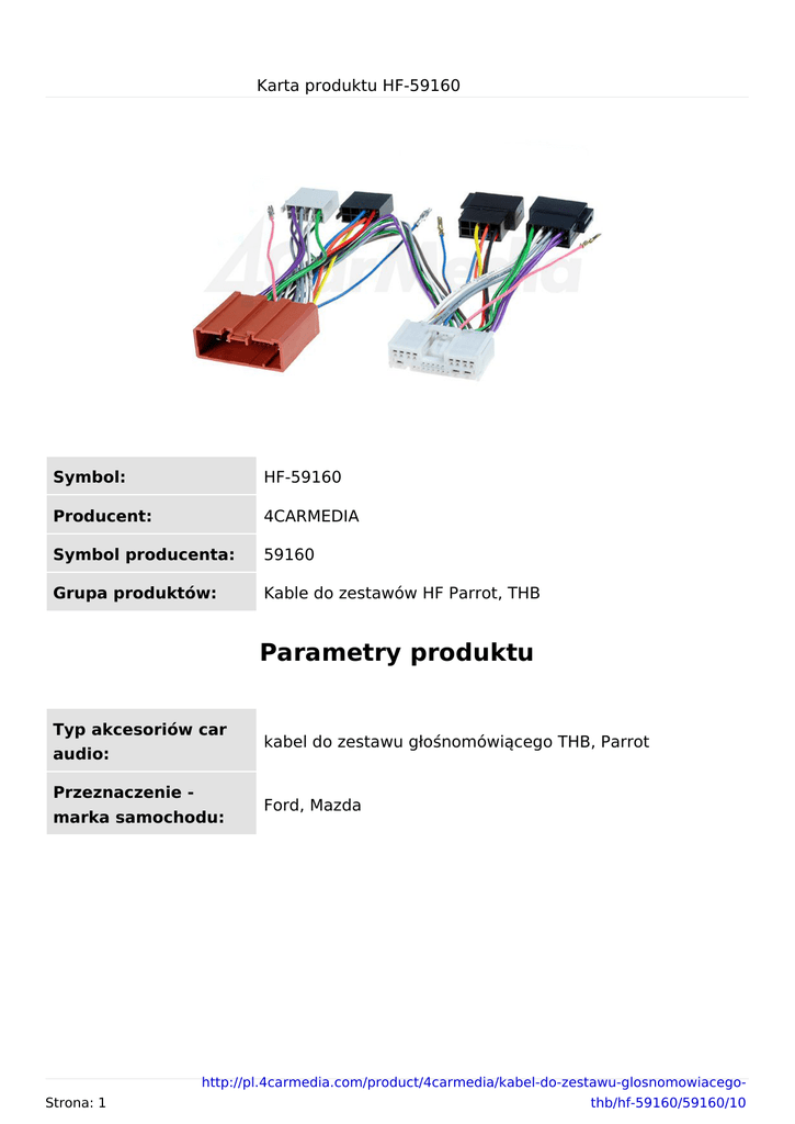 Karta produktu HF-59160 Symbol: HF-59160 Producent: 4CARMEDIA Symbol producenta: 59160 Grupa produktów: Kable do zestawów HF Parrot, THB Parametry produktu Typ akcesoriów car audio: Przeznaczenie marka samochodu: kabel do zestawu głośnomówiącego THB, Parrot Ford, Mazda http://pl.4carmedia.com/product/4carmedia/kabel-do-zestawu-glosnomowiacegoStrona: 1 thb/hf-59160/59160/10 Karta produktu HF-59160 Przeznaczenie - Ford Ranger 2007->, Mazda 2 2000->, Mazda 3 2003->, model samochodu: Mazda 323 2001->, Mazda 5 2005->, Mazda 6 2007->, Mazda 626 2000->, Mazda BT-50 2006->, Mazda CX-7 2006->, Mazda CX-9 2007 ->, Mazda Demio 2000->, Mazda MPV 2001->, Mazda MX-5 Miata 2001->, Mazda Millenia 2001->2003, Mazda Premacy 2001->, Mazda Protegé 2001->2005, Mazda RX-8 2003->, Mazda Tribute 2000->, Mazda Xedos 2001-> Informacje dodatkowe Masa brutto: 0,127 kg http://pl.4carmedia.com/product/4carmedia/kabel-do-zestawu-glosnomowiacegoStrona: 2 thb/hf-59160/59160/10