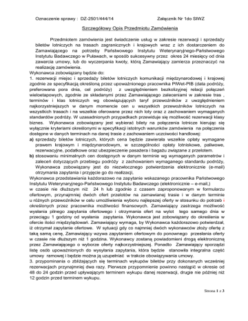 Oznaczenie sprawy : DZ-2501/444/14 Załącznik Nr 1do SIWZ Szczegółowy Opis Przedmiotu Zamówienia Przedmiotem zamówienia jest świadczenie usług w zakresie rezerwacji i sprzedaŜy biletów lotniczych na trasach zagranicznych i krajowych wraz z ich dostarczeniem do Zamawiającego na potrzeby Państwowego Instytutu Weterynaryjnego-Państwowego Instytutu Badawczego w Puławach, w sposób sukcesywny przez okres 24 miesięcy od dnia zawarcia umowy, lub do wyczerpania kwoty, którą Zamawiający zamierza przeznaczyć na realizację zamówienia. Wykonawca zobowiązany będzie do: 1. rezerwacji miejsc i sprzedaŜy biletów lotniczych komunikacji międzynarodowej i krajowej zgodnie ze specyfikacją określoną przez upowaŜnionego pracownika PIWet-PIB (data podróŜy, preferowana pora dnia, cel podróŜy) z uwzględnieniem bezkolizyjnej relacji połączeń wieloetapowych, zgodnie ze składanymi przez Zamawiającego zaleceniami w zakresie tras , terminów i klas lotniczych wg obowiązujących taryf przewoźników z uwzględnieniem najkorzystniejszych w danym momencie cen u wszystkich przewoźników lotniczych na wszystkich trasach i na wszelkie oferowane przez nich loty oraz z zachowaniem wymaganych standardów podróŜy. W uzasadnionych przypadkach przewiduje się moŜliwość rezerwacji klasy biznes. Wykonawca zobowiązany jest wybierać bilety na połączenia lotnicze kierując się wyłącznie kryteriami określonymi w specyfikacji istotnych warunków zamówienia na połączenia dostępne w danych terminach na danej trasie z zachowaniem uczciwości handlowej: a) sprzedaŜy biletów lotniczych, których cena będzie zawierała wszelkie opłaty wymagane prawem krajowym i międzynarodowym, w szczególności opłaty lotniskowe, paliwowe, rezerwacyjne, podatkowe oraz ubezpieczenie pasaŜera i bagaŜu związane z przelotem. b) stosowaniu minimalnych cen dostępnych w danym terminie wg wymaganych parametrów i zaleceń dotyczących przebiegu podróŜy z zachowaniem wymaganego standardu podróŜy, Wykonawca zobowiązany jest do niezwłocznego potwierdzenia elektronicznie (e-mail) otrzymania zapytania i przyjęcie go do realizacji, Wykonawca przedstawiania kaŜdorazowo na zapytanie wskazanego pracownika Państwowego Instytutu Weterynaryjnego-Państwowego Instytutu Badawczego (elektronicznie – e-mail,) w czasie nie dłuŜszym niŜ 24 h lub zgodnie z czasem zaproponowanym w formularzu ofertowym, przynajmniej dwóch ofert przelotów na zamawianej trasie i w danym terminie u róŜnych przewoźników w celu umoŜliwienia wyboru najlepszej oferty w stosunku do potrzeb i określonych przez pracownika moŜliwości finansowych. Zamawiający zastrzega moŜliwość wysłania pilnego zapytania ofertowego i otrzymania ofert na wylot tego samego dnia w przeciągu 1 godziny od wysłania zapytania. Wykonawca jest zobowiązany do określenia w ofercie ilości międzylądowań. Zamawiający wymaga, by Wykonawca kaŜdorazowo potwierdzał, iŜ otrzymał zapytanie ofertowe. W sytuacji gdy co najmniej dwóch wykonawców złoŜy ofertę z taką samą cenę, Zamawiający wzywa zapytaniem ofertowym do ponownego przesłania oferty w czasie nie dłuŜszym niŜ 1 godzina. Wykonawcy zostaną powiadomieni drogą elektroniczną przez Zamawiającego o wyborze oferty najkorzystniejszej. Ponadto Zamawiający sporządzi listę osób upowaŜnionych do wysyłania zapytania, która będzie stanowiła integralna część umowy ramowej i będzie moŜna ją uzupełniać w trakcie obowiązywania umowy. 3. przypominania o zbliŜających się terminach wykupów biletów przy dokonanych wcześniej rezerwacjach przynajmniej dwa razy. Pierwsze przypomnienie powinno nastąpić w okresie od 48 do 24 godzin przed upływającym terminem wykupu danej rezerwacji, drugie nie później niŜ 12 godzin przed terminem wykupu. Strona 1 z 3 4. zagwarantowania utrzymania wybranej przez pracownika Państwowego Instytutu Weterynaryjnego-Państwowego Instytutu Badawczego rezerwacji (taryfy i oferty biletowej) pod względem trasy i ceny do czasu, kiedy osoba upowaŜniona zatwierdzi Wykonawcy realizację usługi dla pasaŜera. a) Lista osób upowaŜnionych ze strony Zamawiającego do zatwierdzania realizacji usług będzie podana przy zawarciu umowy i będzie moŜna ja uzupełniać w trakcie trwania umowy ; 5. bezpłatnego dostarczania na koszt i ryzyko Wykonawcy biletów lotniczych i faktur do miejsca wskazanego przez Zamawiającego; 6. niezwłocznego informowania Zamawiającego o braku moŜliwości realizacji rezerwacji lub sprzedaŜy biletów, jeśli taka sytuacja będzie miała miejsce, wraz z uzasadnieniem; ponadto kaŜdorazowo na Ŝądanie Zamawiającego wykonawca poda informacje o tym, jak przesunięcie terminu wyjazdu wpłynie na cenę biletu lotniczego, w razie uzyskanej przez Zamawiającego niezaleŜnej informacji o dostępności na rynku biletu tańszego niŜ zaproponowany przez wykonawcę, Zamawiający ma prawo Ŝądać wystawienia tańszego biletu. 7. zapewnienia Zamawiającemu lotów zastępczych w sytuacji gdy nastąpi opóźnienie lotu, równieŜ w przypadku lotów wieloetapowych (planowane międzylądowanie) – w celu zapewnienia płynności podróŜy docelowej w wyznaczonym terminie lub na wniosek podróŜującego zapewnienie powrotu do wskazanego przez niego lotniska. 8. zapewnienia Zamawiającemu moŜliwości dokonywania zmian w biletach w zakresie danych pasaŜera, terminu przelotu lub trasy biletu zgodnie z warunkami taryfowymi przewoźnika. KaŜda zmiana wymaga zgody Zamawiającego. 9. regulowania przez Wykonawcę naleŜności z tytułu zakupu biletów lotniczych oraz z tytułu wszelkich kosztów związanych z przewozem lotniczym, w tym z tytułu opłat lotniskowych ze środków własnych; 10. negocjowania z przewoźnikiem korzystnych dla Zamawiającego warunków rezygnacji z zamówionych biletów oraz zapewnienie moŜliwości bezkosztowego zwrotu biletu w dniu jego sprzedaŜy; 11. zwrotu Zamawiającemu części kosztów poniesionych pr